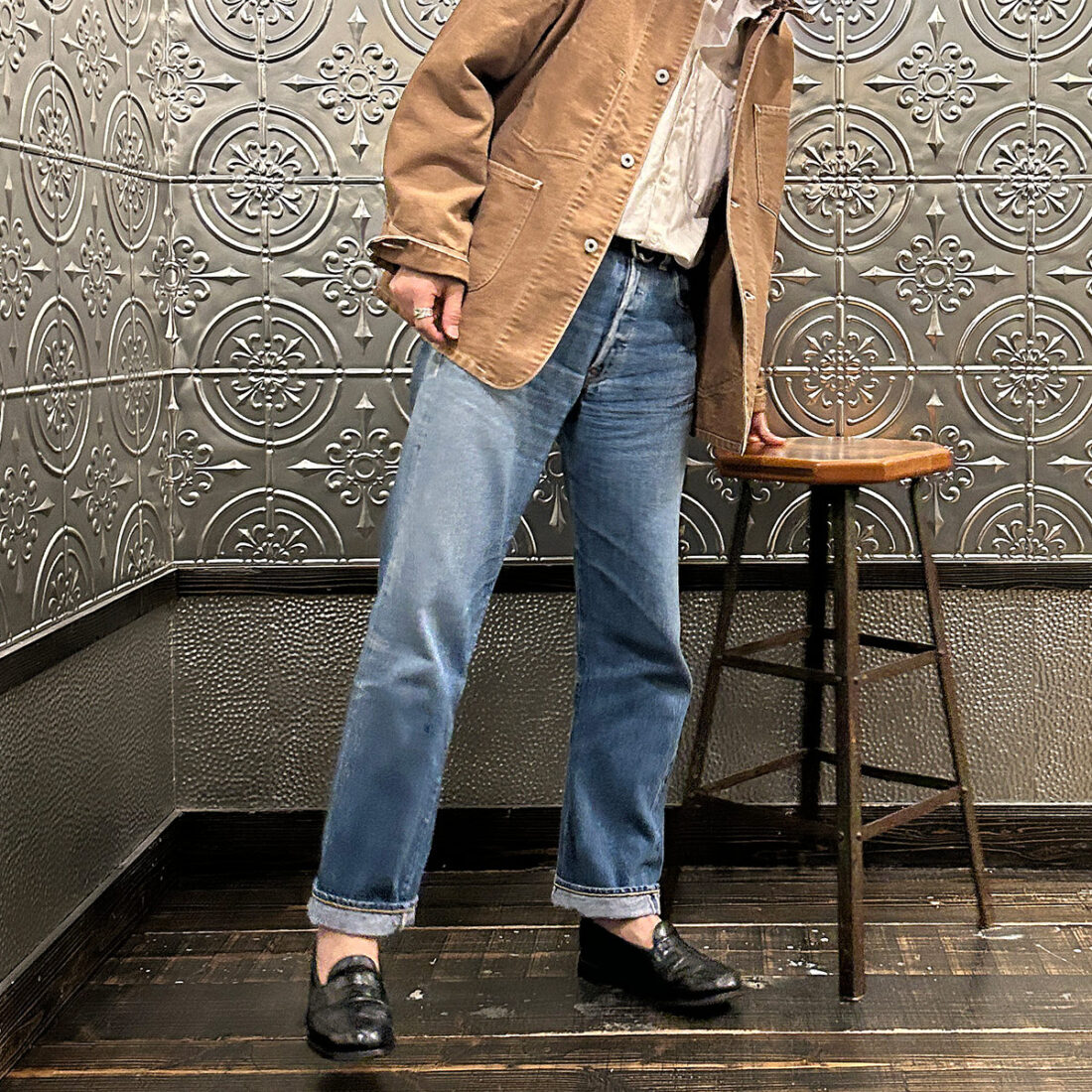 もはや「リジッドじゃないじゃん」って?この方が生地が縮んだ状態でご提案できるのでサイズを選んでいただきやすいかと思いまして。まだノリが残った状態なのでシワ感が凄いですが、洗ってノリが落ちれば柔らかくなります。