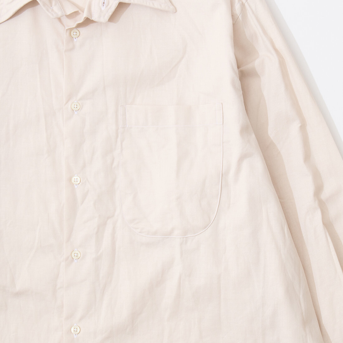 襟本体と台襟部分が繋がった仕様。この少しロングポイント気味な襟のシェイプが堪らないんですよね~。キャンプカラー(開襟)に通ずるリッラクスムード。