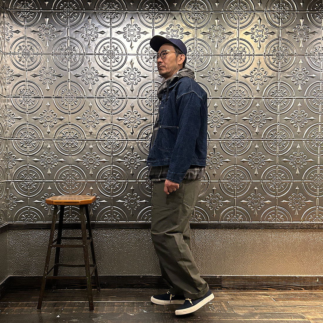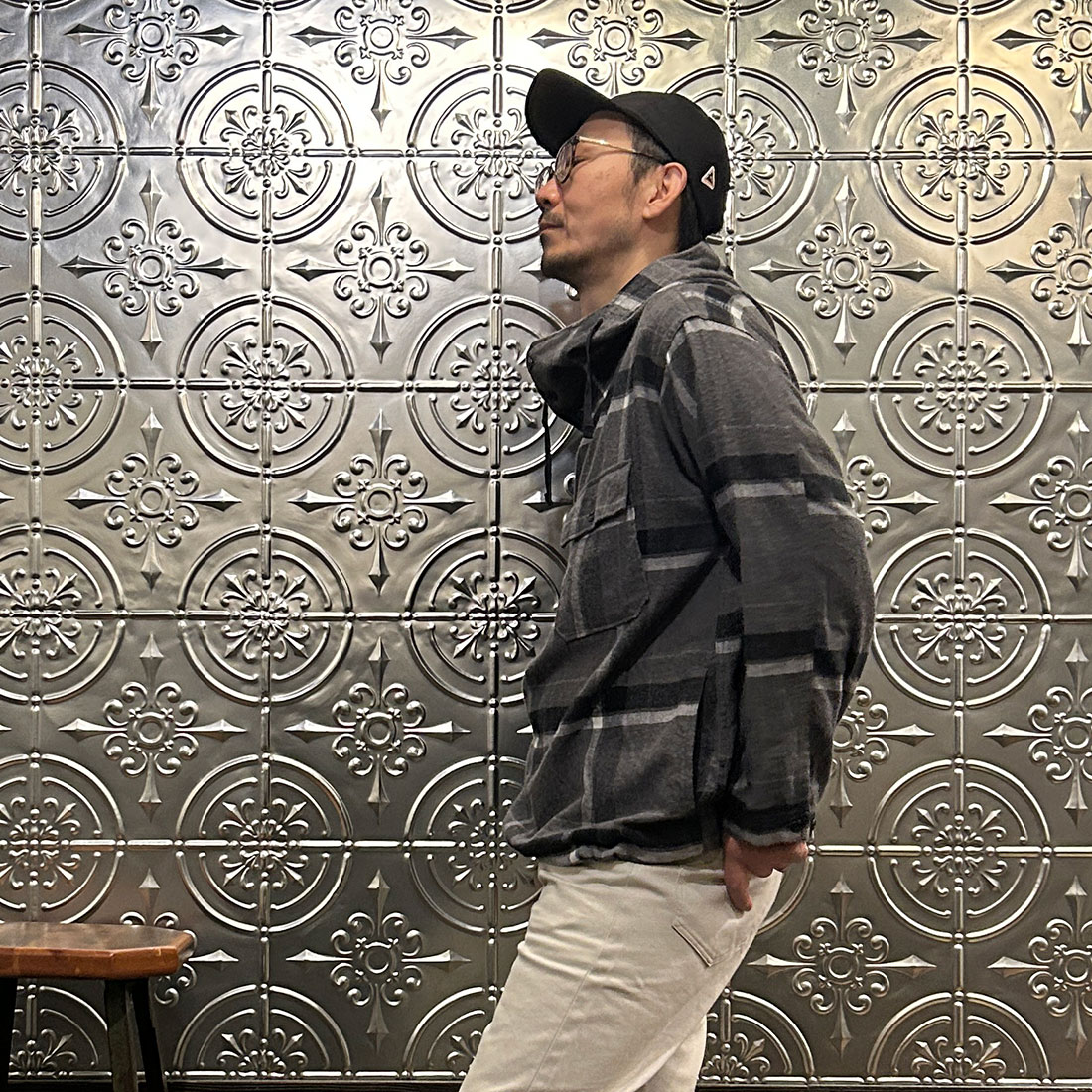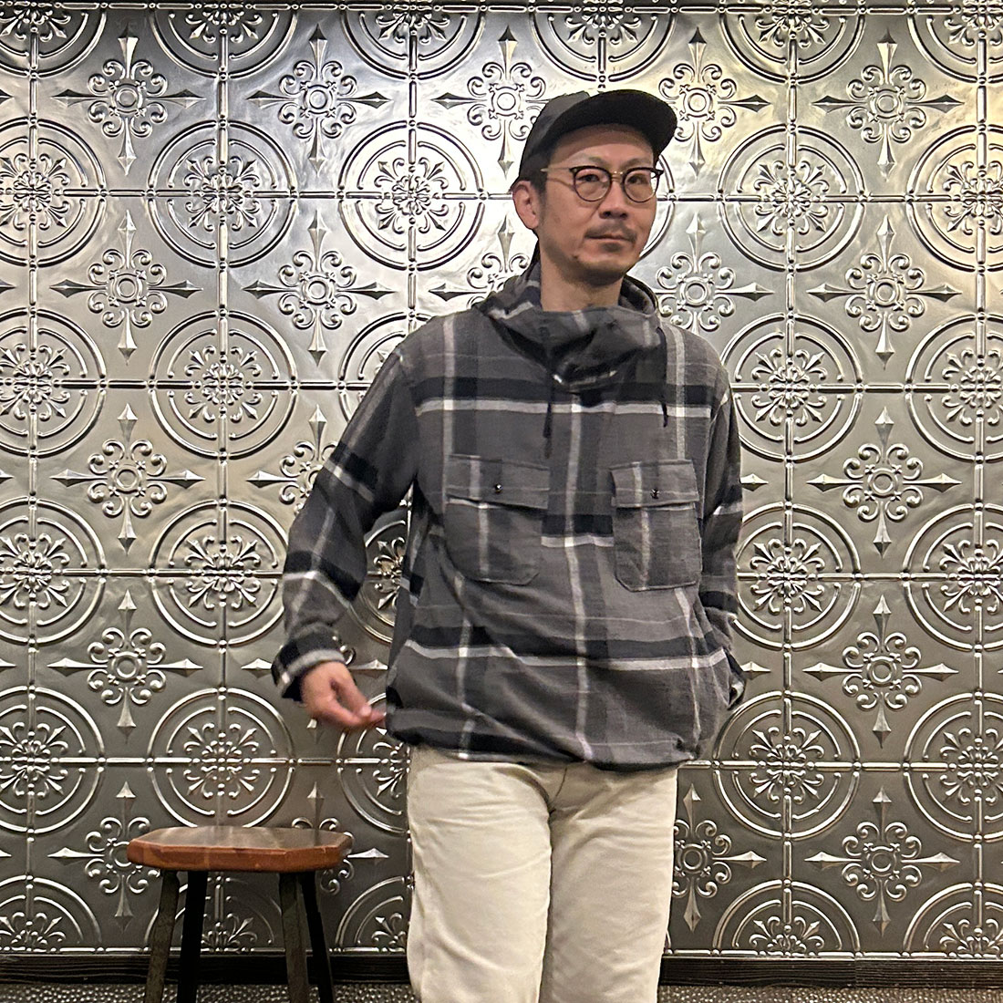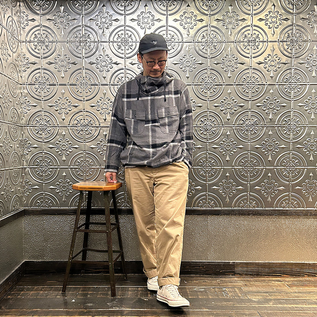 まずはワイドシルエットのチノパンツを合わせたカジュアルスタイル。上下ゆったりとしたシルエットのリラックススタイル。シンプルな組み合わせですがカグールシャツがスタイリングに雰囲気を出してくれています。