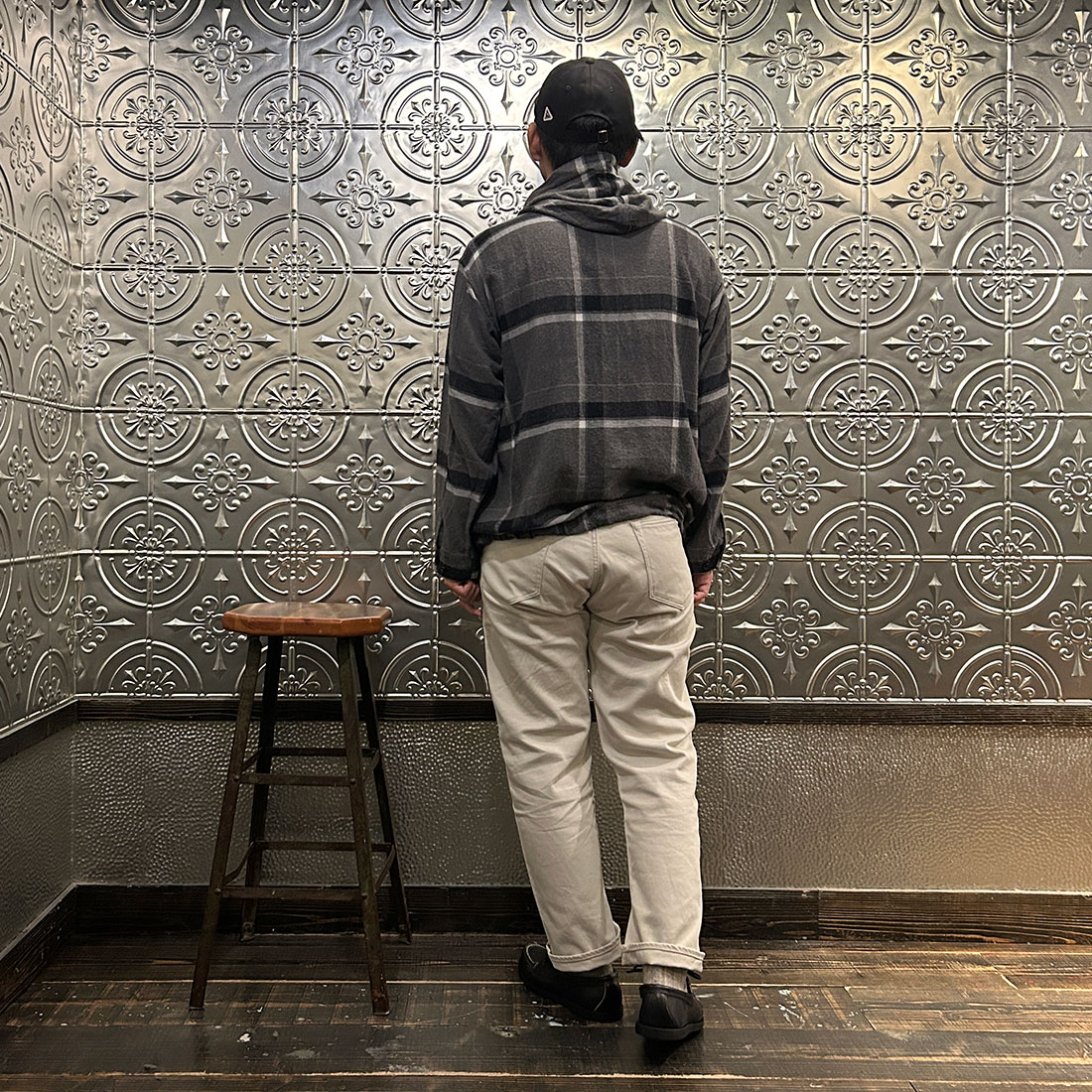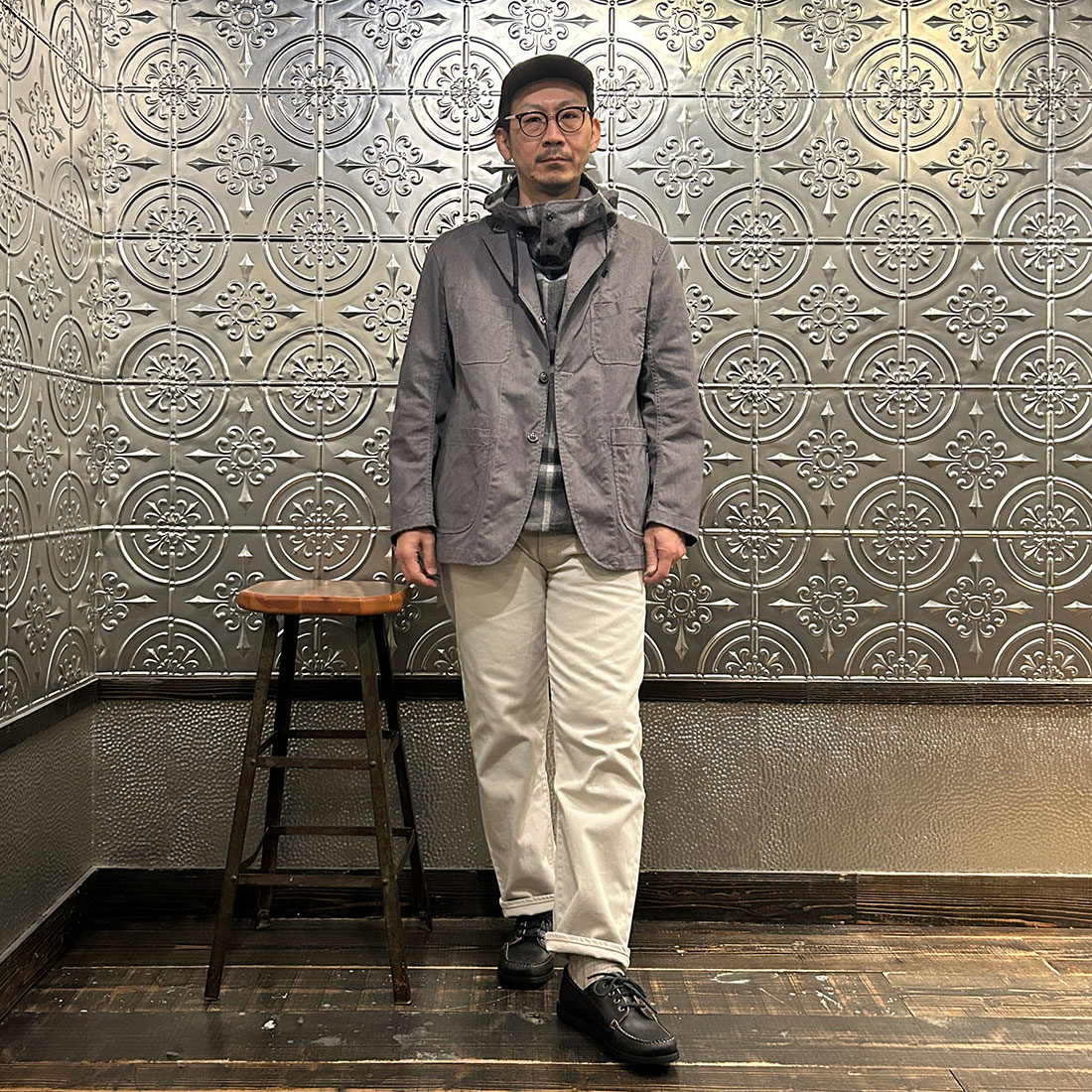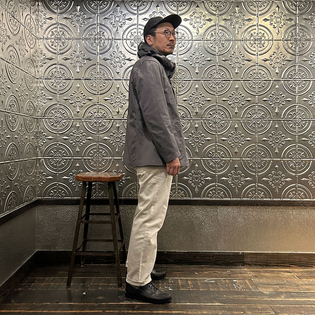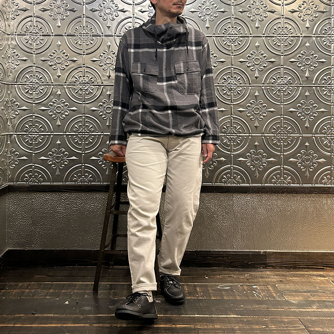 まずはワイドシルエットのチノパンツを合わせたカジュアルスタイル。上下ゆったりとしたシルエットのリラックススタイル。シンプルな組み合わせですがカグールシャツがスタイリングに雰囲気を出してくれています。