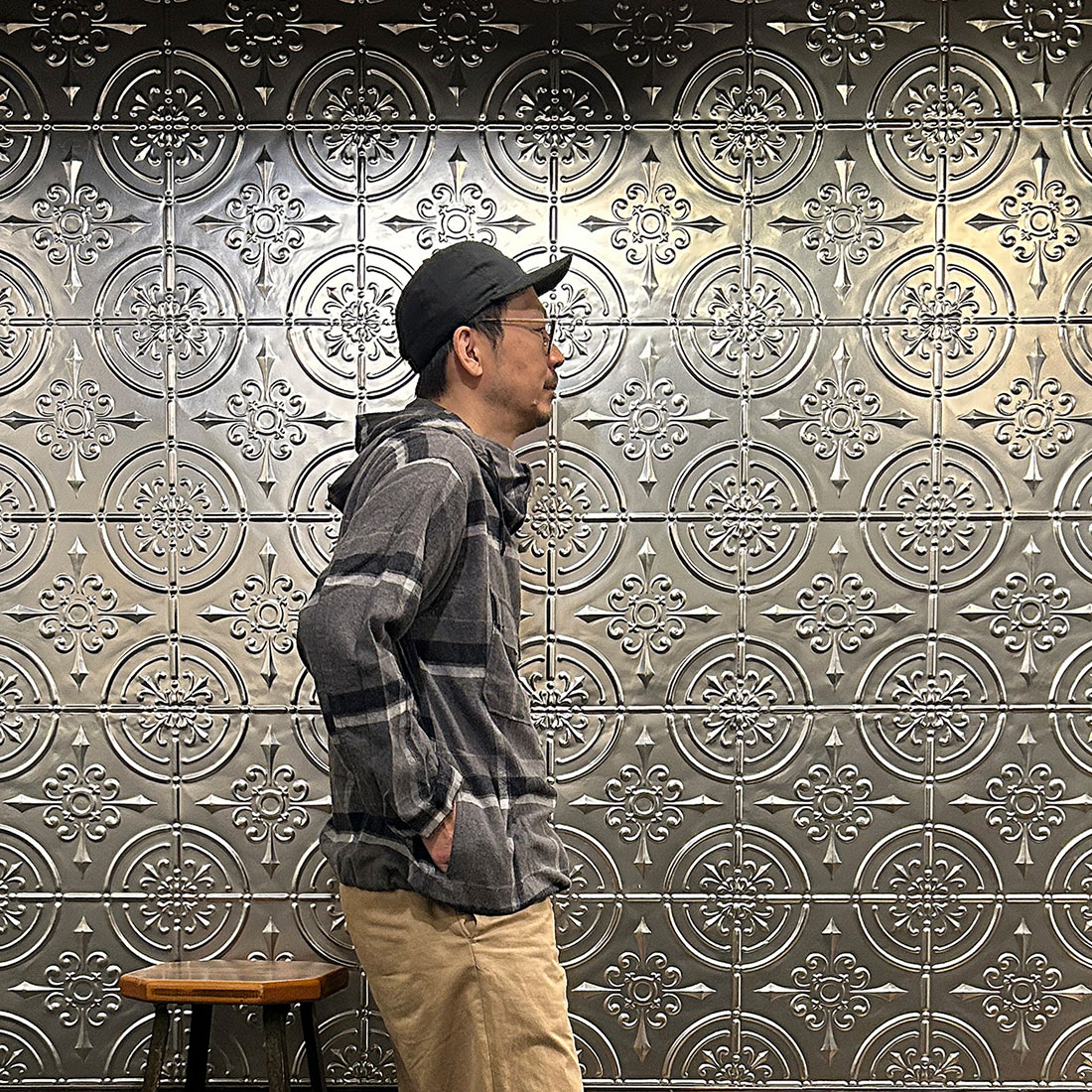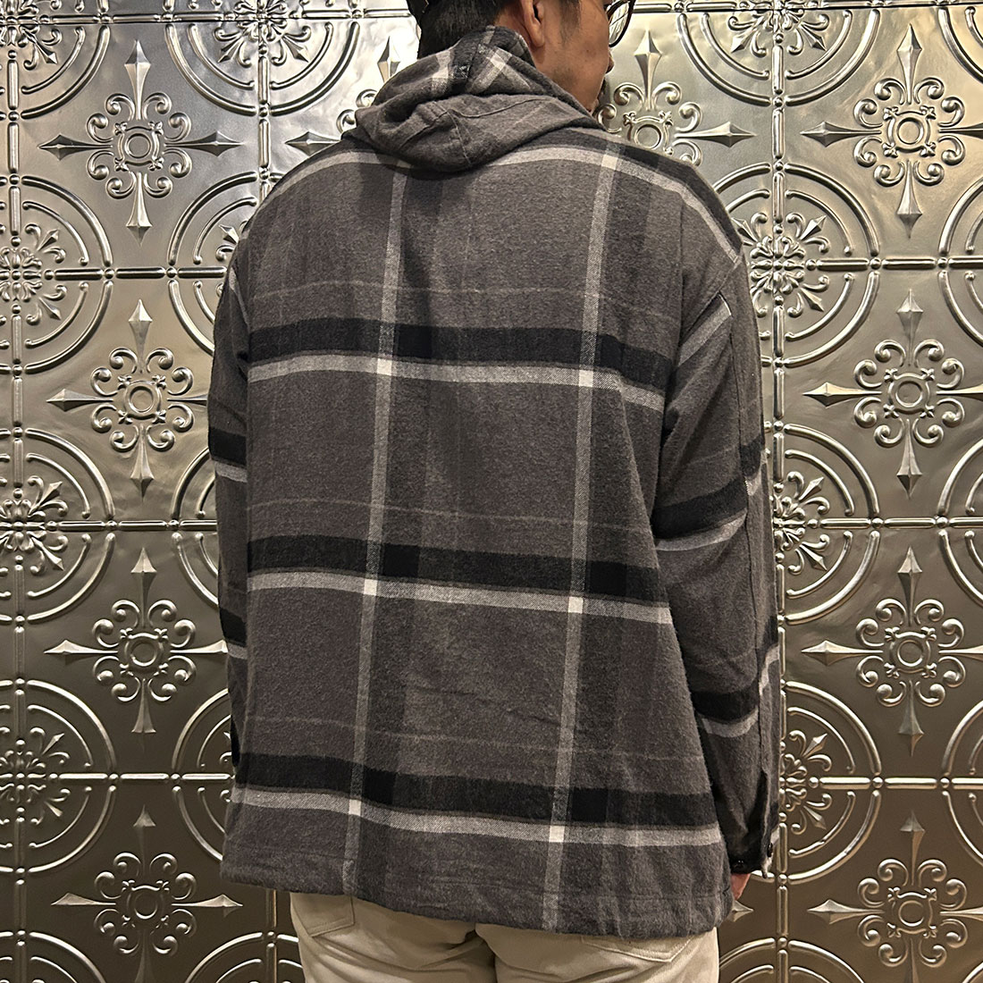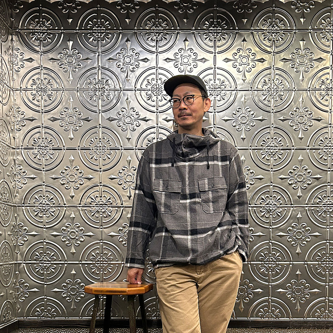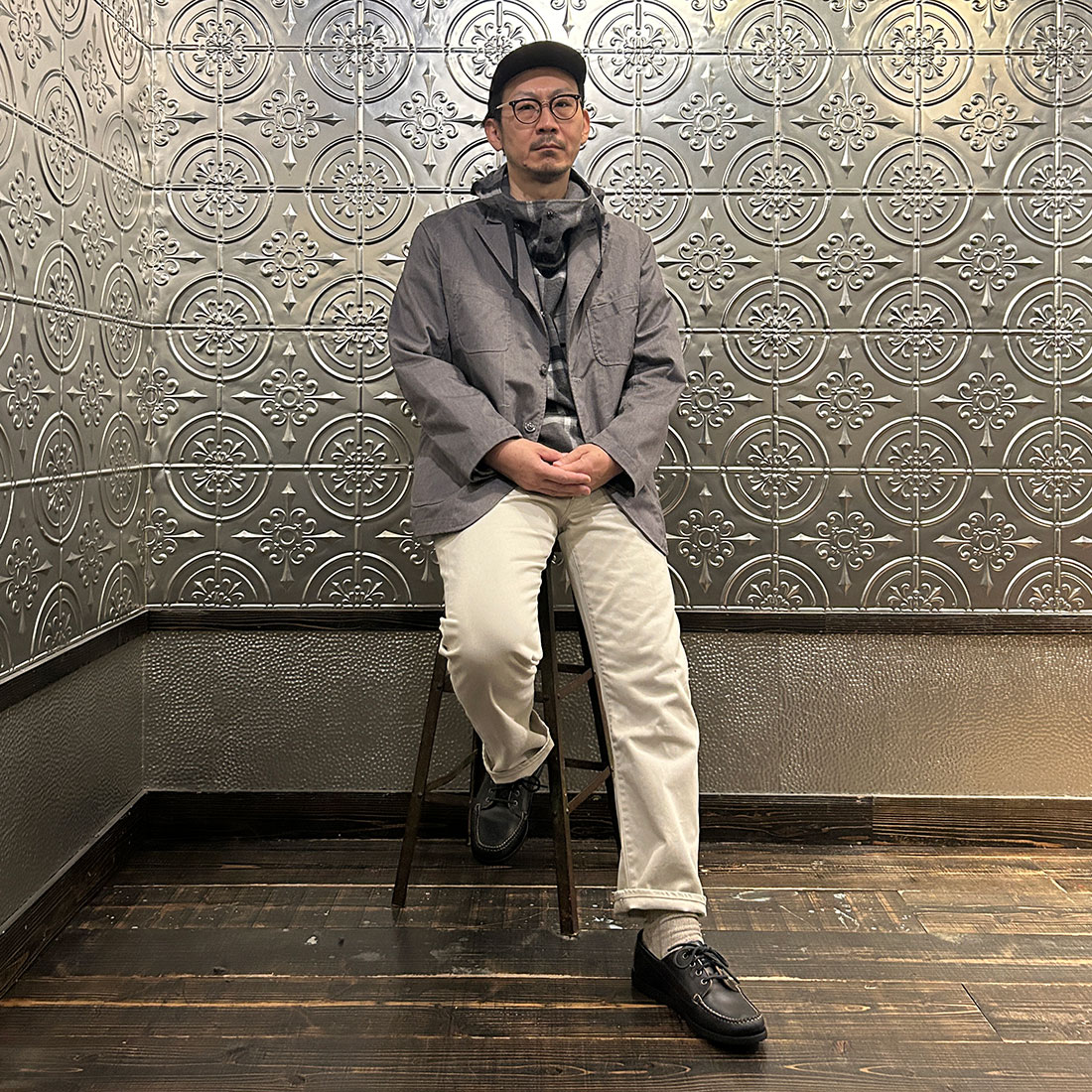 まずはワイドシルエットのチノパンツを合わせたカジュアルスタイル。上下ゆったりとしたシルエットのリラックススタイル。シンプルな組み合わせですがカグールシャツがスタイリングに雰囲気を出してくれています。