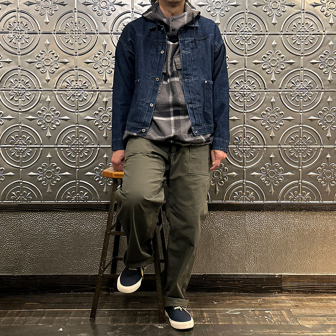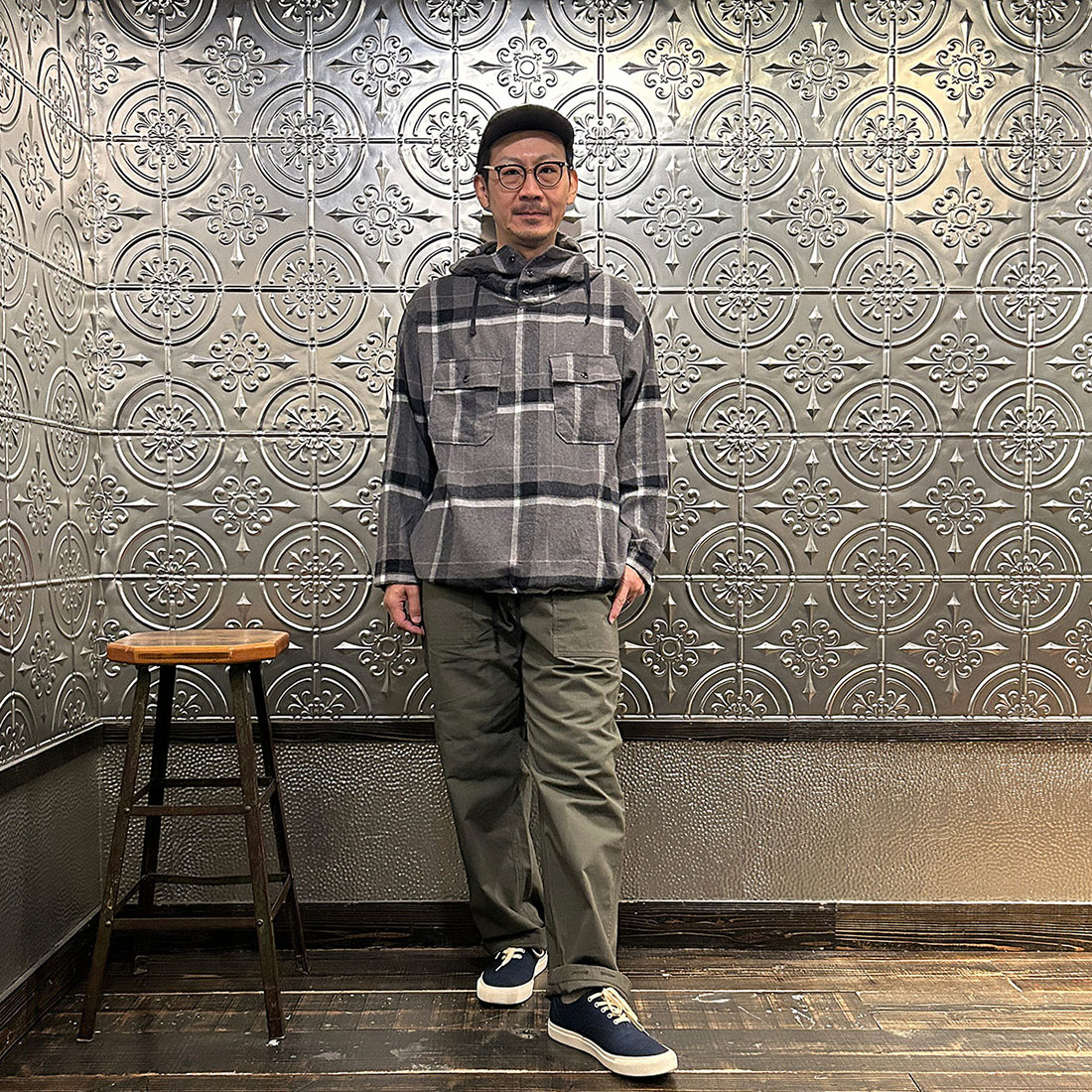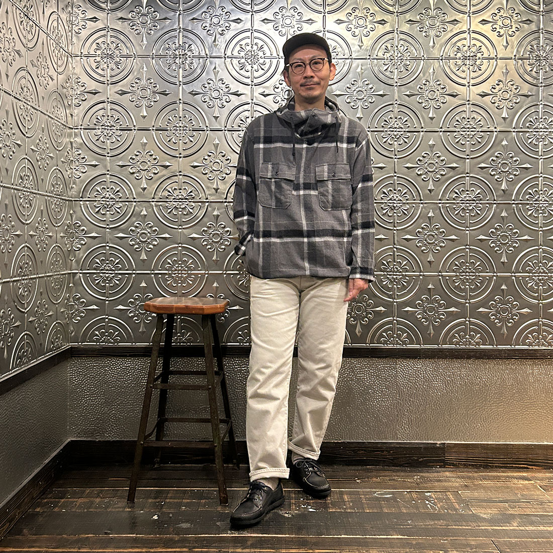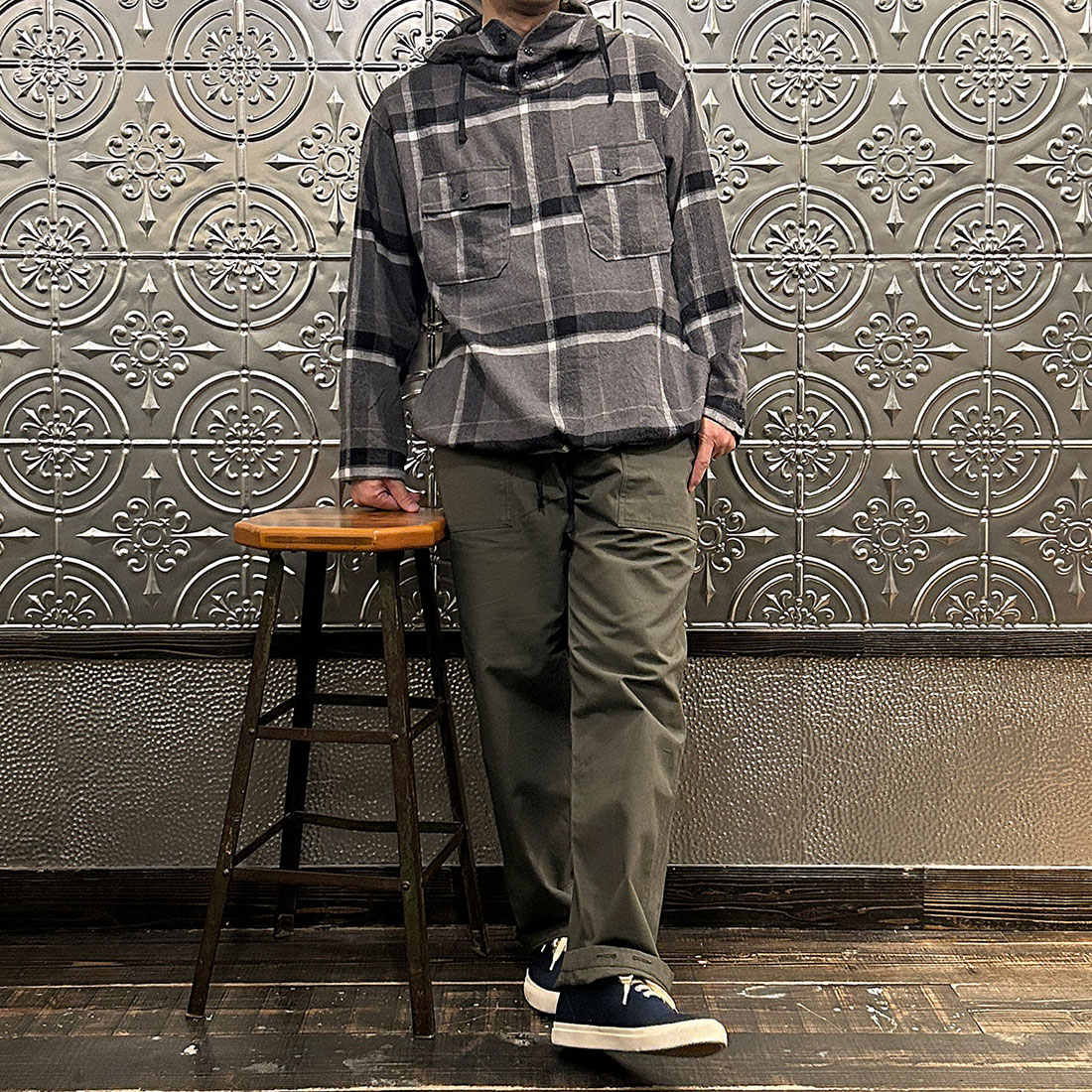 次も定番のファティーグパンツを合わせたシンプルなカジュアルスタイル。シンプルなコーディネートだからこそカグールシャツの面白みあるディテールが際立ちます。