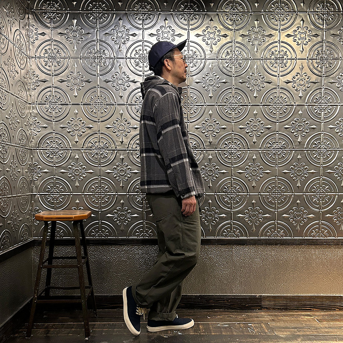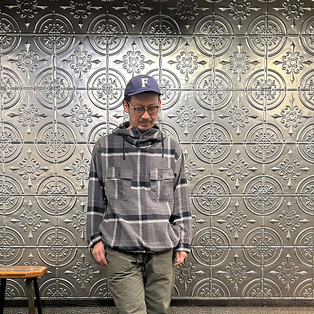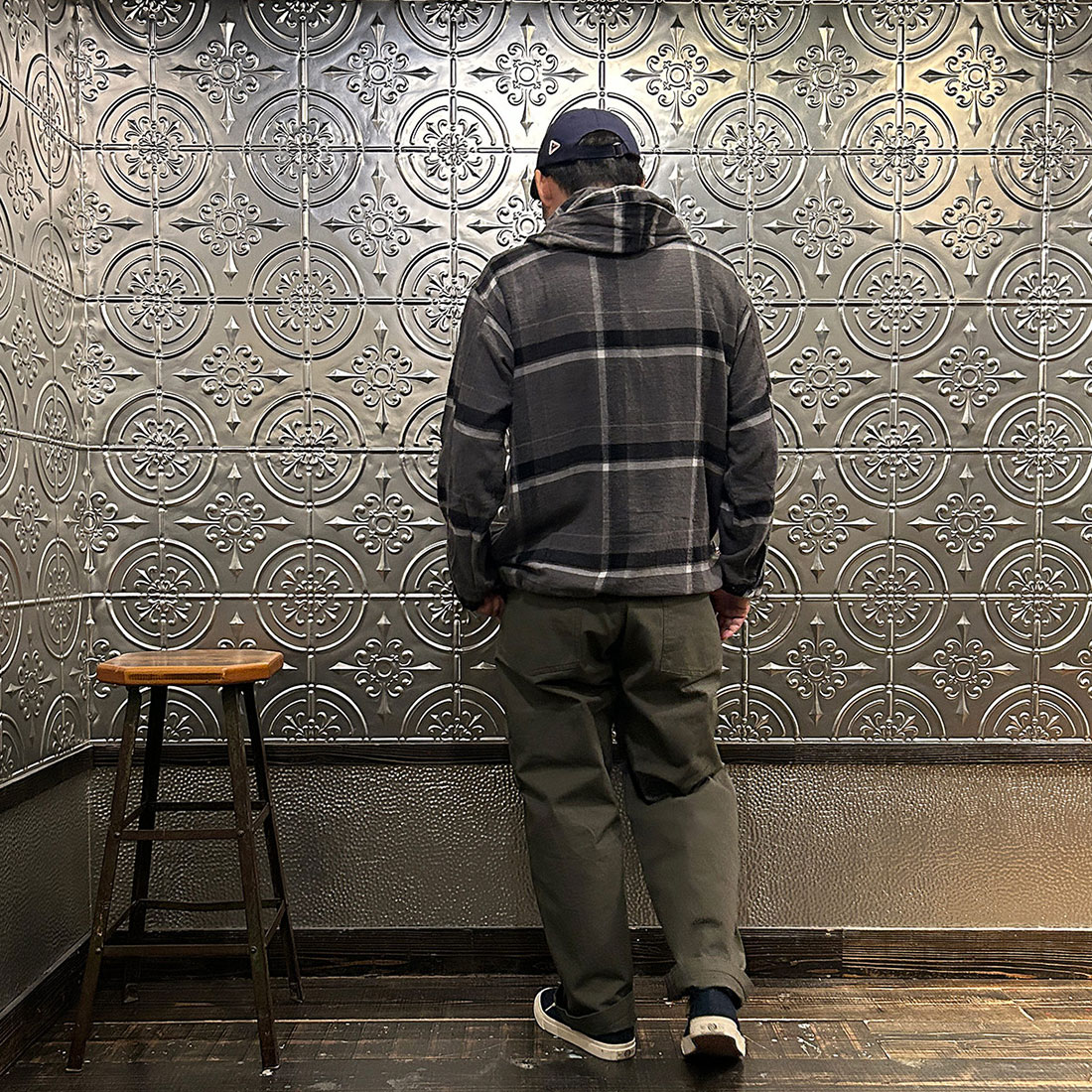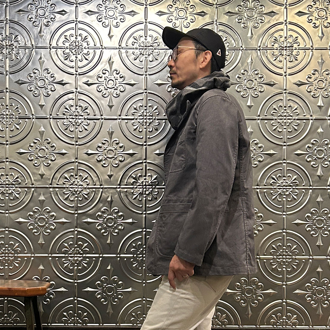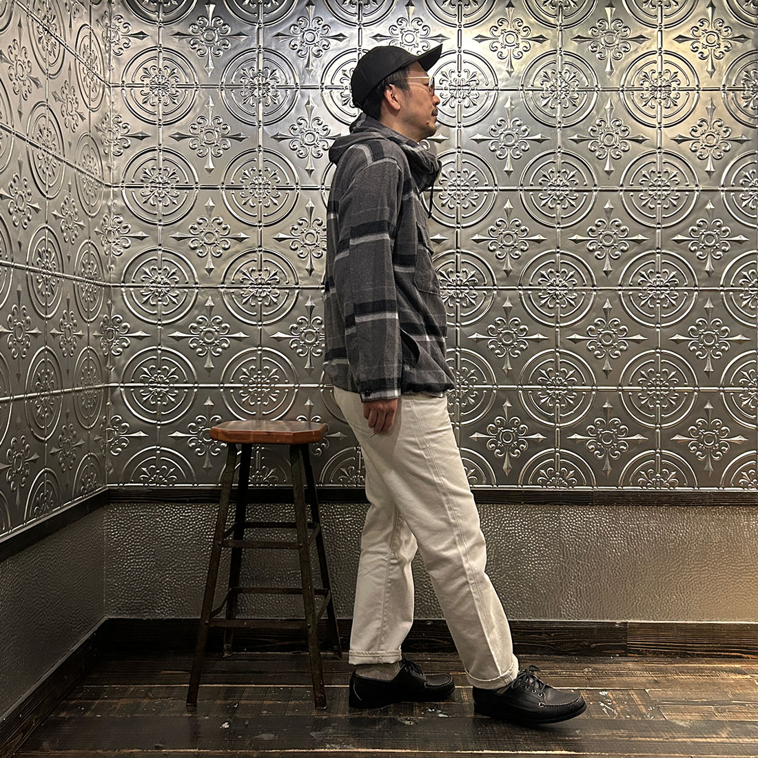 次も定番のファティーグパンツを合わせたシンプルなカジュアルスタイル。シンプルなコーディネートだからこそカグールシャツの面白みあるディテールが際立ちます。