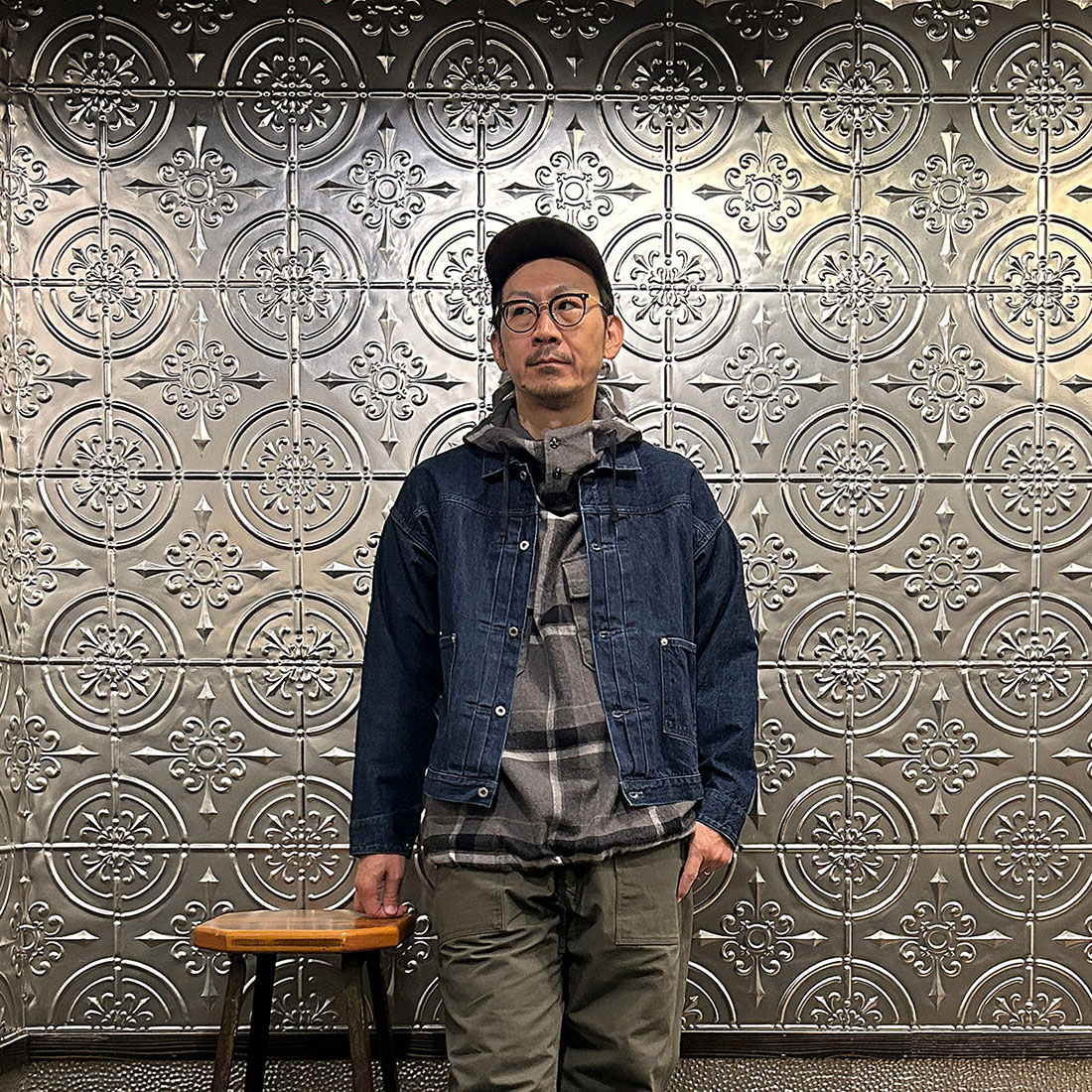 ココからはアウターを羽織ったカグールシャツをインナーとしたスタイリング。Gジャンなどのショート丈で裾だしスタイル。