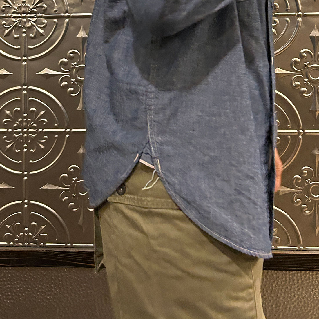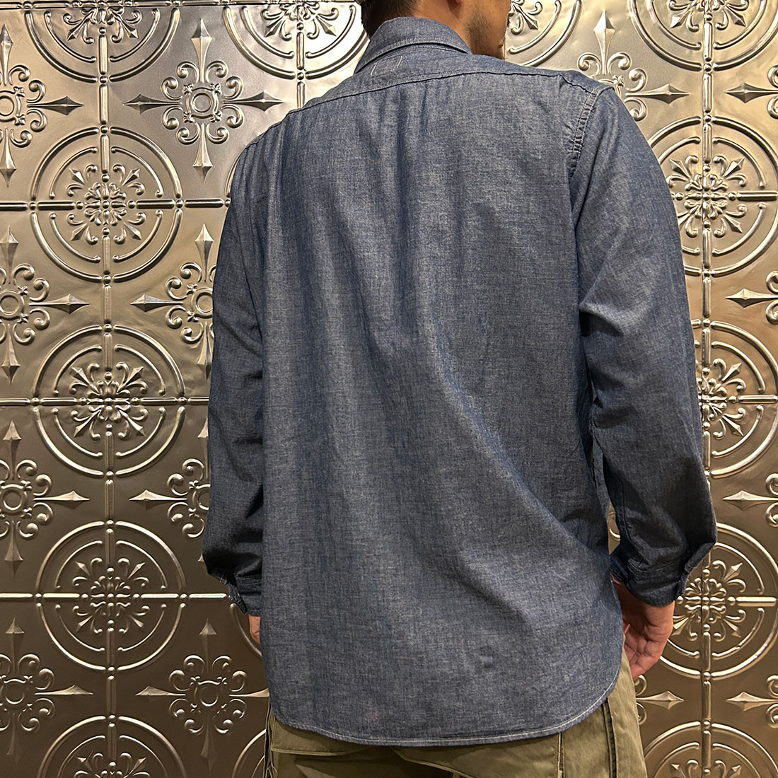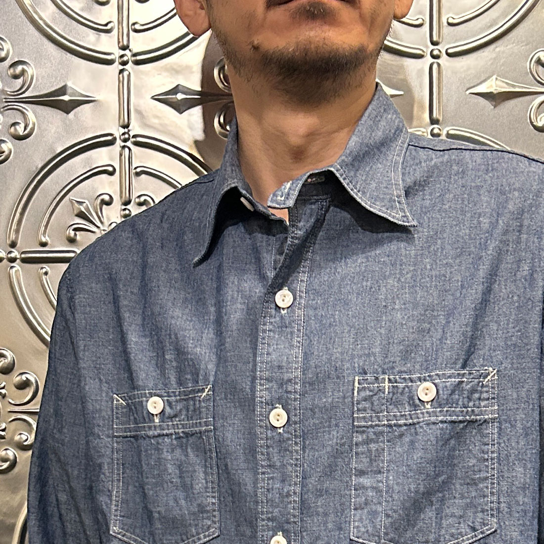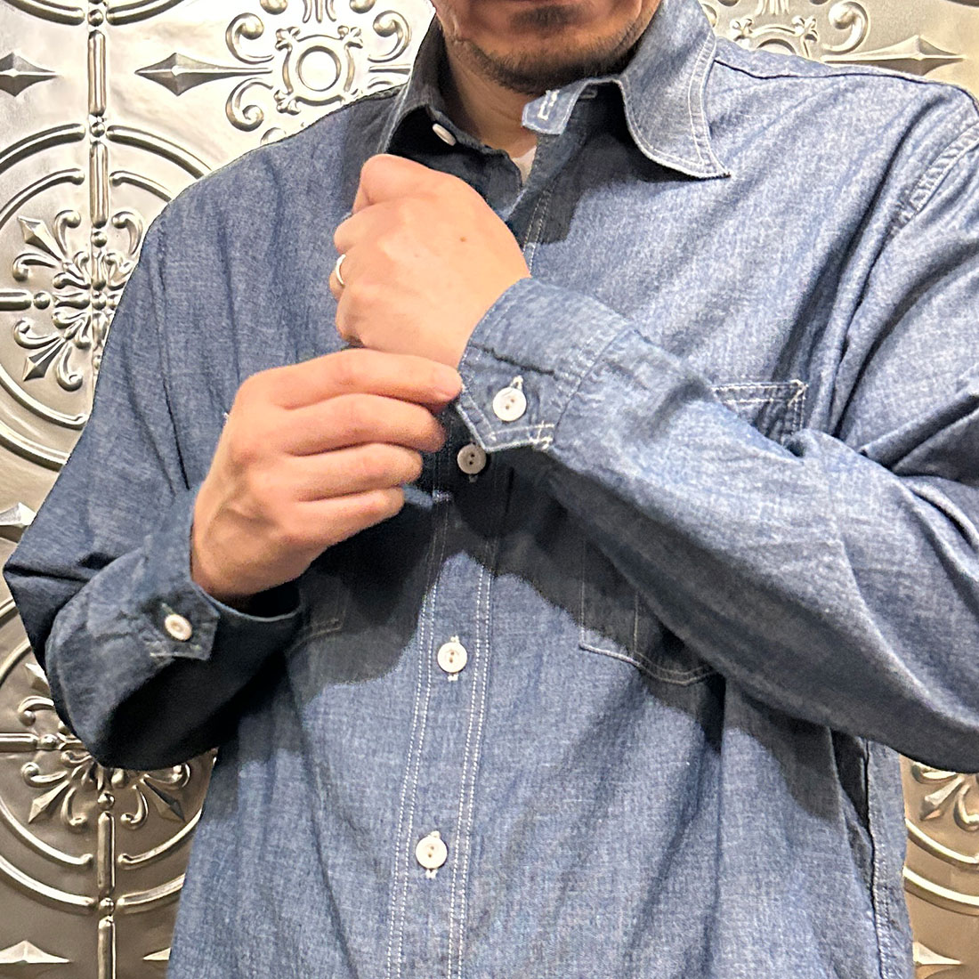 パッと見はベーシックなシャンブレーのワークシャツですがどこか雰囲気が違う。