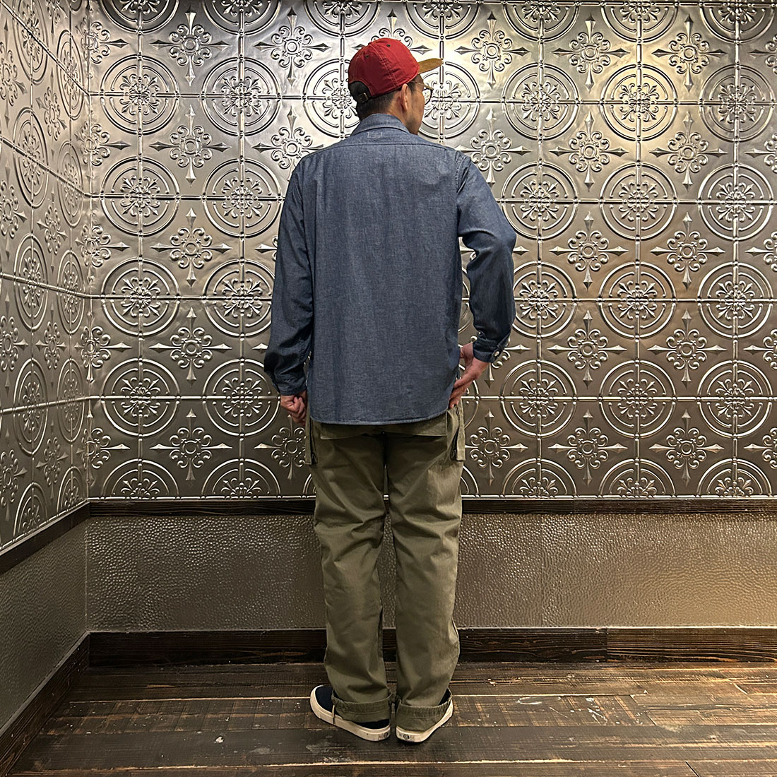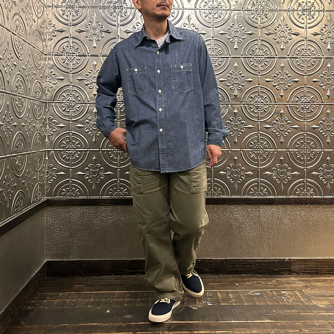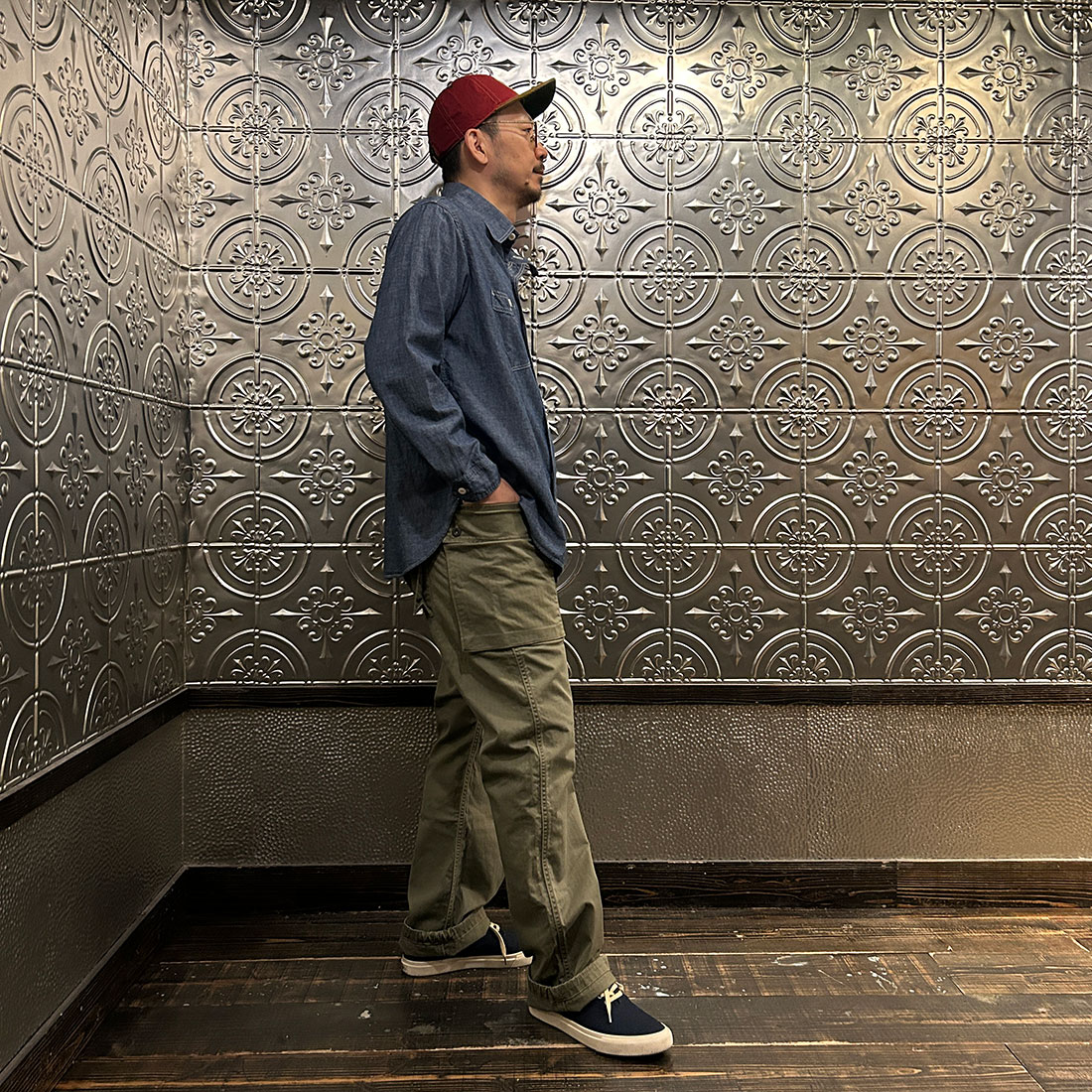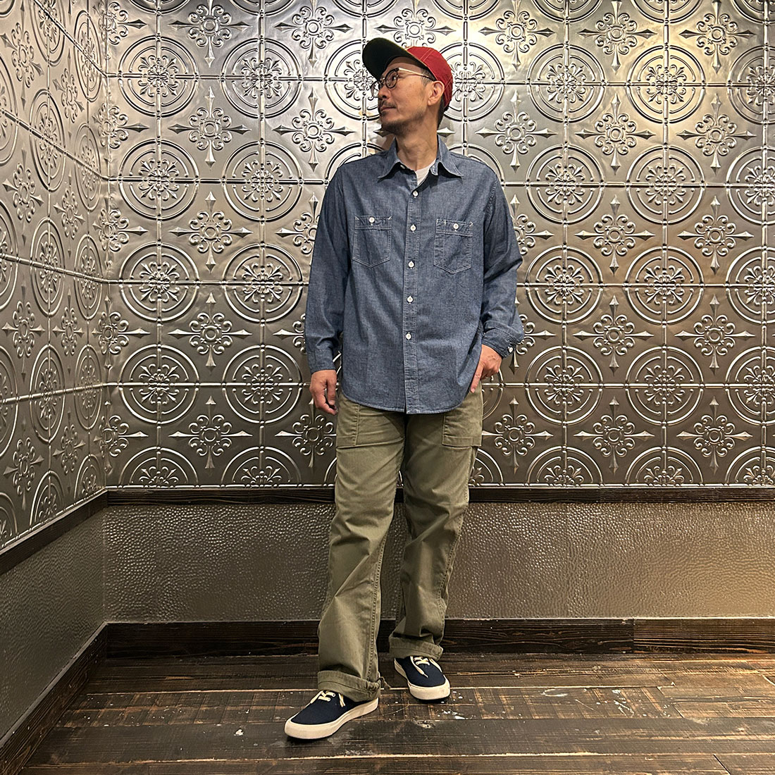 まずはP44 モンキーパンツを合わせえたワークシャツに軍パンの王道スタイル。オリーブのパンツにシャンブレーシャツは間違いのない色合わせ。