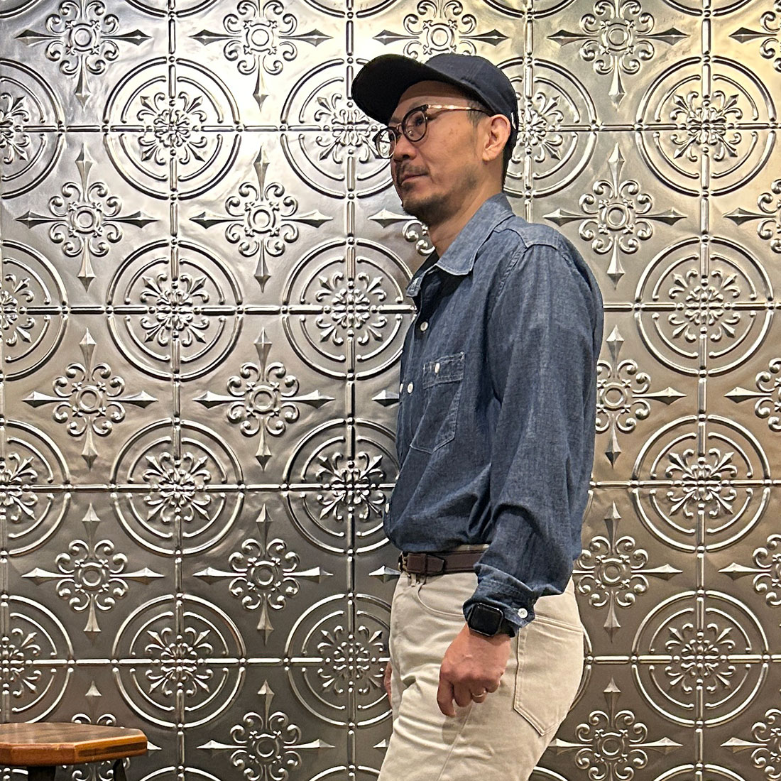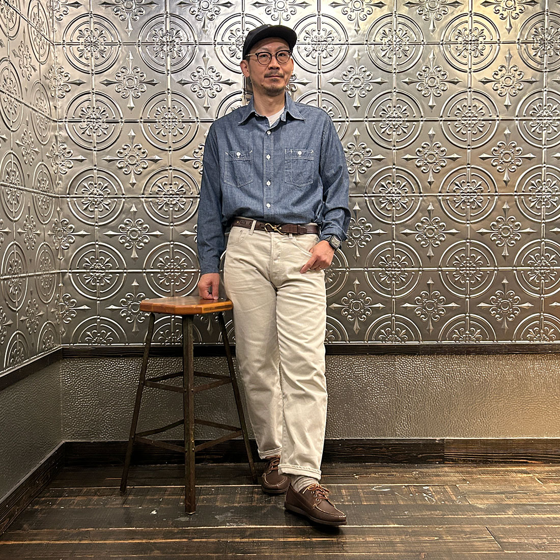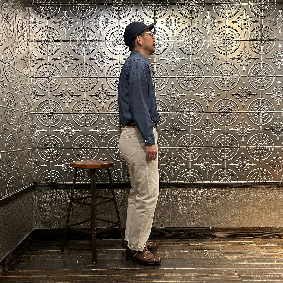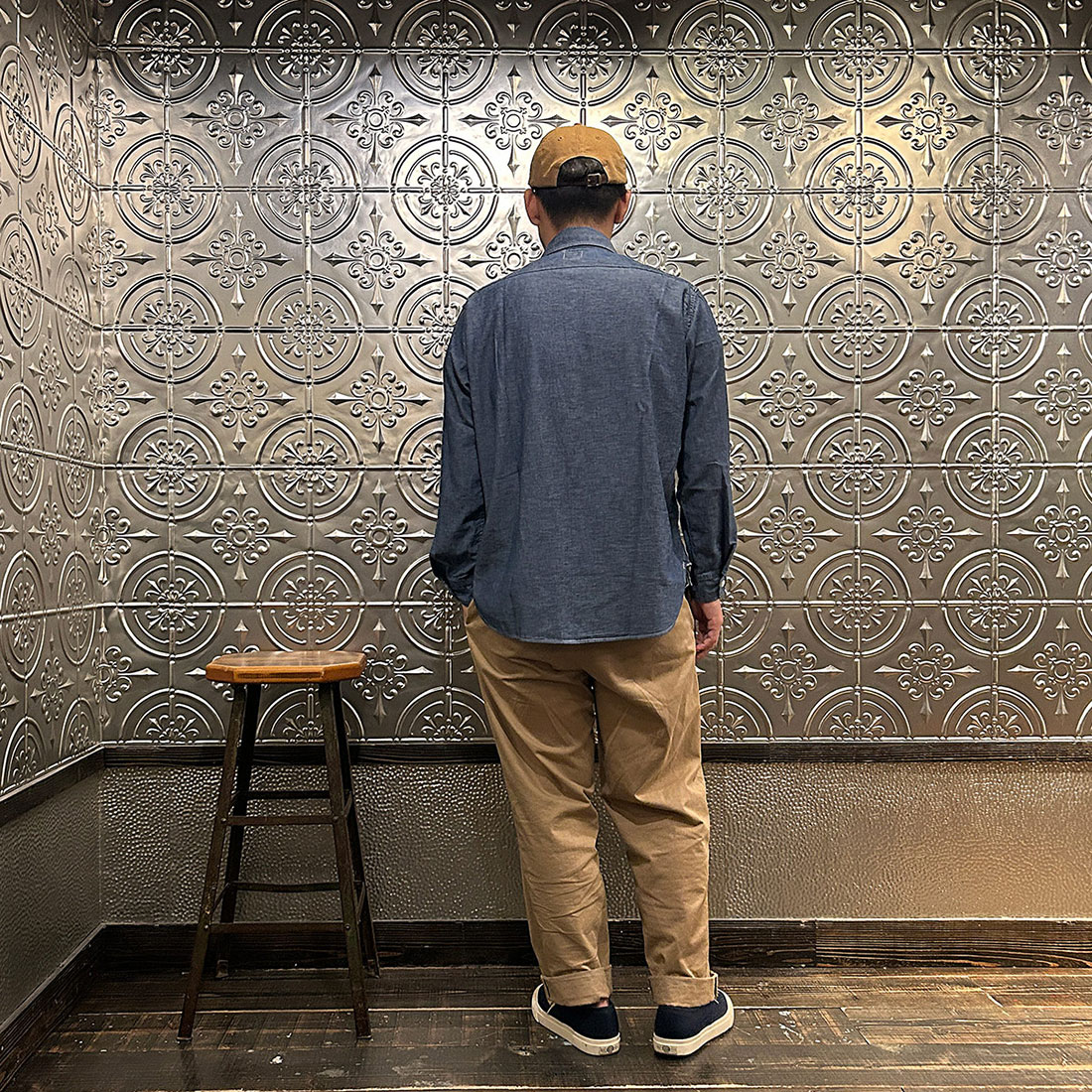 次もシャンブレー素材のワークシャツとしては王道のチノパンを合わせたスタイリング。王道のスタイリングでもどこかちょっと違いを感じます。