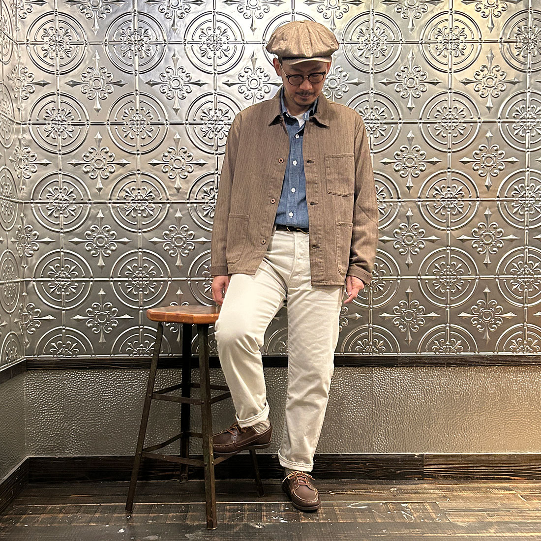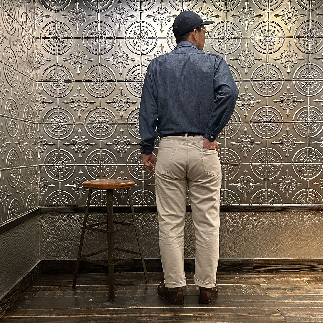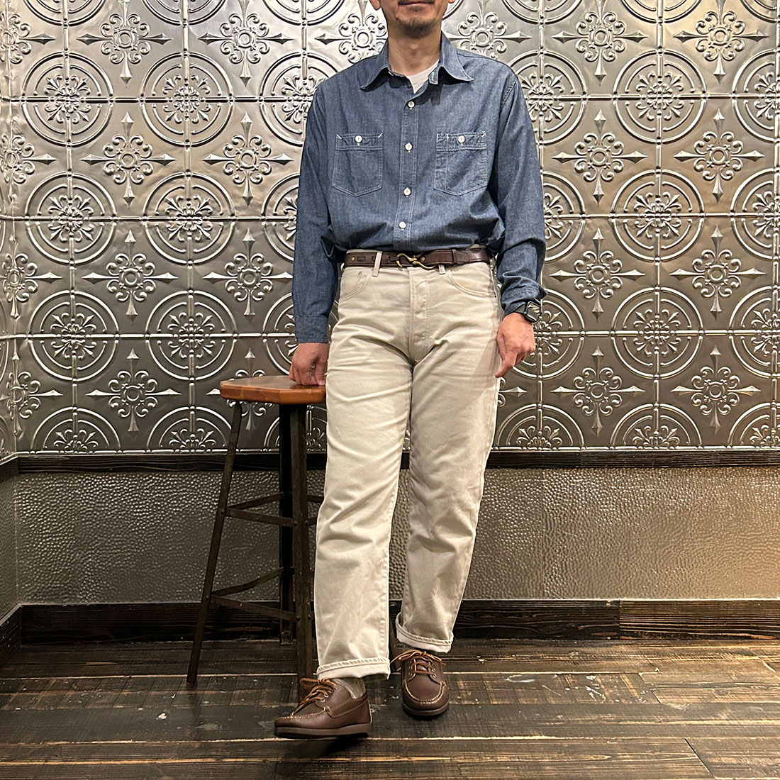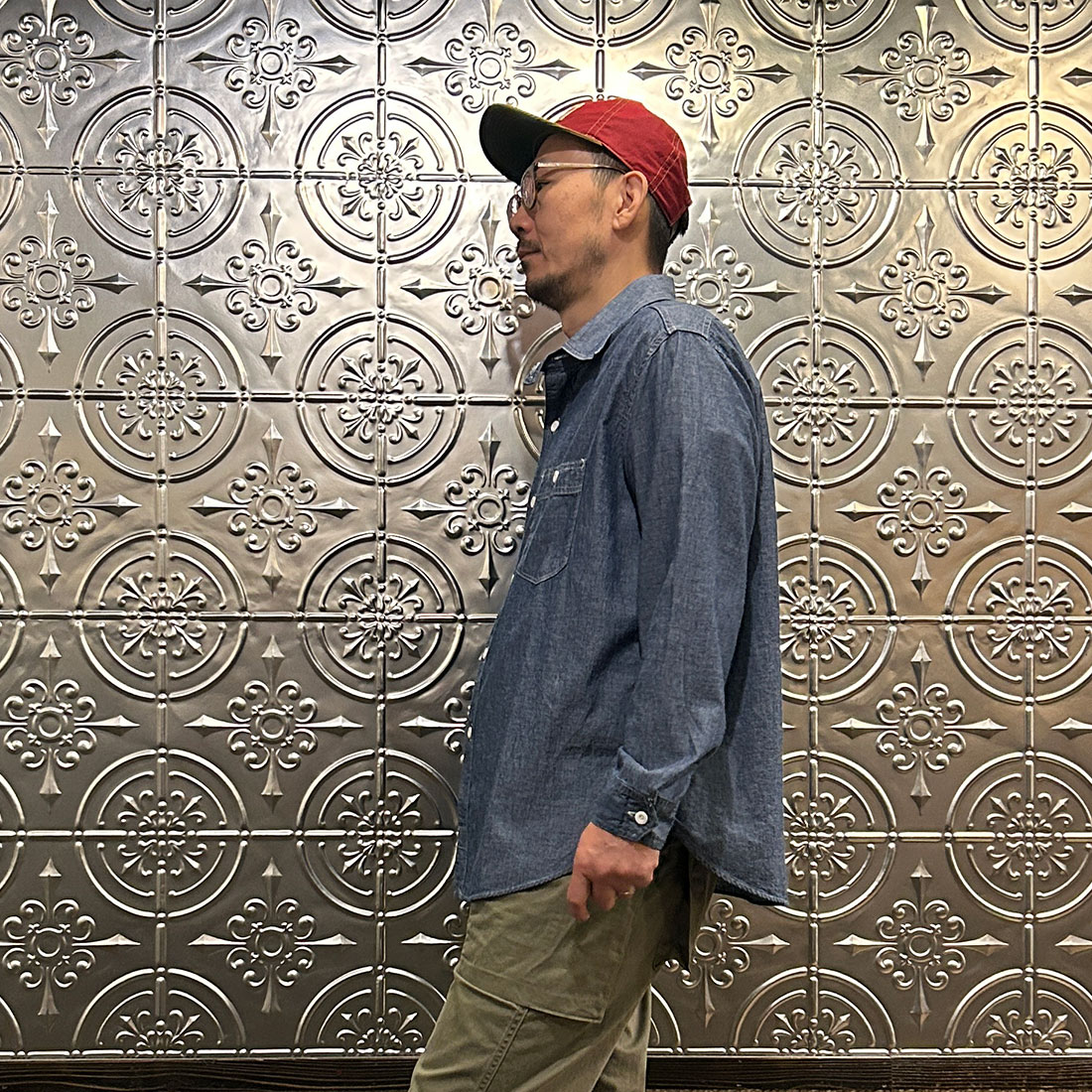 次もシャンブレー素材のワークシャツとしては王道のチノパンを合わせたスタイリング。王道のスタイリングでもどこかちょっと違いを感じます。
