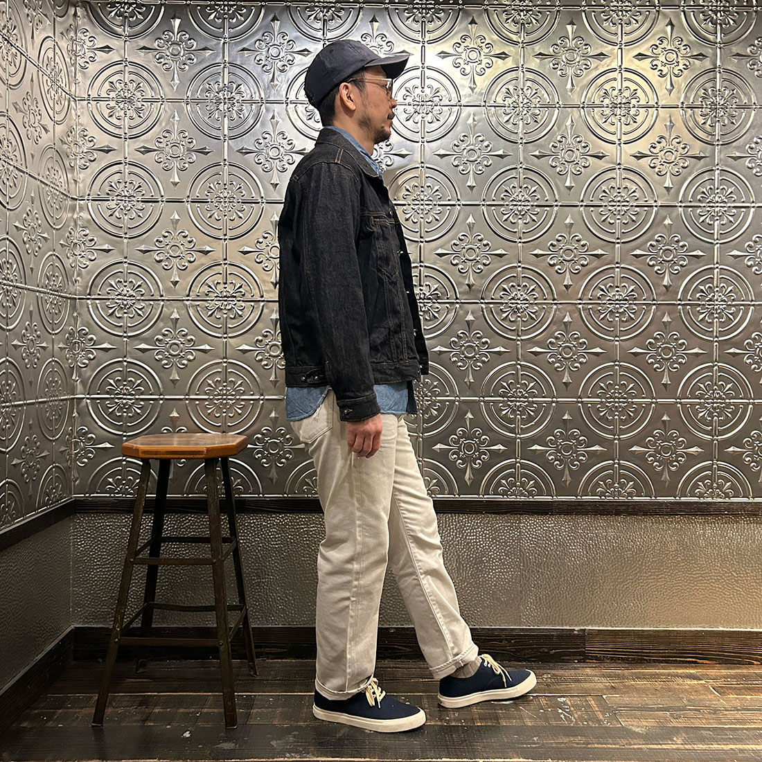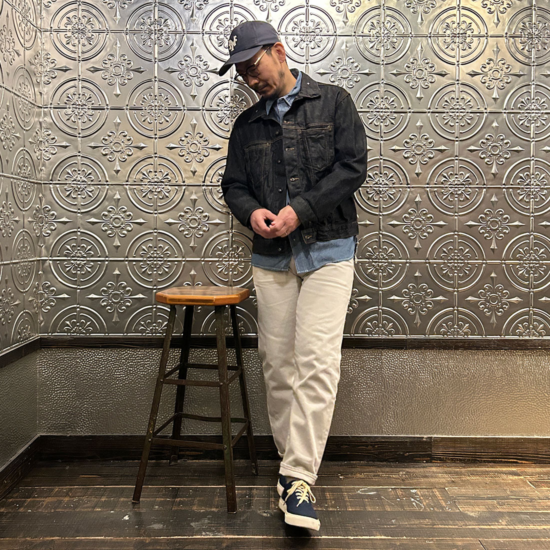 次はインナーにシャンブレーのワークシャツをレイヤード。Gジャンにワークシャツの土臭さの強い組み合わせ。洒落感の強いホワイトピケのパンツがスタイリングの雰囲気をがらりと変えてくれています。