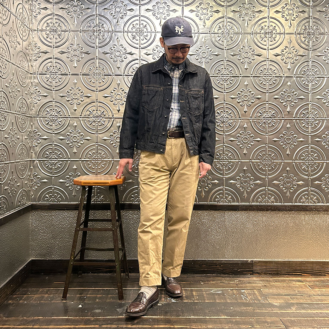 次はボタンダウンシャツにボトムは別注モデルのバリー。足元はローファーを合わせたトラッドなスタイリング。落ち着いたスタイリングでもブラックデニムなら違和感なく溶け込んでくれます。