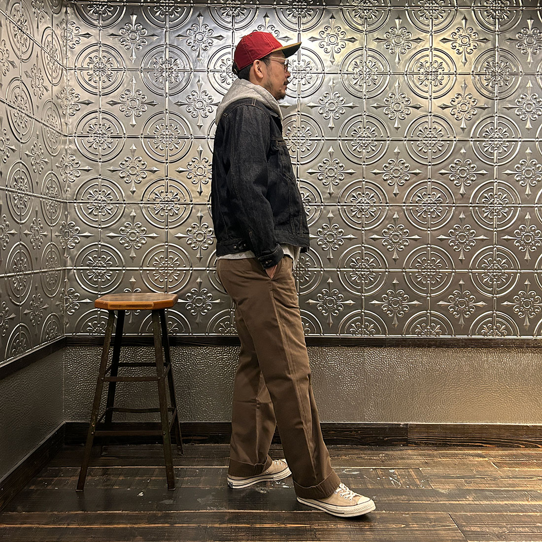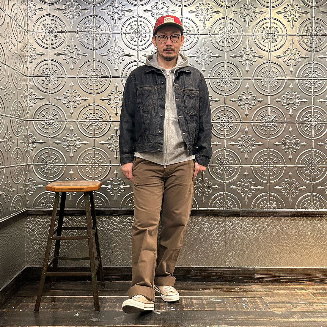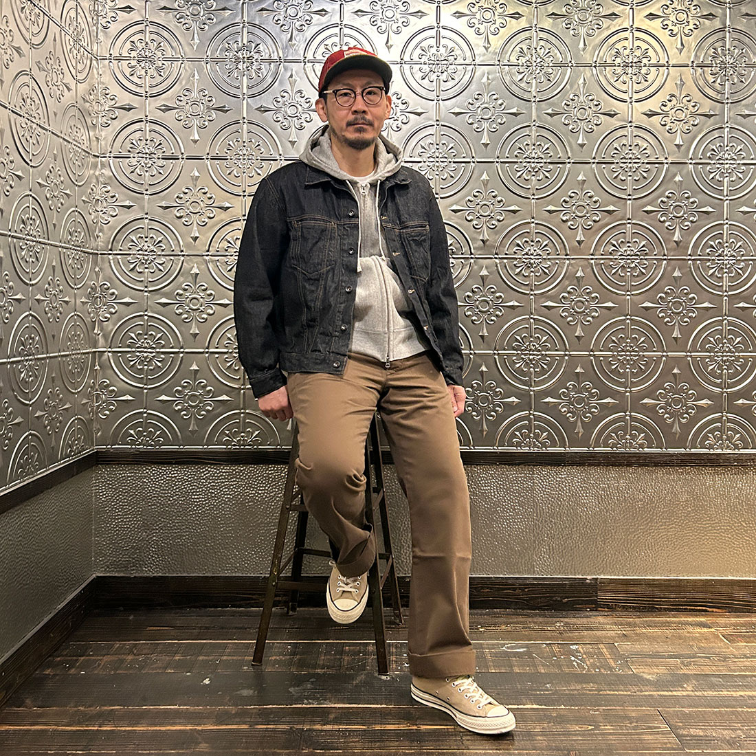 最後はもう少し寒くなった時期のスタイリン。インナーにスウェットパーカーをレイヤードして保温性をプラス。ボトムはチノパンを合わせたアメカジスタイル。ベージュよりも落ち着いた雰囲気のあるブラウンカラーのチノパンが良い感じです。