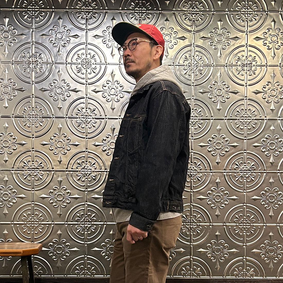 176cmの74kgで肩幅がやや広め、腕もやや長めの体型。今回紹介させて頂いたGジャンは身幅広めのボックスシルエット。Sサイズで身幅に程よいゆとりのあるサイズ。Tシャツやシャツはもちろん軽めのスウェットやニットなども着込めます。身幅的にはXSでも着用できますが袖丈と着丈が短いです。