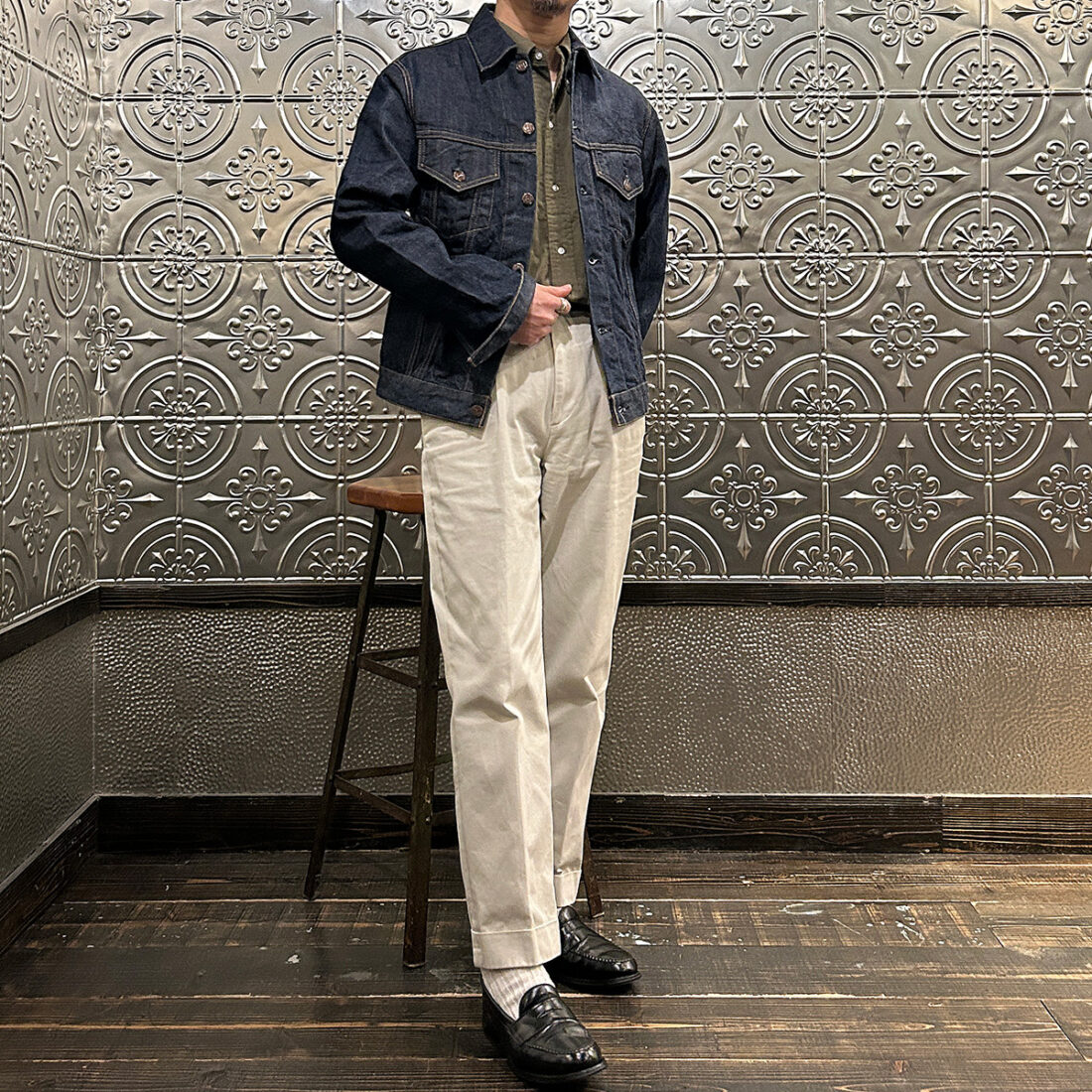 26年春夏リリースの新型「Trucker Jacket(Gジャン)」「Utility Jacket(ミリタリーシャツジャケット)」「Utility Pant(ファティーグパンツ)」の試着用のサイズサンプルをご用意。