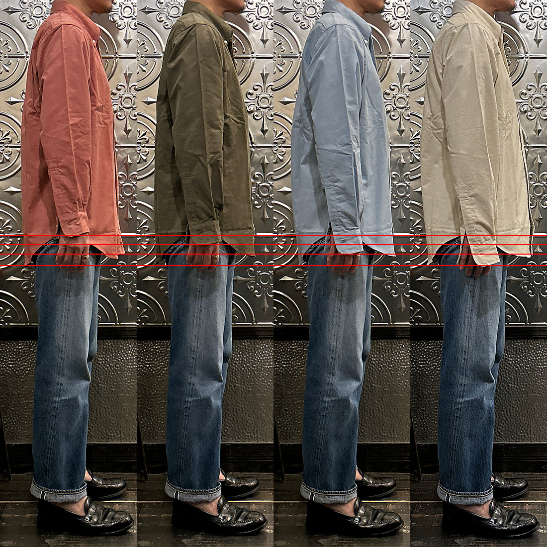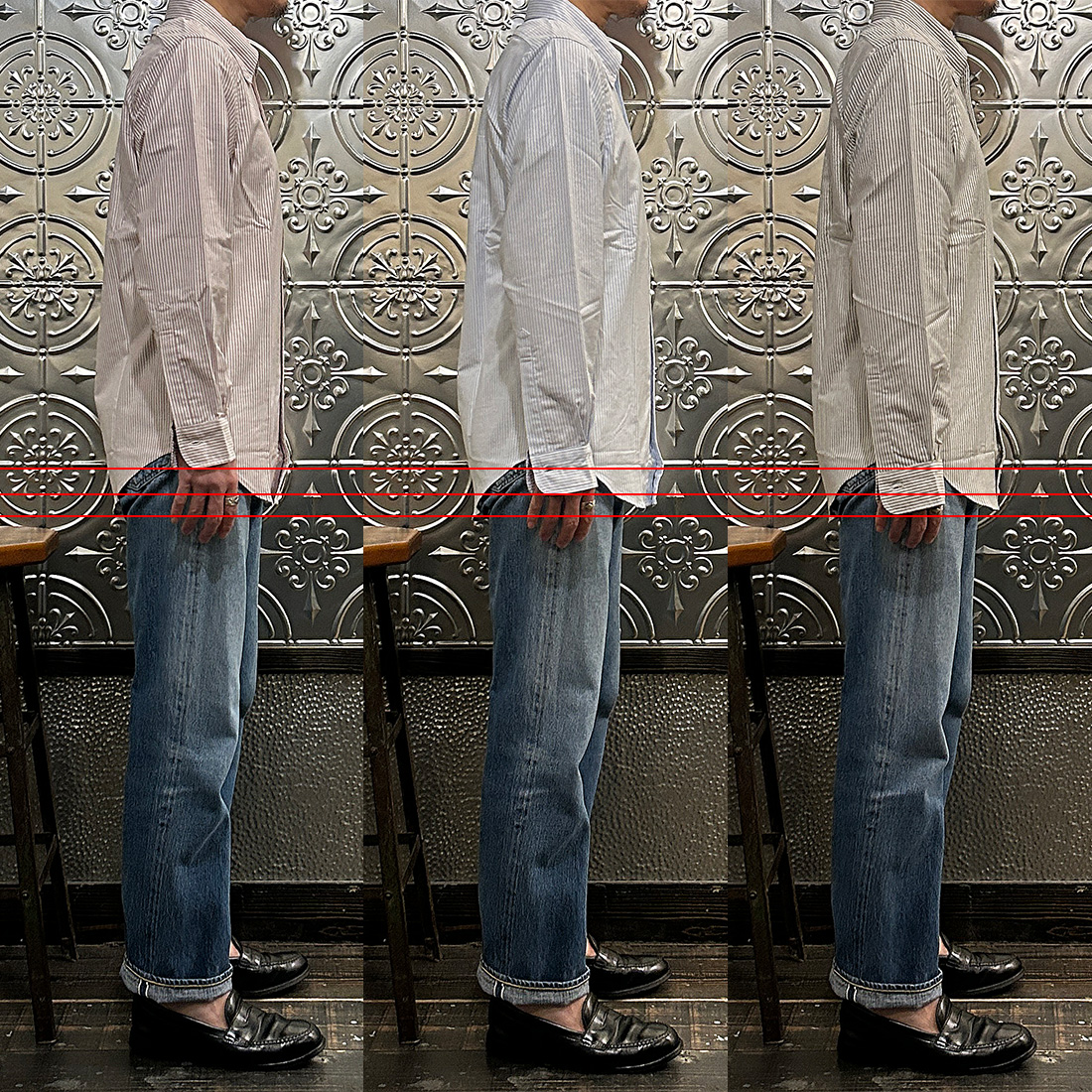 このファーイーストマニュファクチャリングのシャツ、1つのネックサイズに4種類の袖丈(裄丈)設定があるのが特徴です。