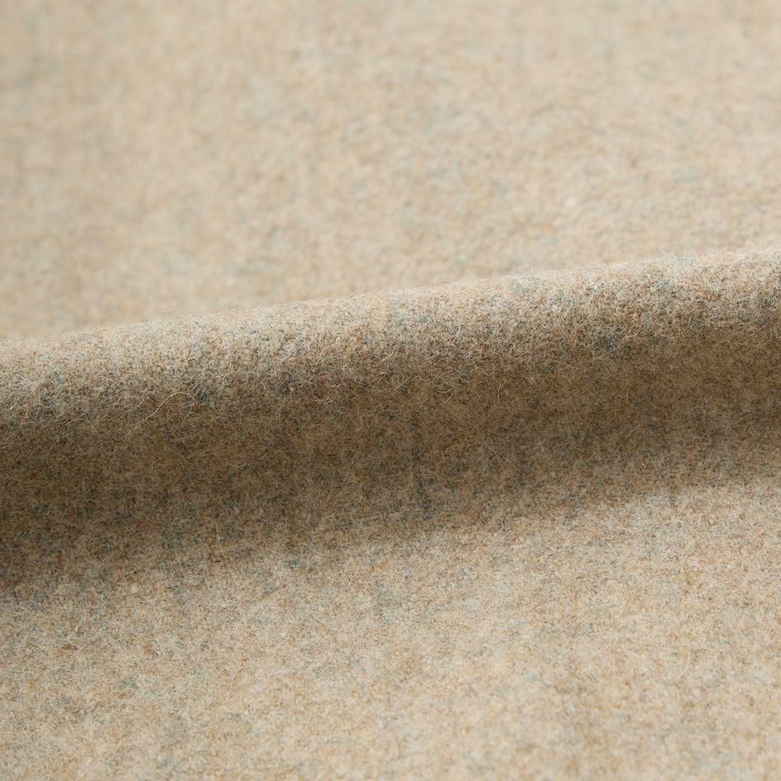 一般的には防寒目的で厚手のウールを使っている事が多いダッフルコート。こちらは生地の厚みはそれほどなく、柔らかくて着易いのが特徴です。言い方を変えれば防寒性はあまり期待できません。生地が厚すぎないという点が前述のラグランスリーブ仕様との相互作用で肩回りから腕にかけてのキレイなシルエットに繋がっているという訳。