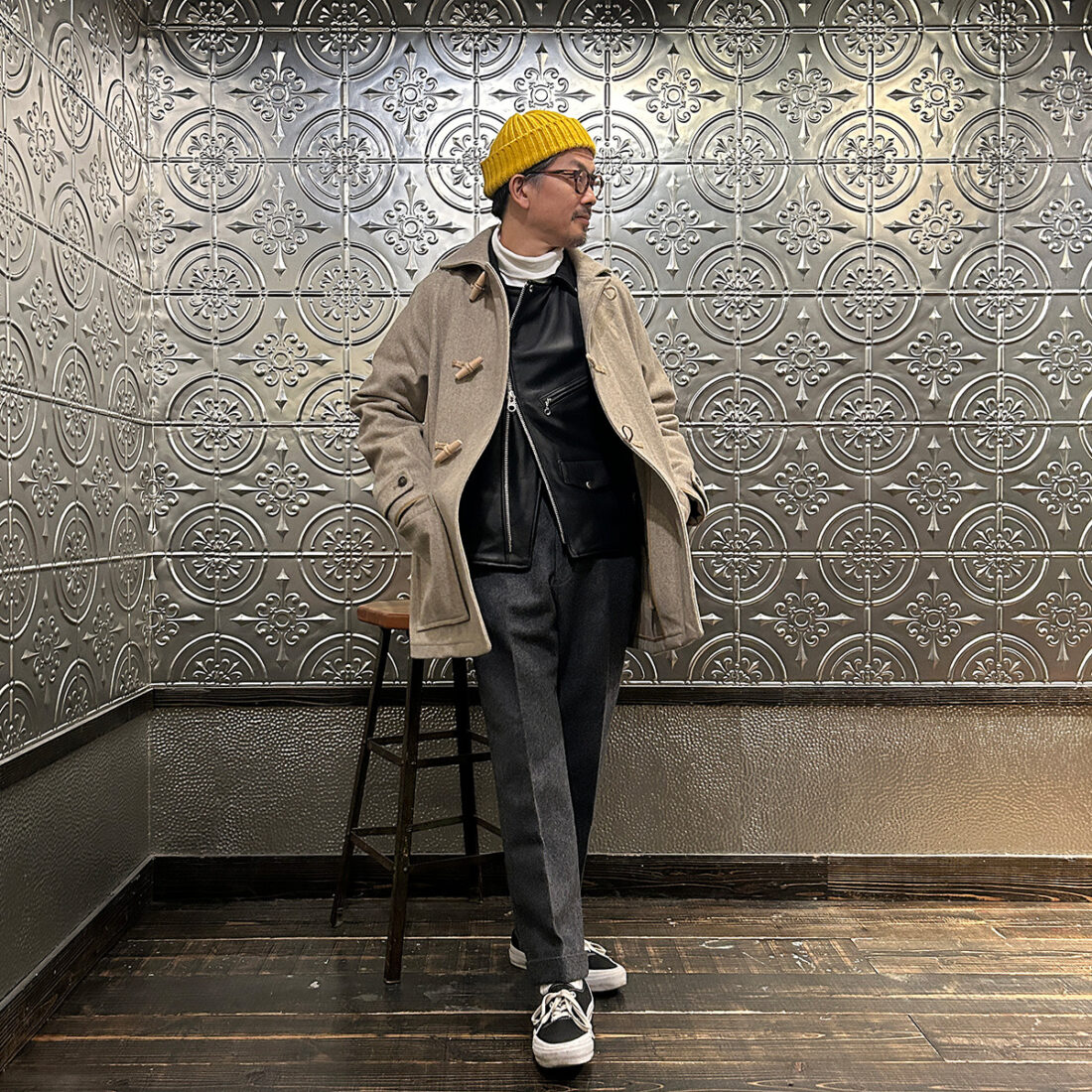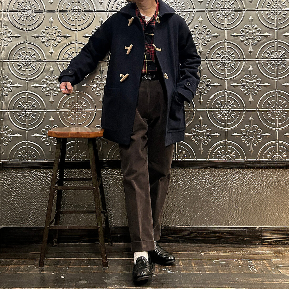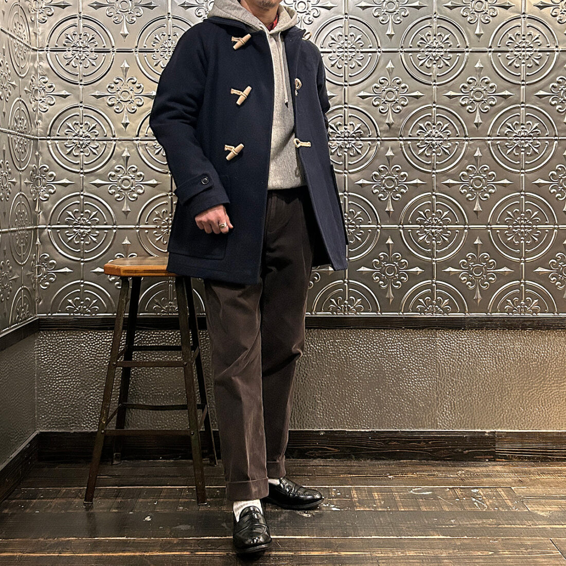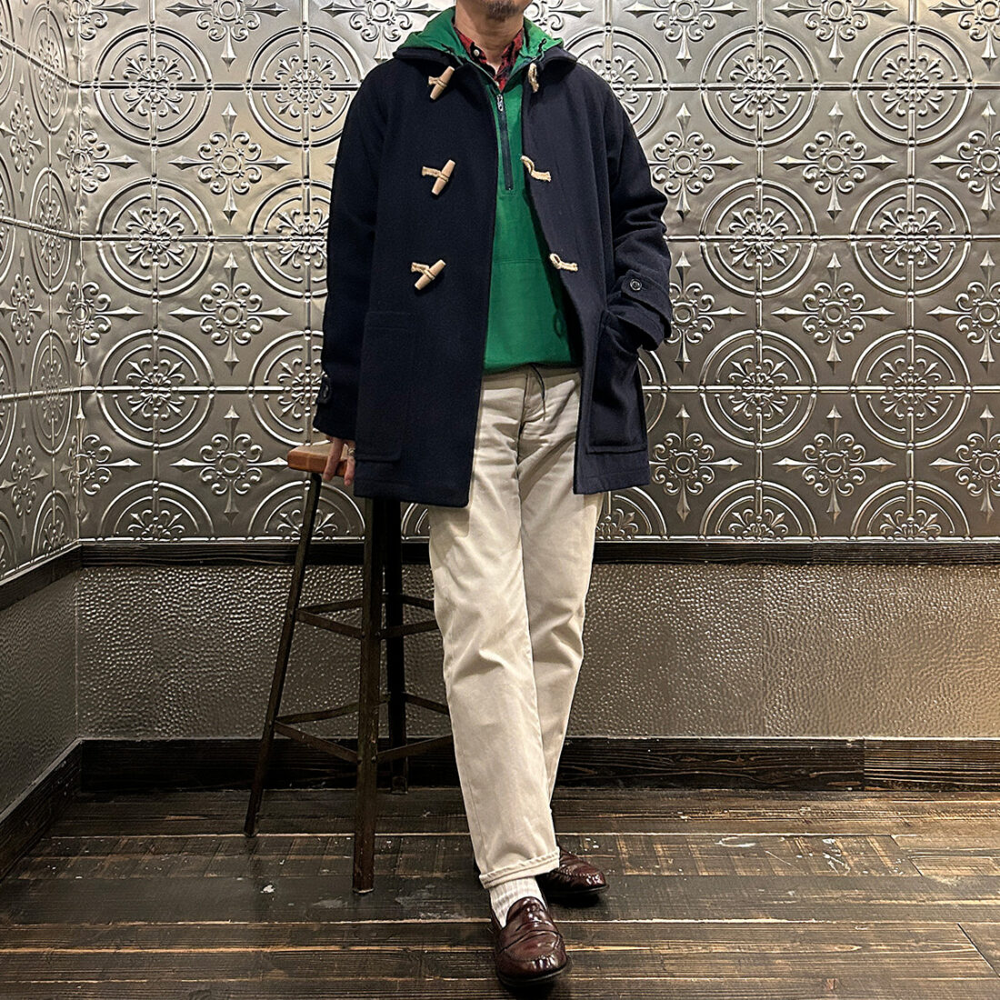 ダッフルコートってフード付きのモノが多いですよね。それはそれで良いのですが、すっきり着たい時や中にフードモノを着たい時に邪魔になる事もありますよね。これはそんな心配不要。実際には軍モノ(イギリス海軍)にもショールカラー仕様のダッフルは存在するのでそんなルーツを知りつつ(俺、分かってるぜ感出して?笑)着るのも良いですかね。