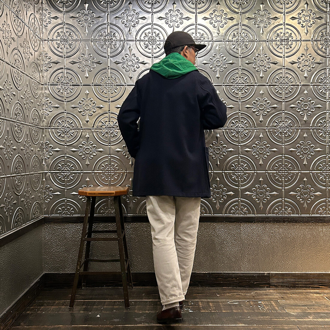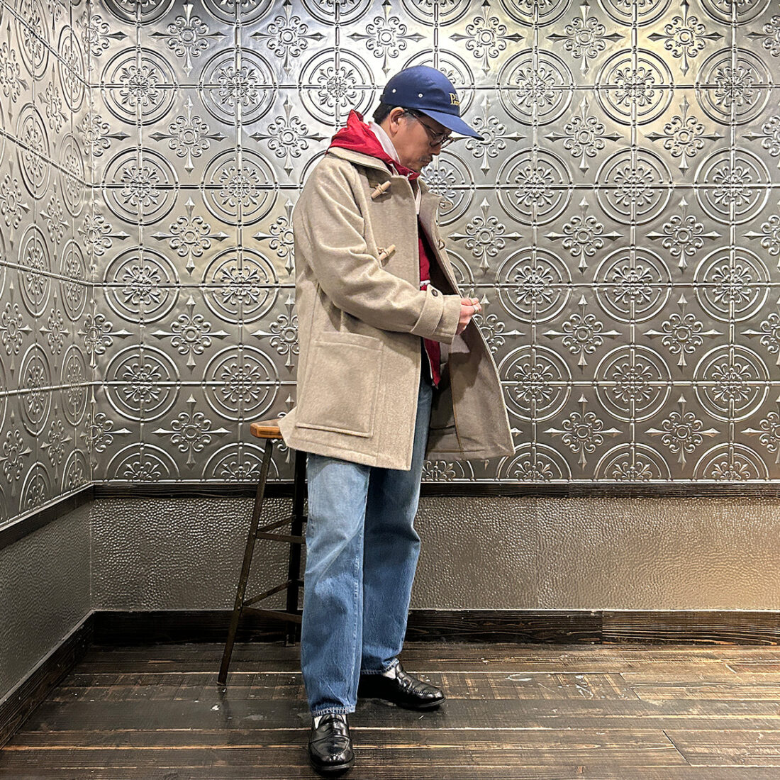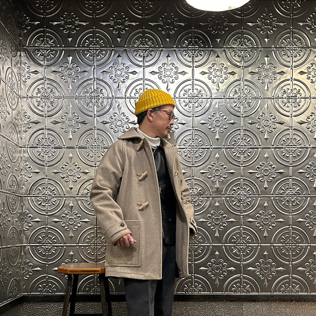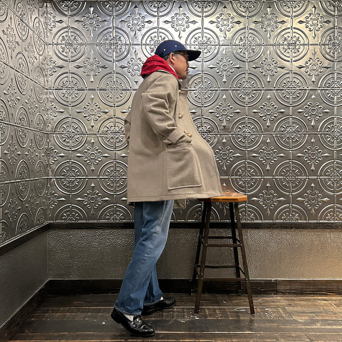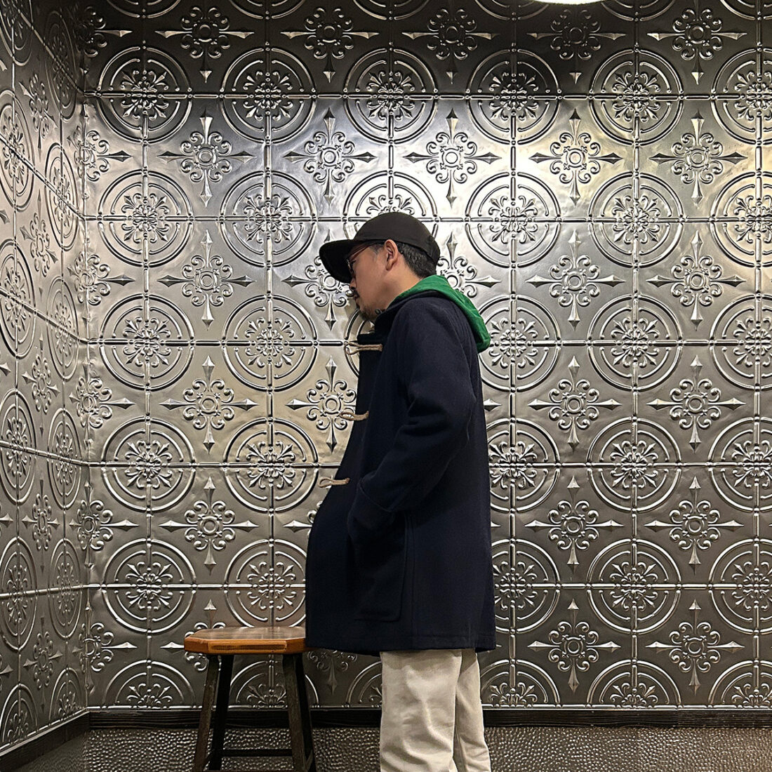 ダッフルコートってフード付きのモノが多いですよね。それはそれで良いのですが、すっきり着たい時や中にフードモノを着たい時に邪魔になる事もありますよね。これはそんな心配不要。実際には軍モノ(イギリス海軍)にもショールカラー仕様のダッフルは存在するのでそんなルーツを知りつつ(俺、分かってるぜ感出して?笑)着るのも良いですかね。
