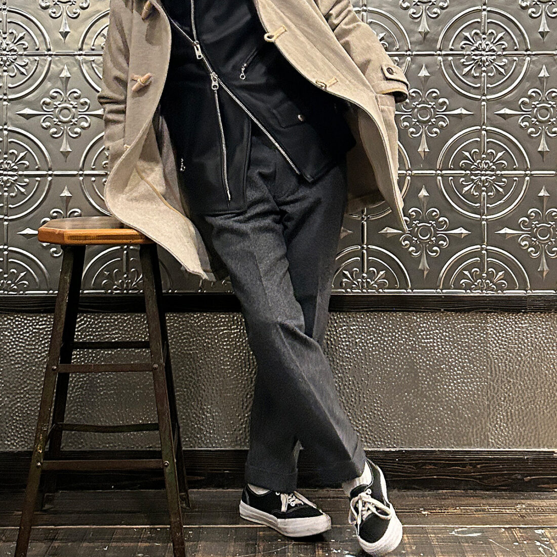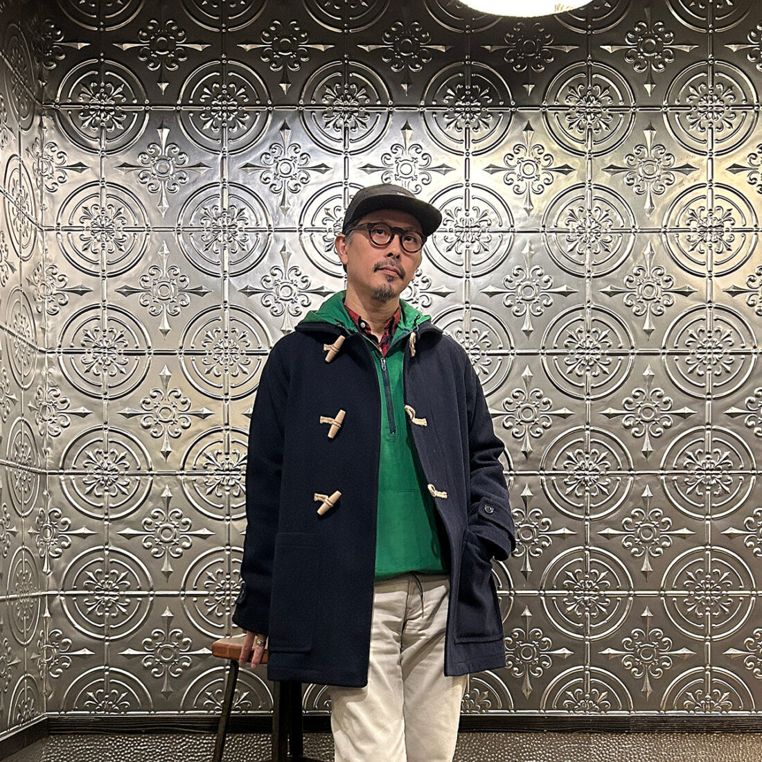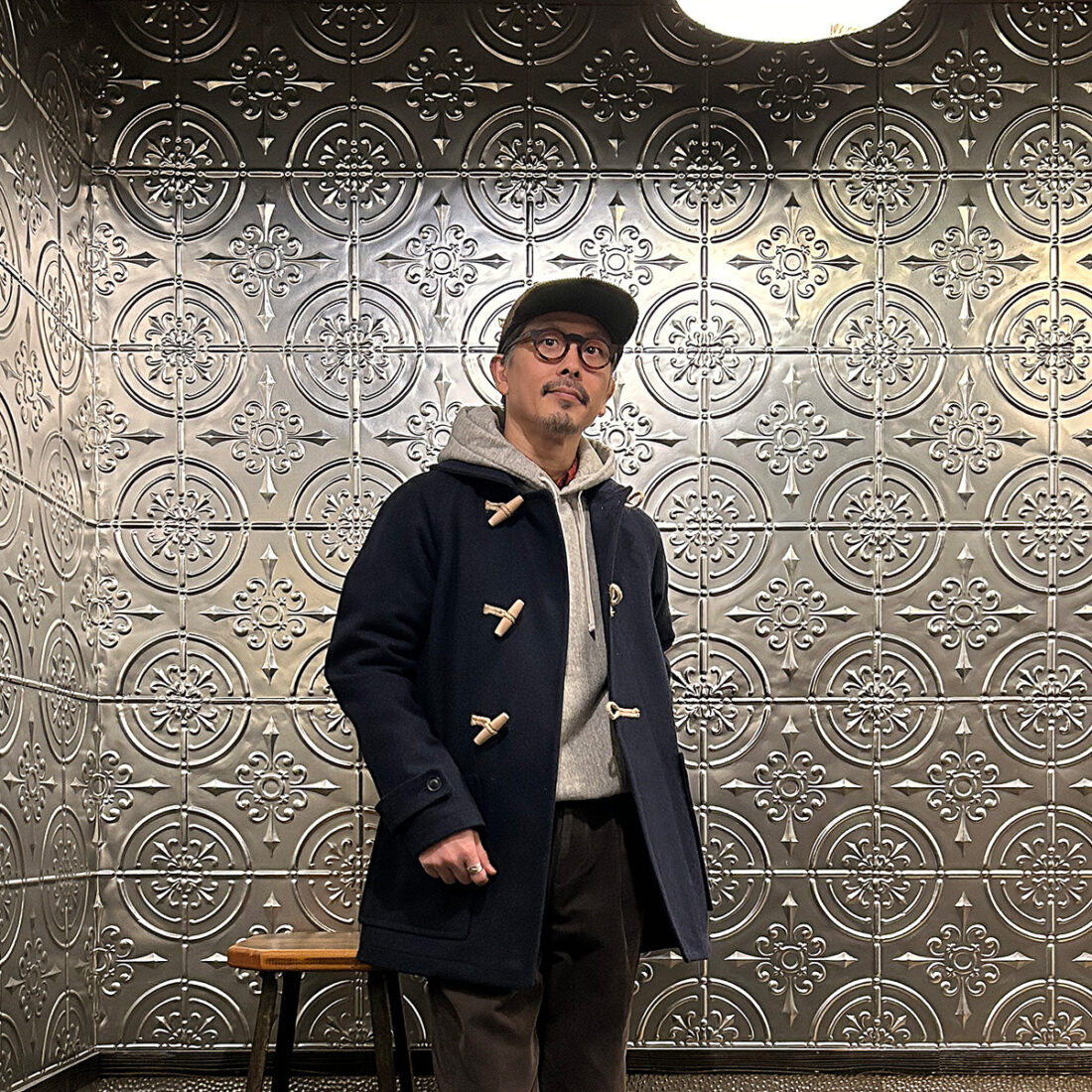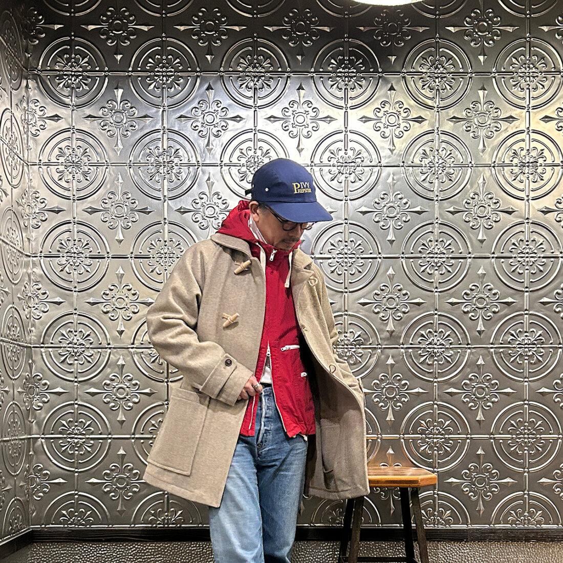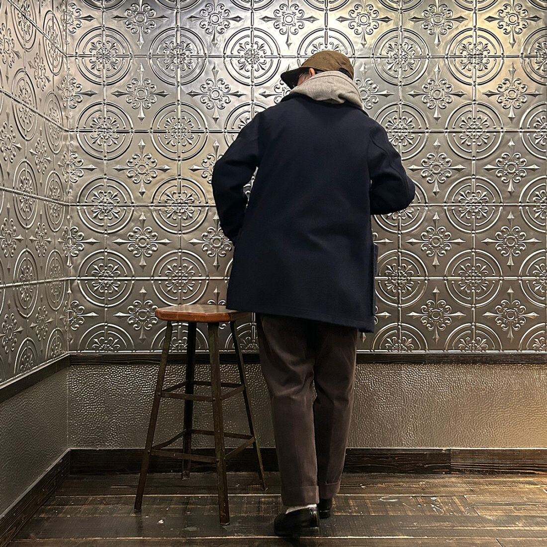 ダッフルコートってフード付きのモノが多いですよね。それはそれで良いのですが、すっきり着たい時や中にフードモノを着たい時に邪魔になる事もありますよね。これはそんな心配不要。実際には軍モノ(イギリス海軍)にもショールカラー仕様のダッフルは存在するのでそんなルーツを知りつつ(俺、分かってるぜ感出して?笑)着るのも良いですかね。