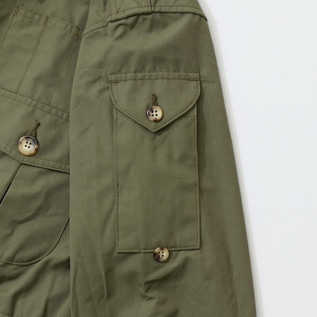 袖は捲った状態でボタンで留めれる仕様。ハンティングジャケットなどでよく見られるディテール。