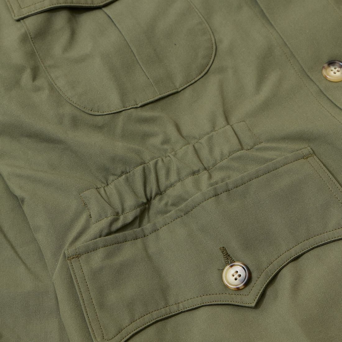 一般的なサファリジャケットにはウェストベルトが装備されている事が多いのですが、このジャケットはヘミングウェイの意向でベルトを排してゴムシャーリング仕様。一説にはヘミングウェイがベルト仕様が嫌いだったからだとか。