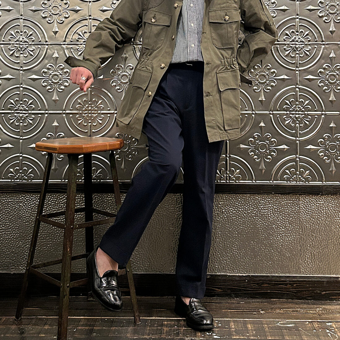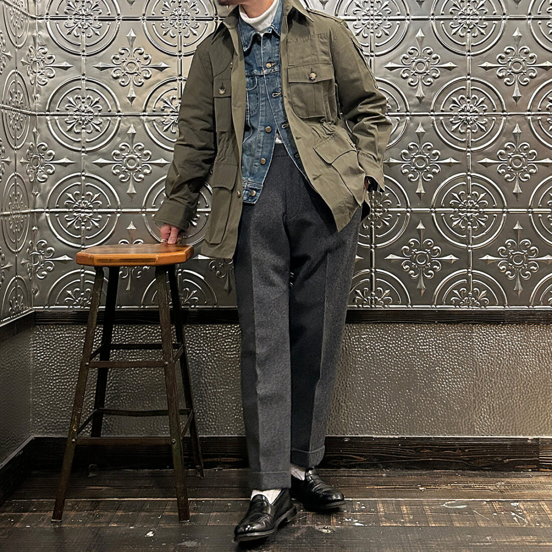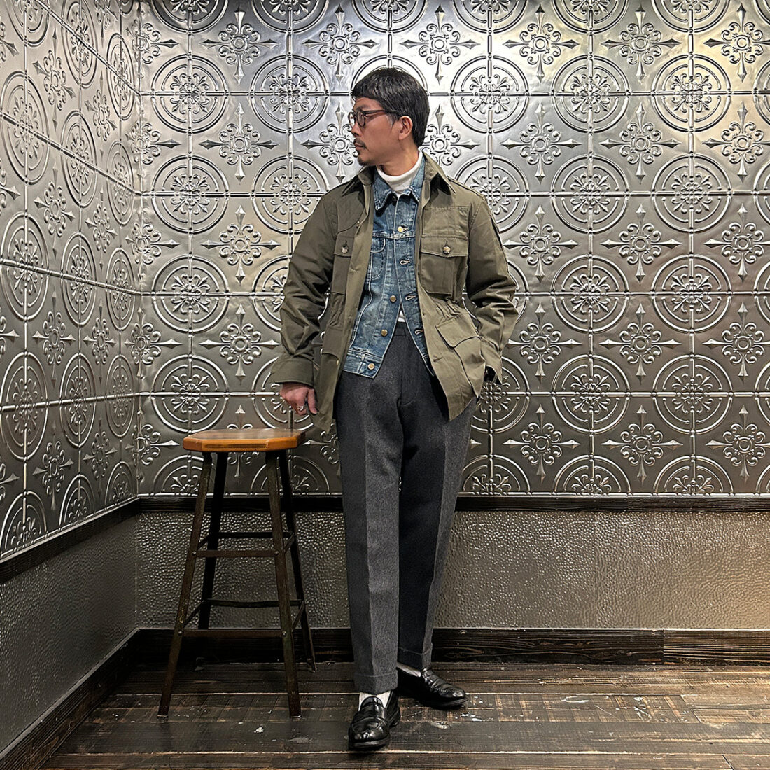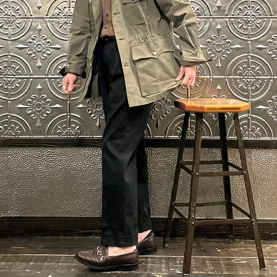 こういうハンティング系のギアにウールトラウザーという組み合わせが好きです!アウトドアギアなんですが、どこかしら上品な雰囲気が漂い大人な感じなのが良い。