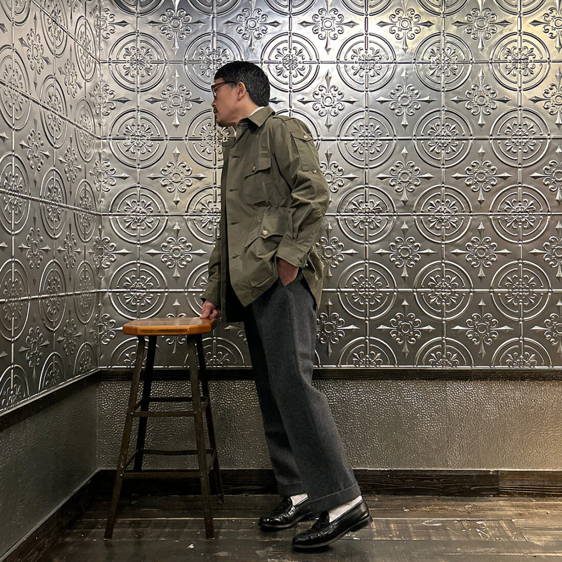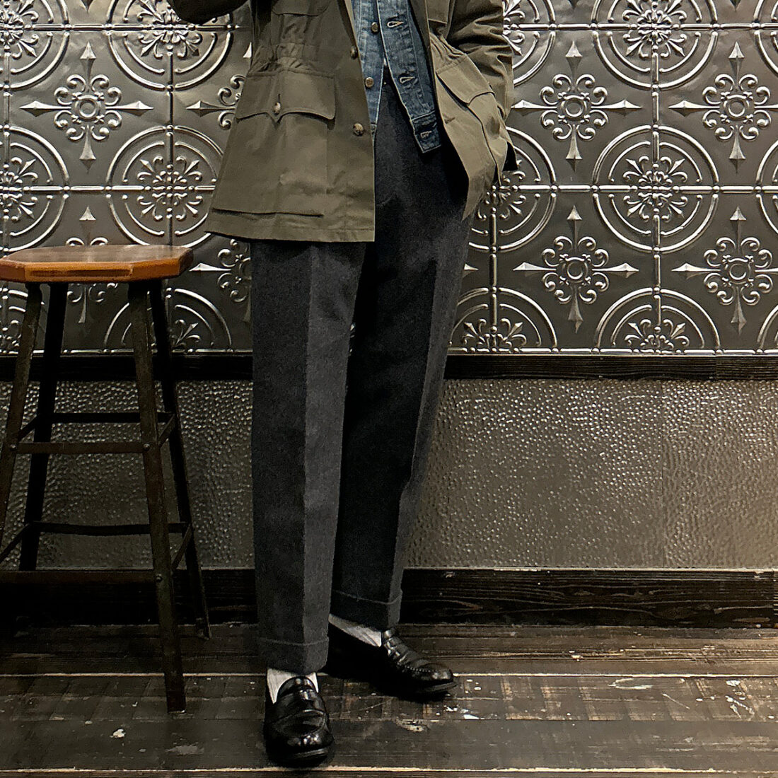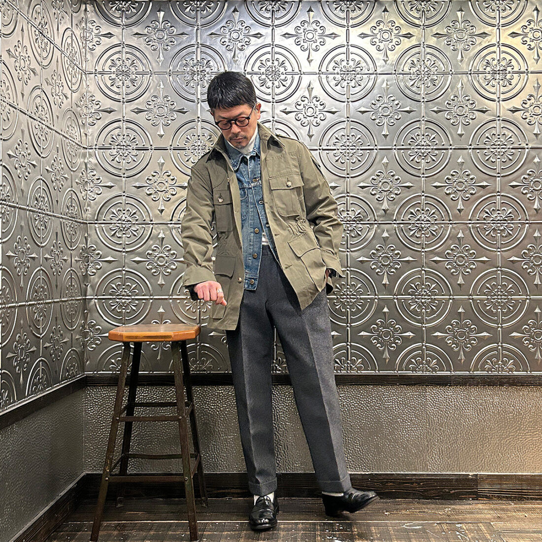 こういうハンティング系のギアにウールトラウザーという組み合わせが好きです!アウトドアギアなんですが、どこかしら上品な雰囲気が漂い大人な感じなのが良い。