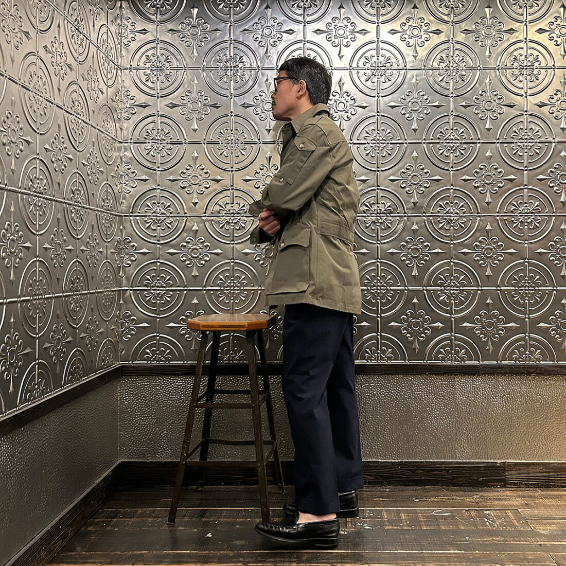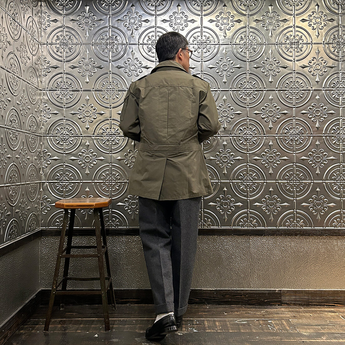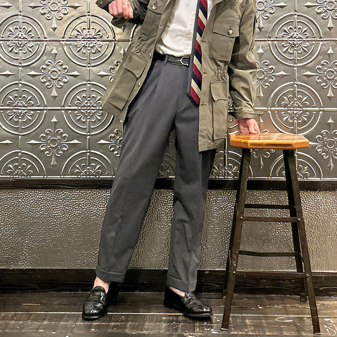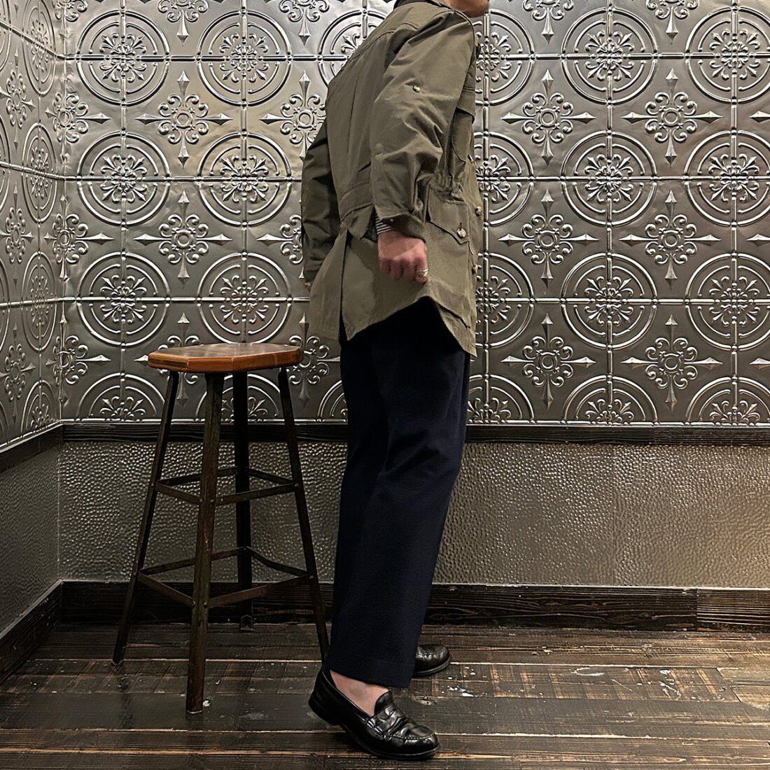 こういうハンティング系のギアにウールトラウザーという組み合わせが好きです!アウトドアギアなんですが、どこかしら上品な雰囲気が漂い大人な感じなのが良い。