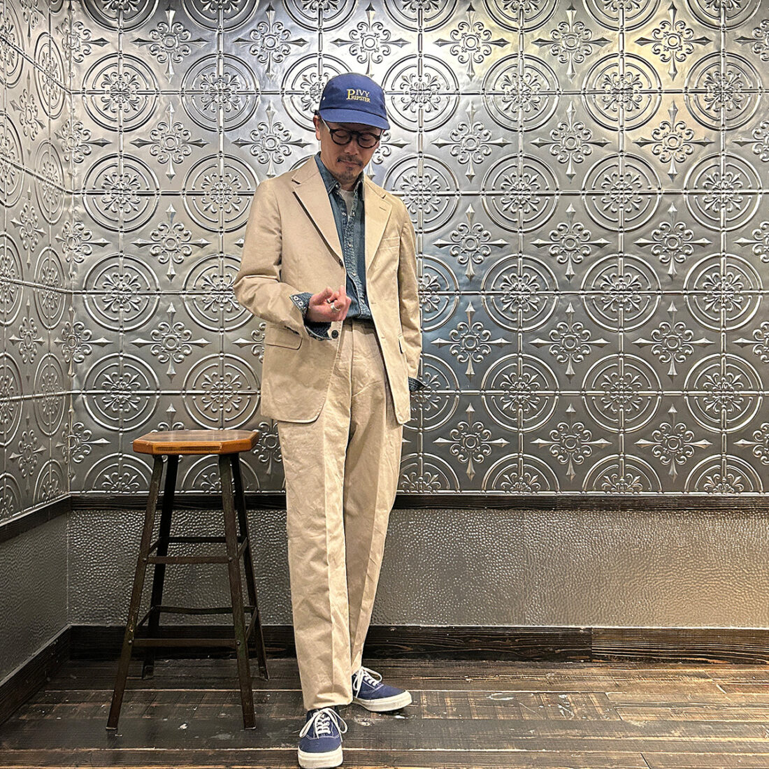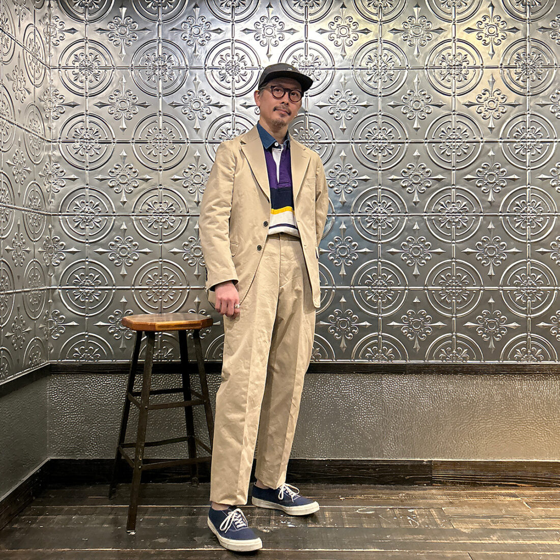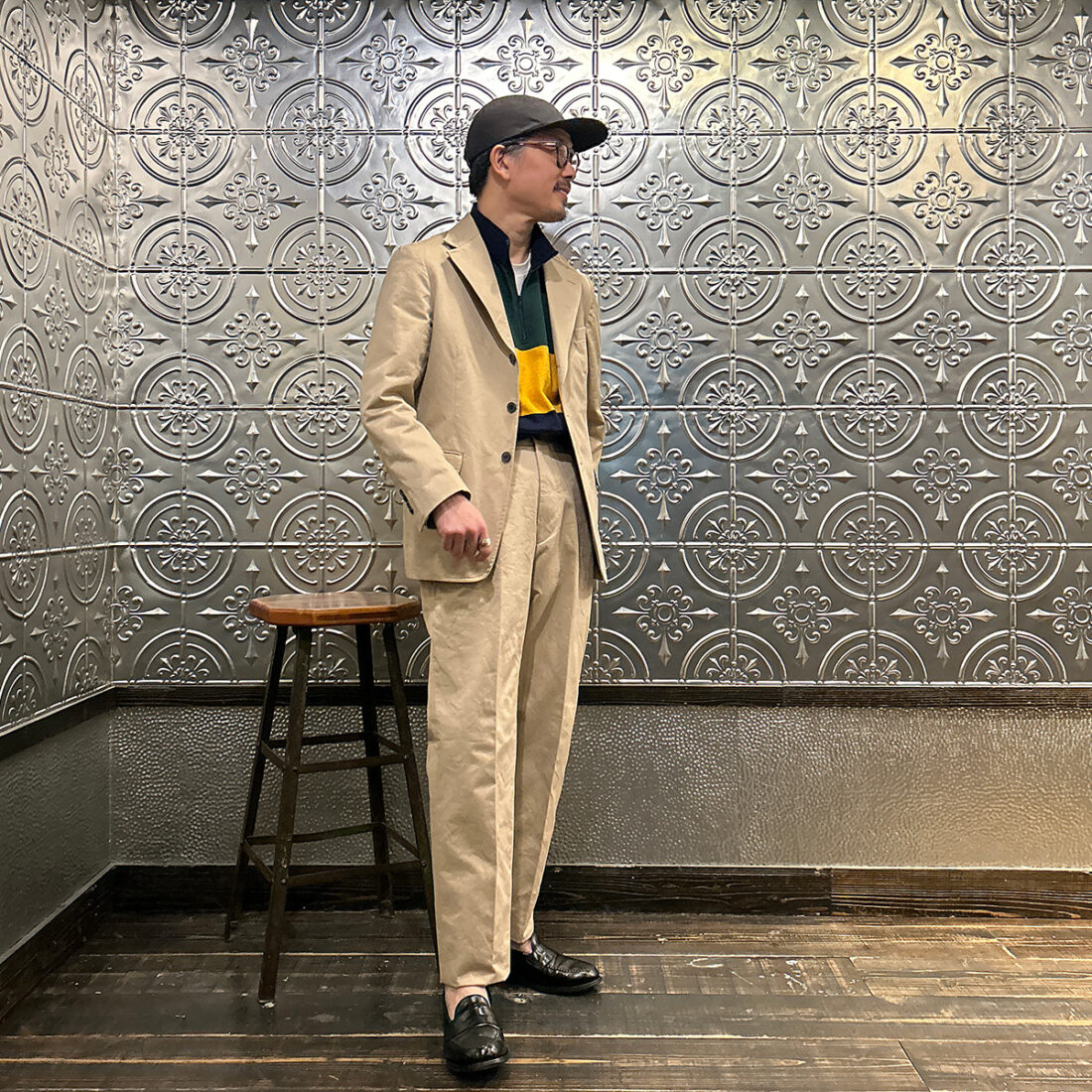 私のように普段セットアップやジャケットをあまり着ない方は写真のようにキャップやスニーカーを使ってラフな雰囲気にして頂くと凄く着易いかと。