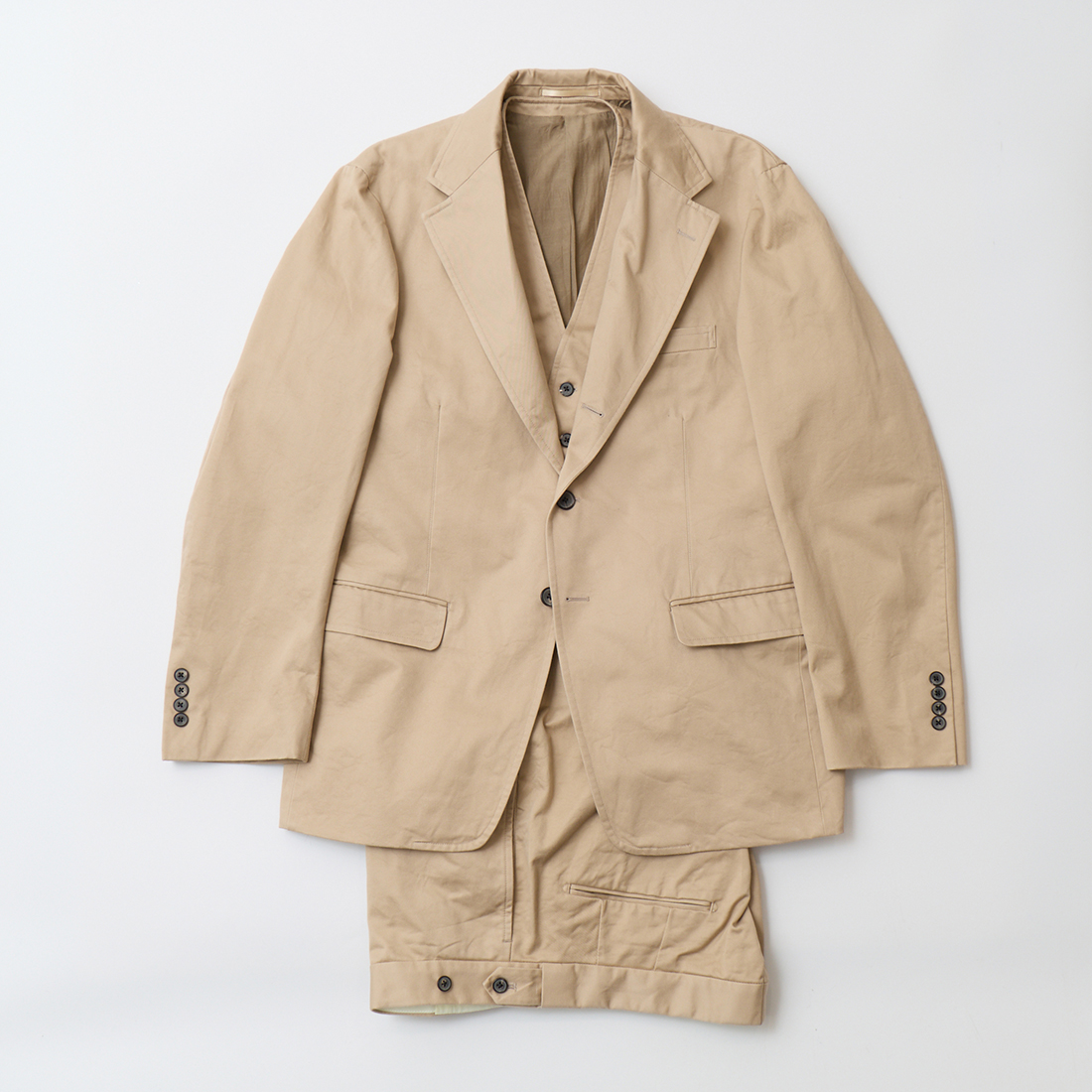 普段スーツを着ない私ですらメチャクチャ欲しいと思える抜群の雰囲気。しかも3ピースですからね。でもかしこまり過ぎたイメージではない所が良い。コットンのチノクロスならではのシワ感が良いですね~。