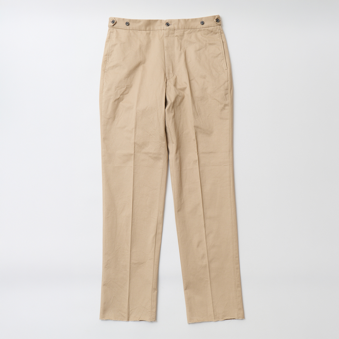 パンツのウェストは少し緩いのですが、ウェストのボタンを両サイドで小さく留める事によってジャストなサイズ感に。