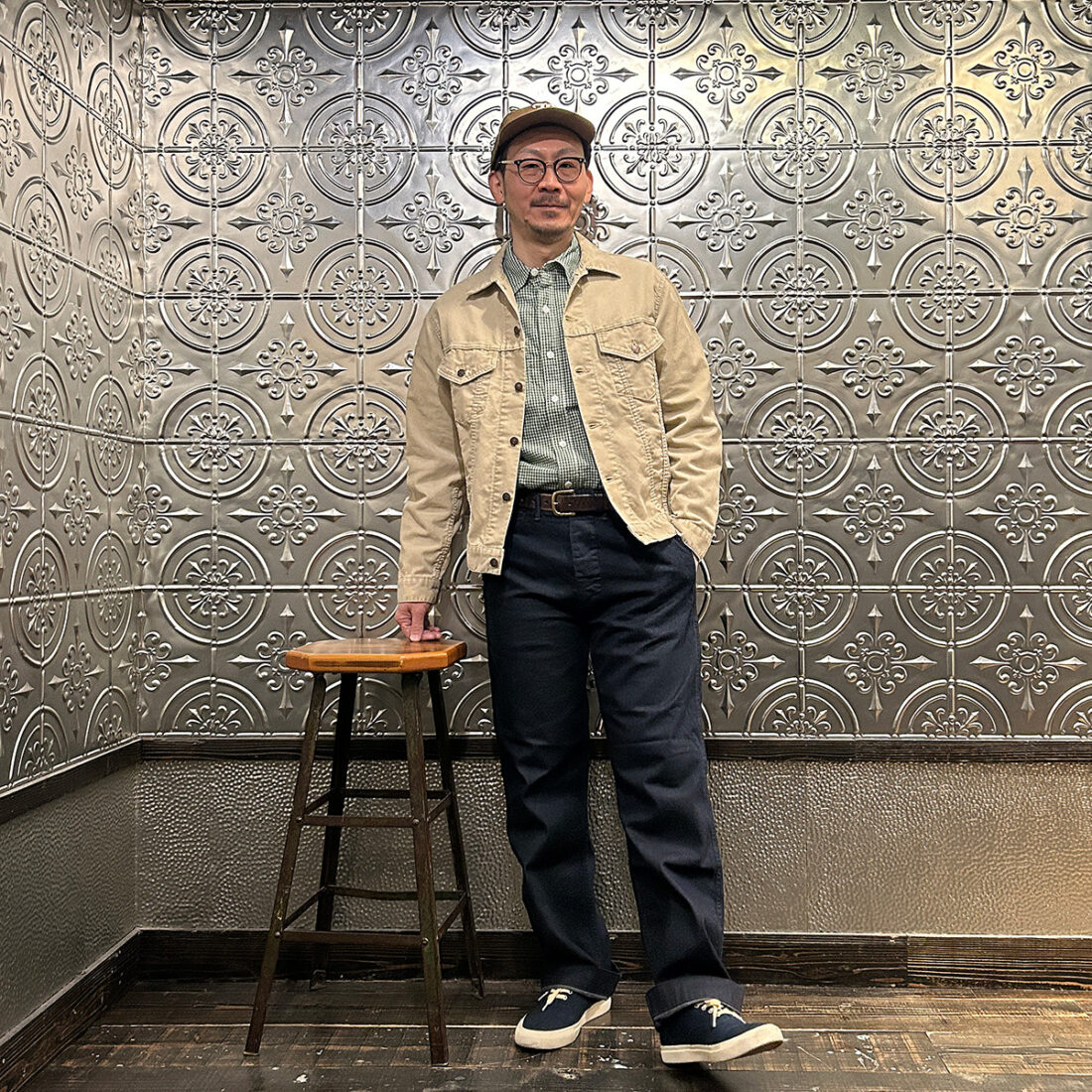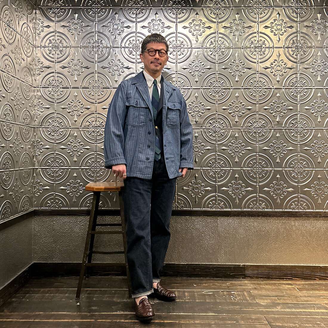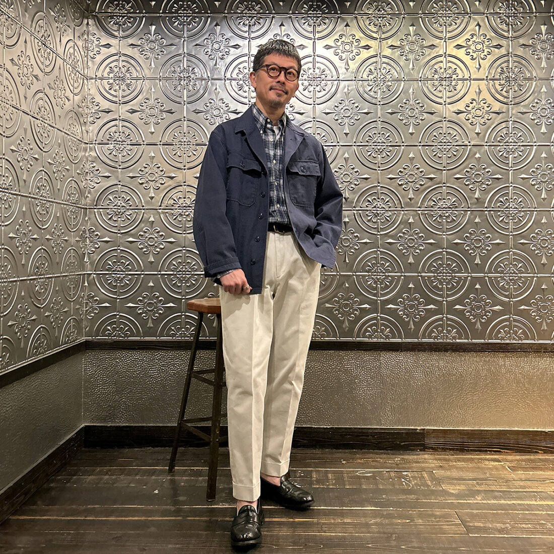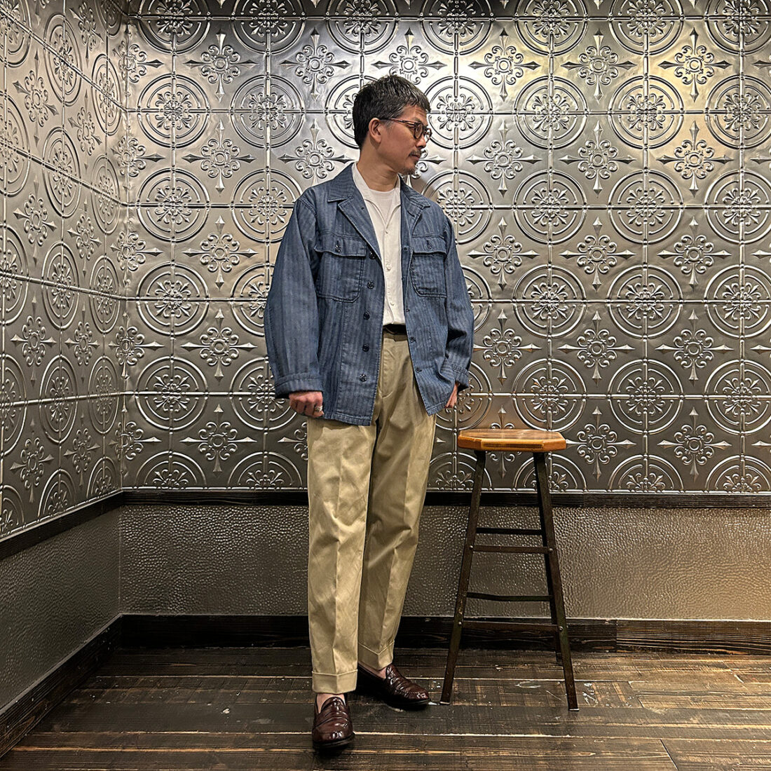 172センチ60キロでサイズ「M」を着用。前述のインディゴヘリンボーンと生地が違うだけでサイズ感は同じですので私には少し大き目です。