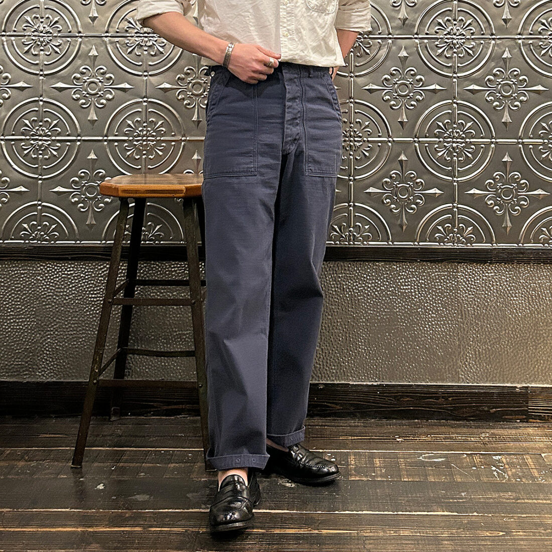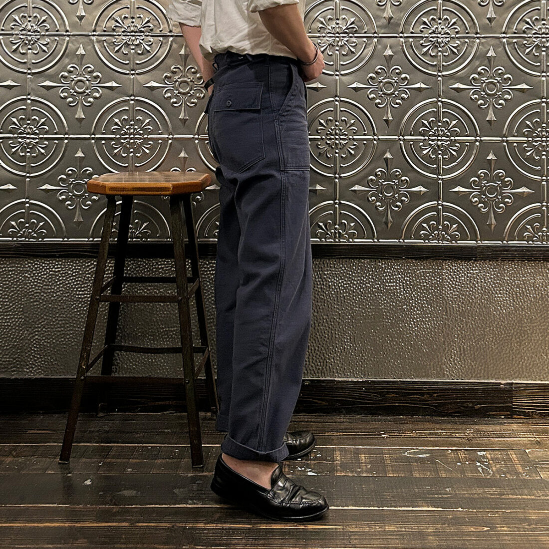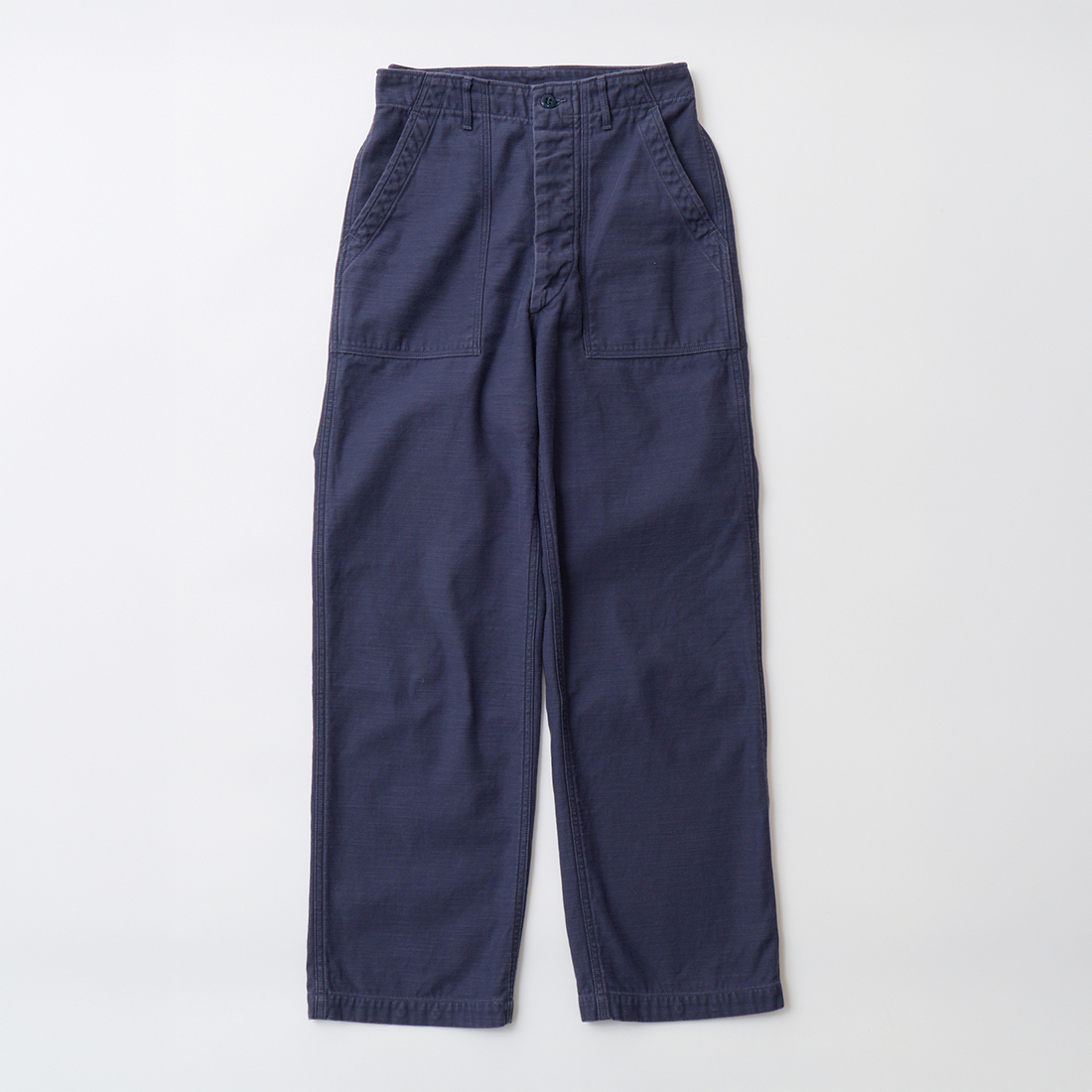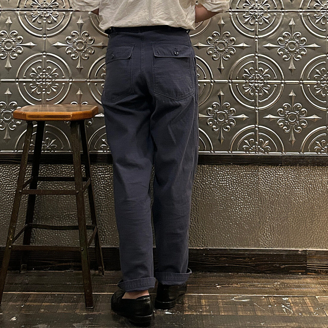 次は同生地バックサテンの新色ネイビーのユーティリティーパンツ(ファティーグパンツ)。