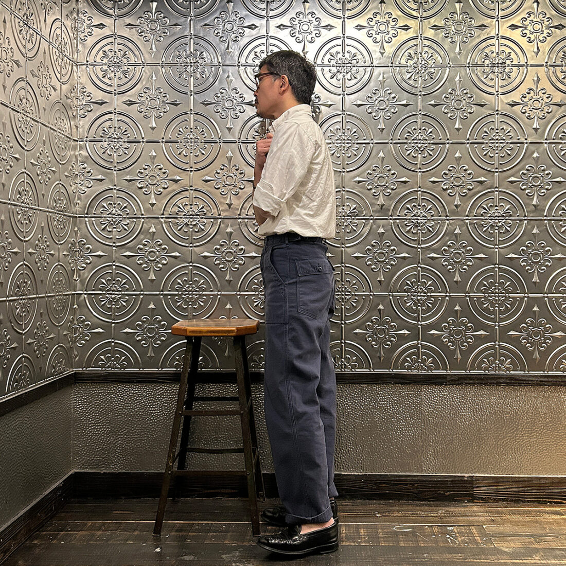 こちらは前述のバックサテンと同生地のユーティリティーパンツ(ファティーグパンツ)。穿き込んだ時の色落ちを想像するにかなりカッコイイのではないかと思う訳です。デニム以外で経年変化を楽しめるパンツというアプローチも新鮮ではないかと。