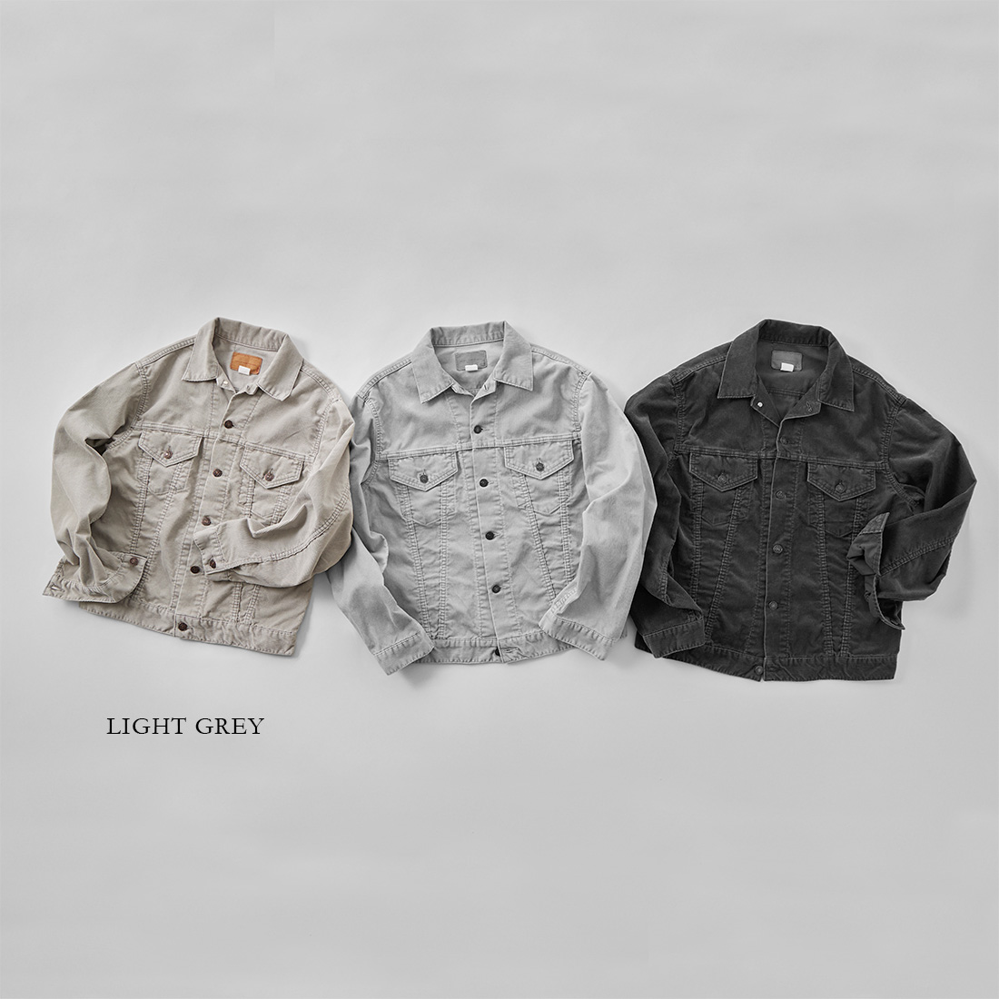 (左)TRUCKER JACKET CORDUROY – LIGHT GREY 44,000円(税込)