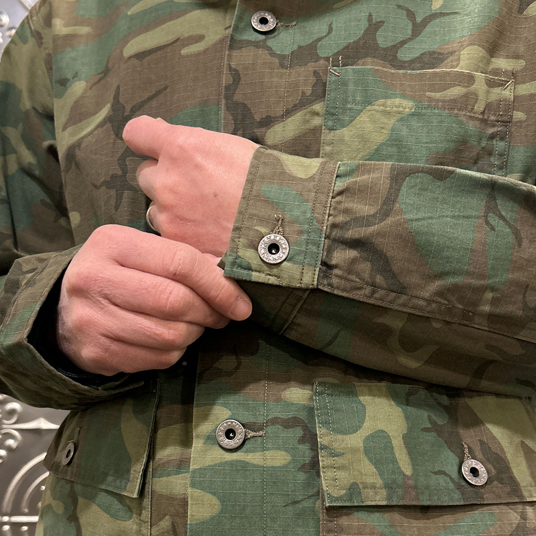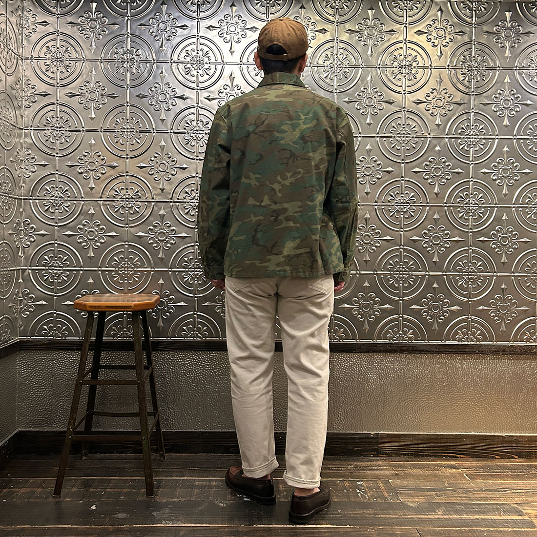 シンプルなバックスタイル。薄めの色合いのウッドランドカモ。コットンリップストップなので経年変化も楽しみ。
