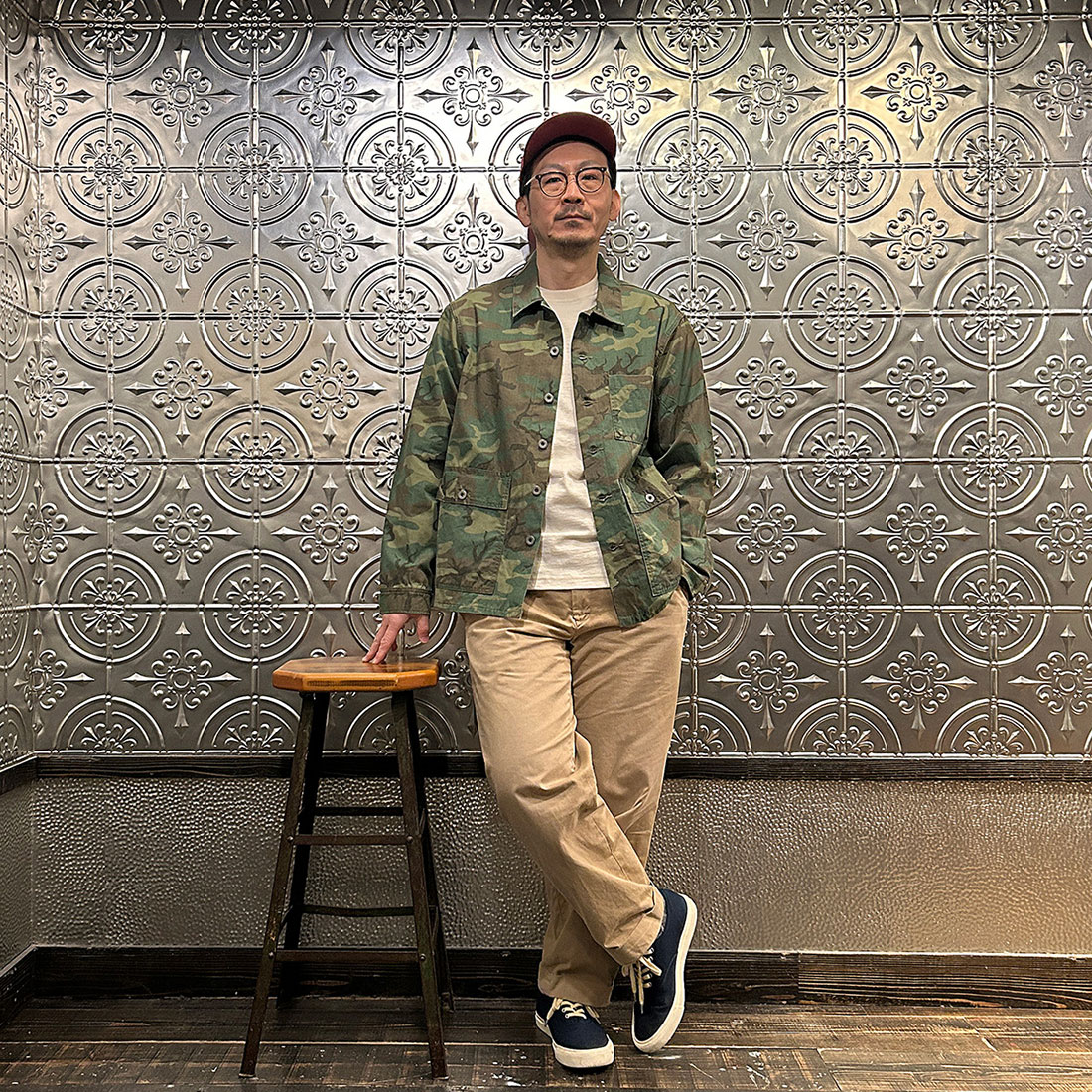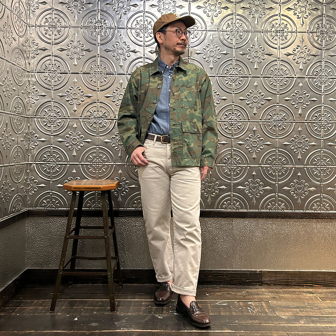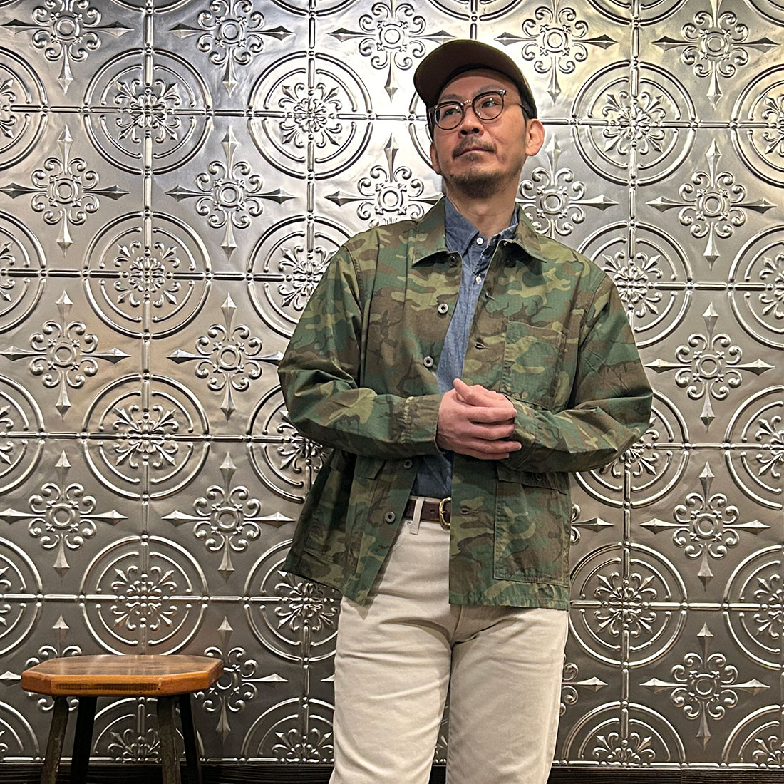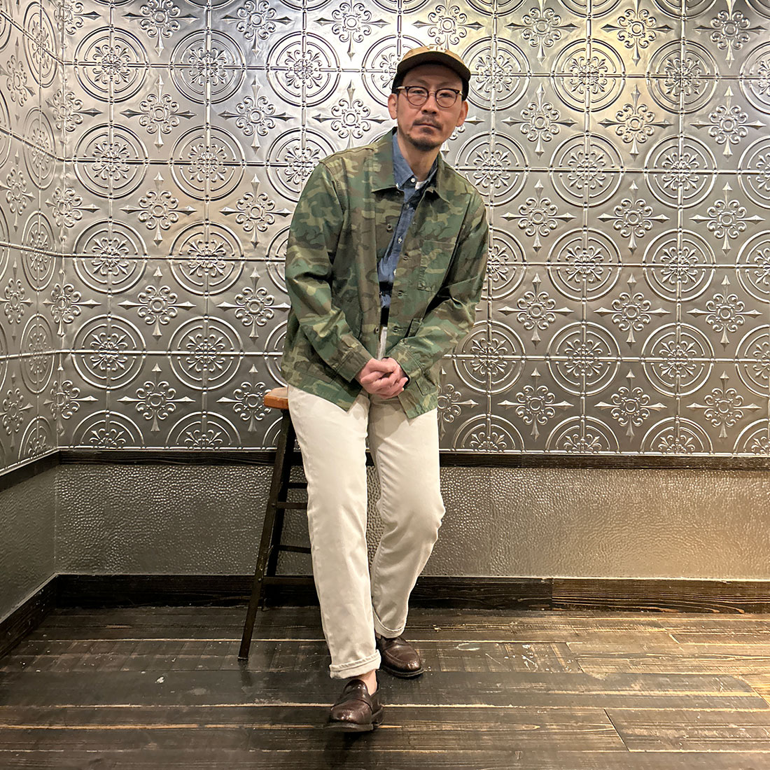 土臭さのあるカモフラ柄のシャツジャケットをトラッドな感じに。