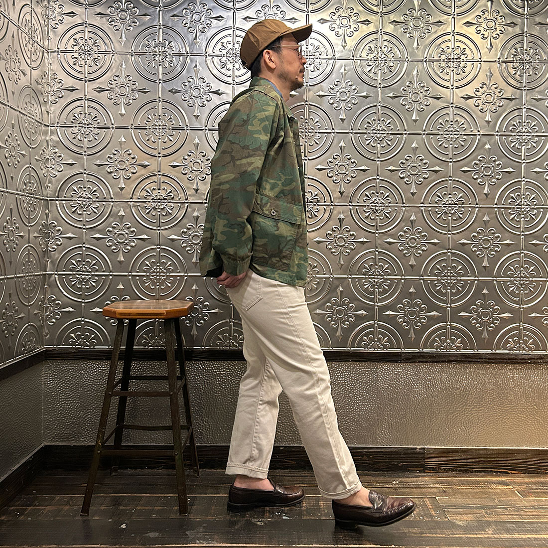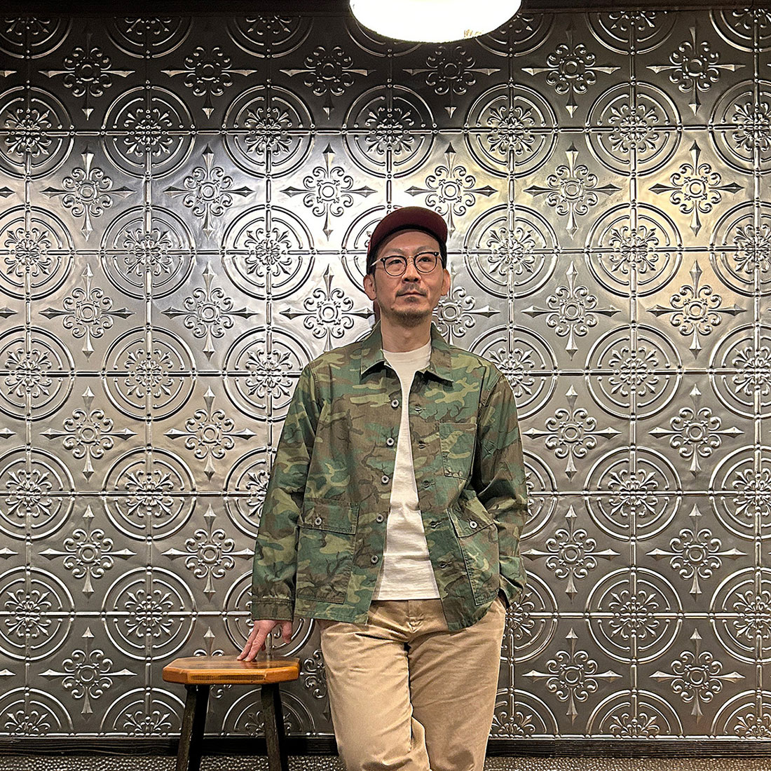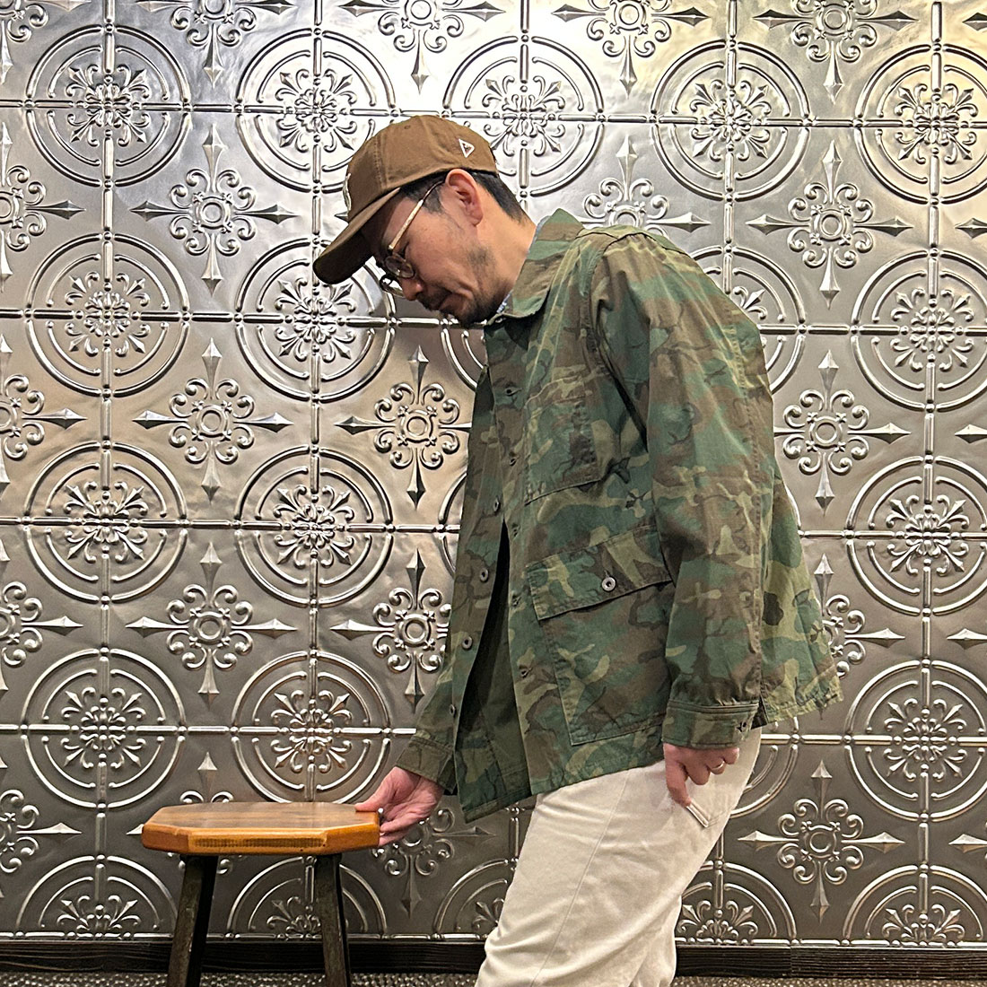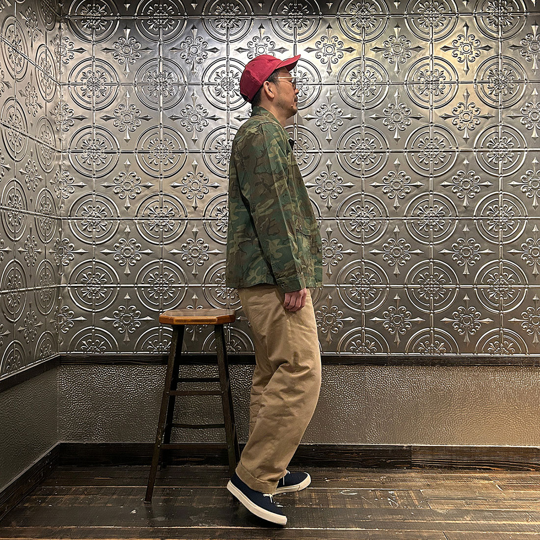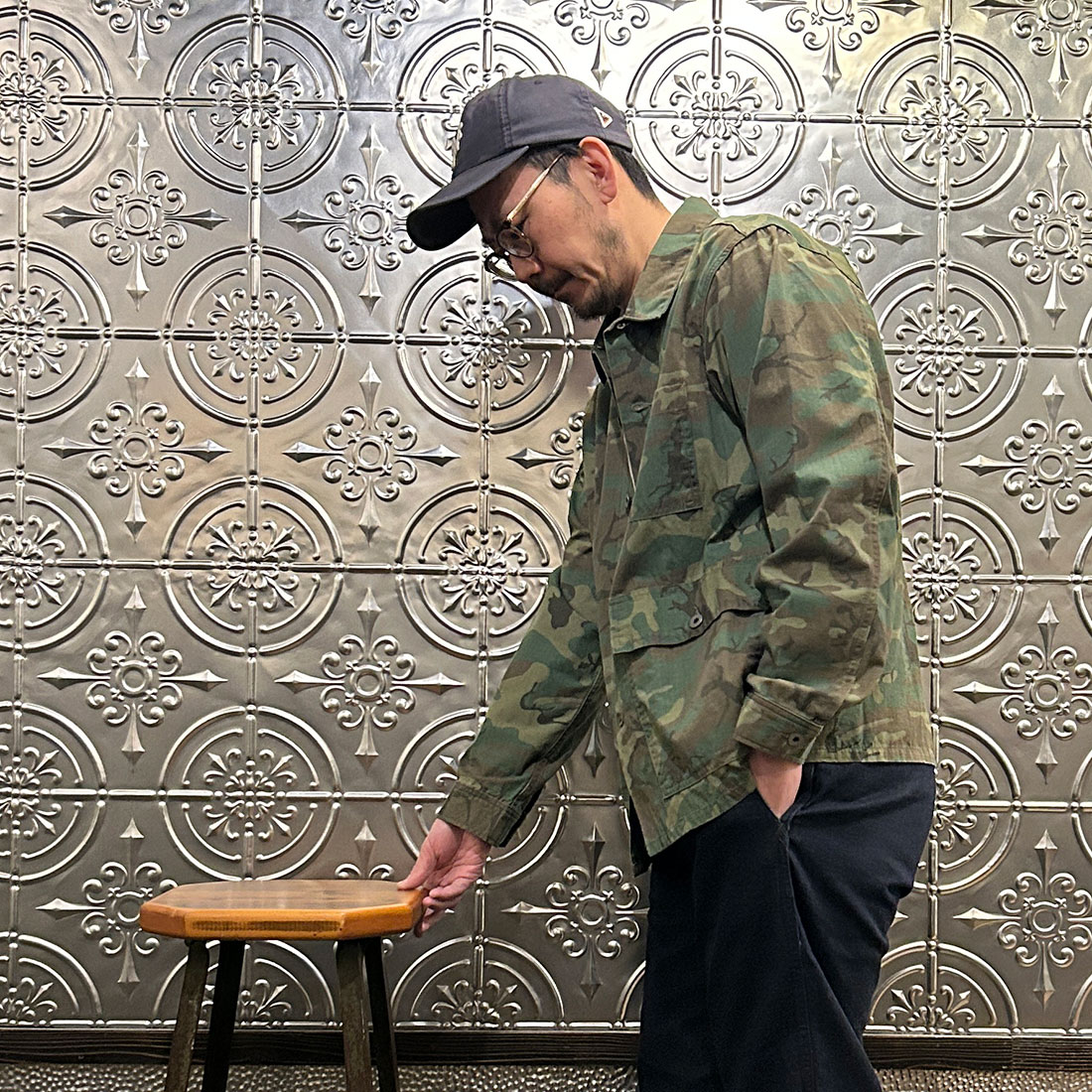 土臭さのあるカモフラ柄のシャツジャケットをトラッドな感じに。