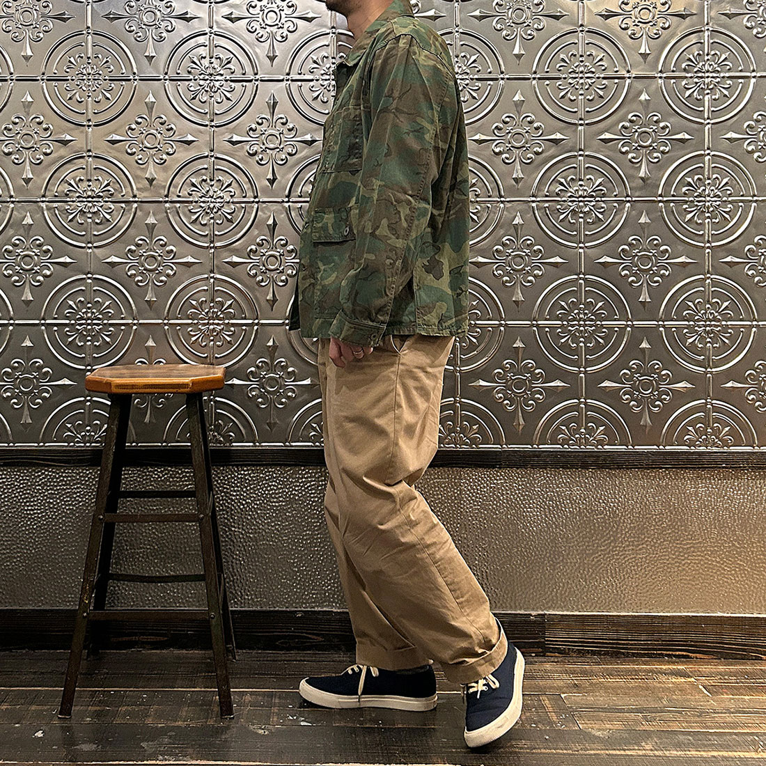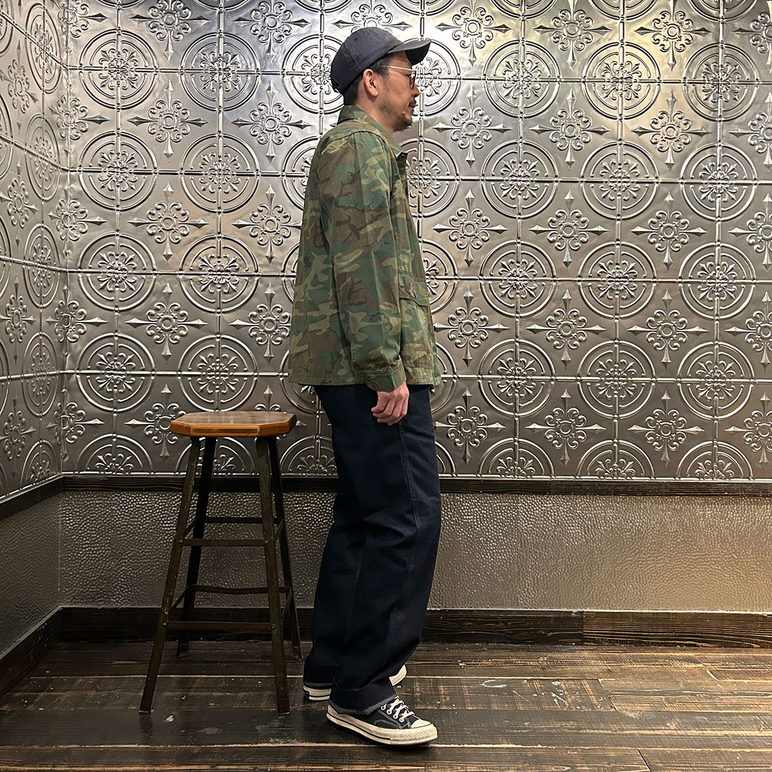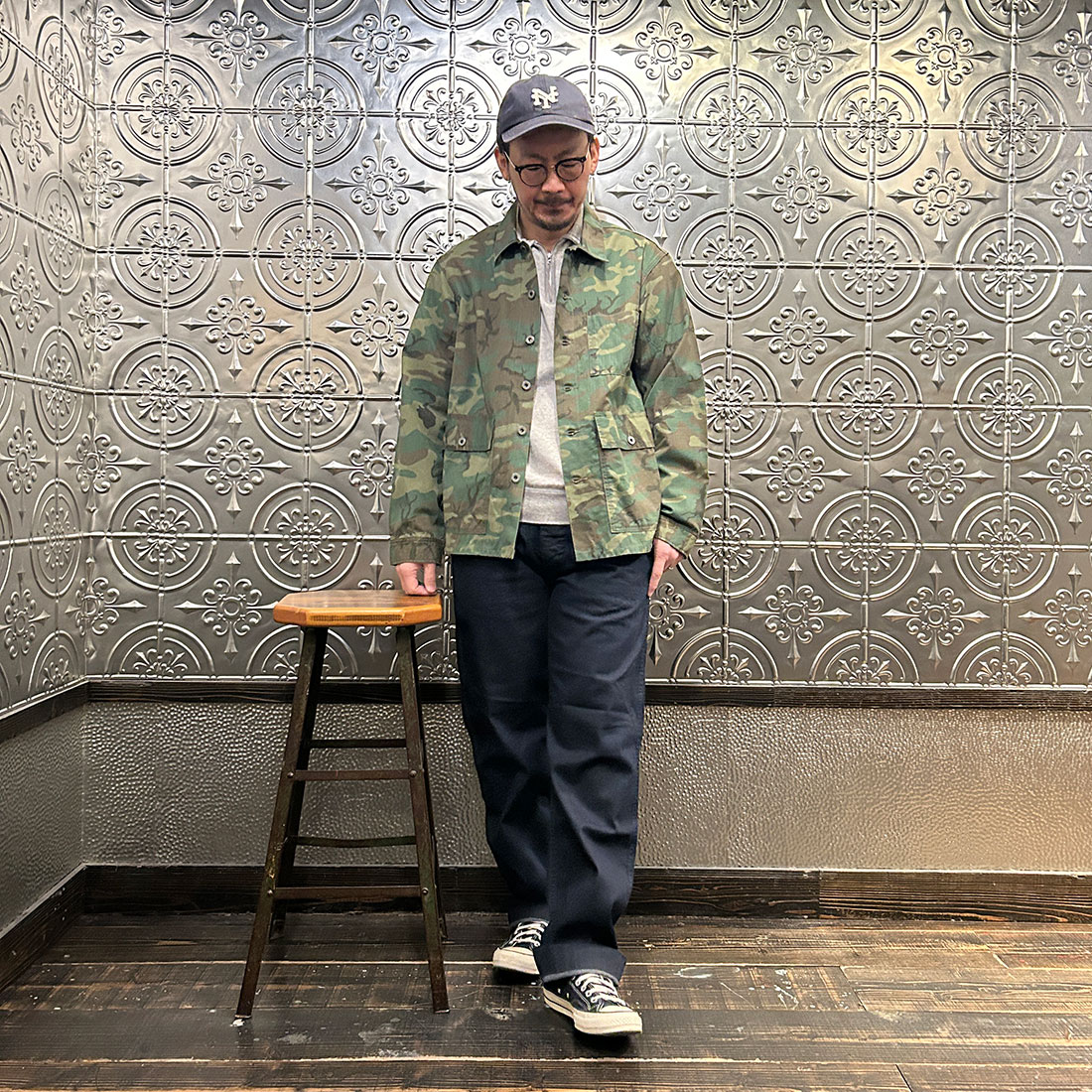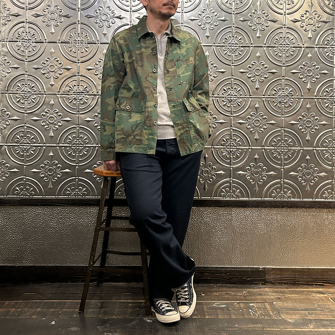 土臭さのあるカモフラ柄のシャツジャケットをトラッドな感じに。