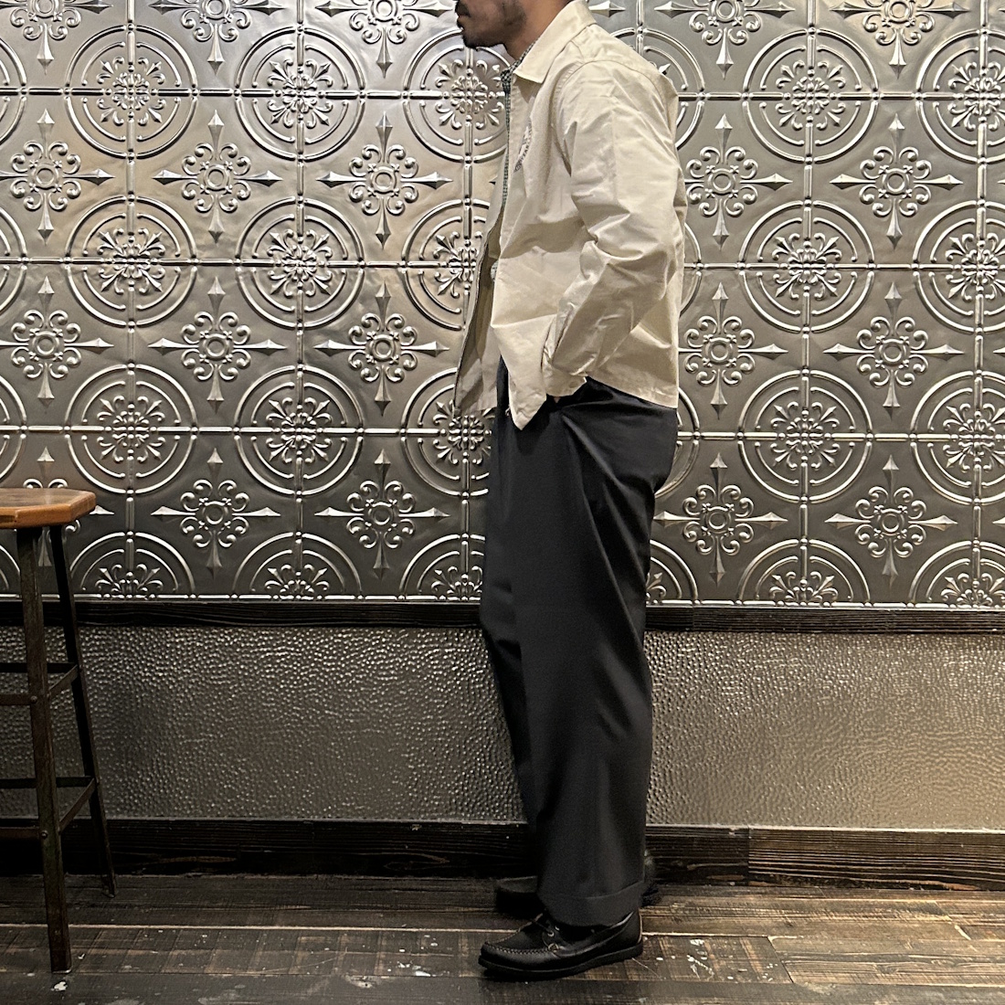 逆にトロピカルウールのトラウザーような小綺麗なパンツで合わせてみると。
