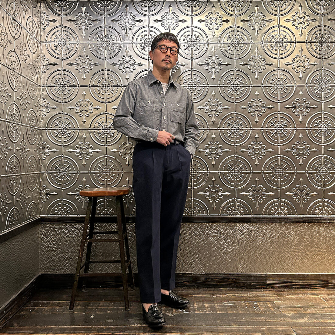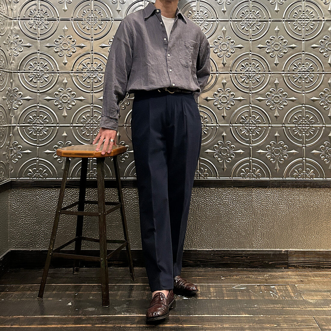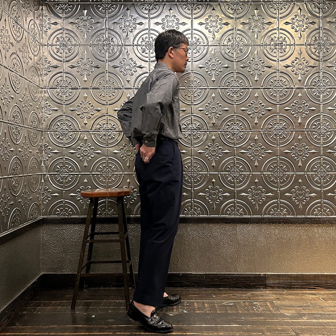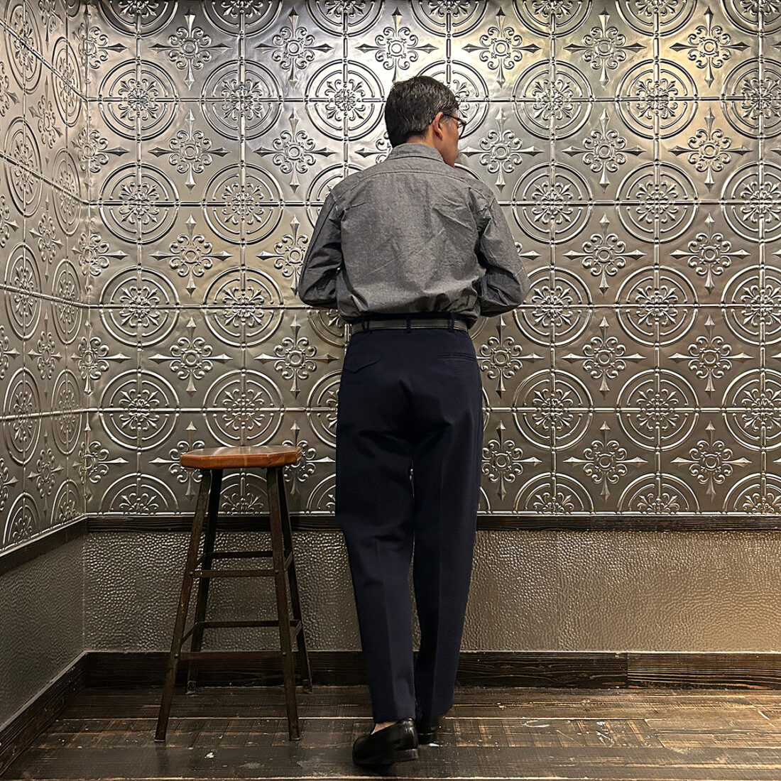 かと言えば、簡素なディテールとズドーンとしたシルエットで直線的な近年のアメリカンなスラックスでもなく。うまーくそれぞれの良いところをミックスしたシルエットや雰囲気を目指しました。