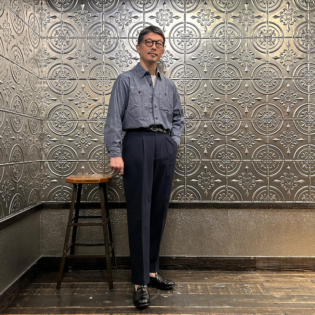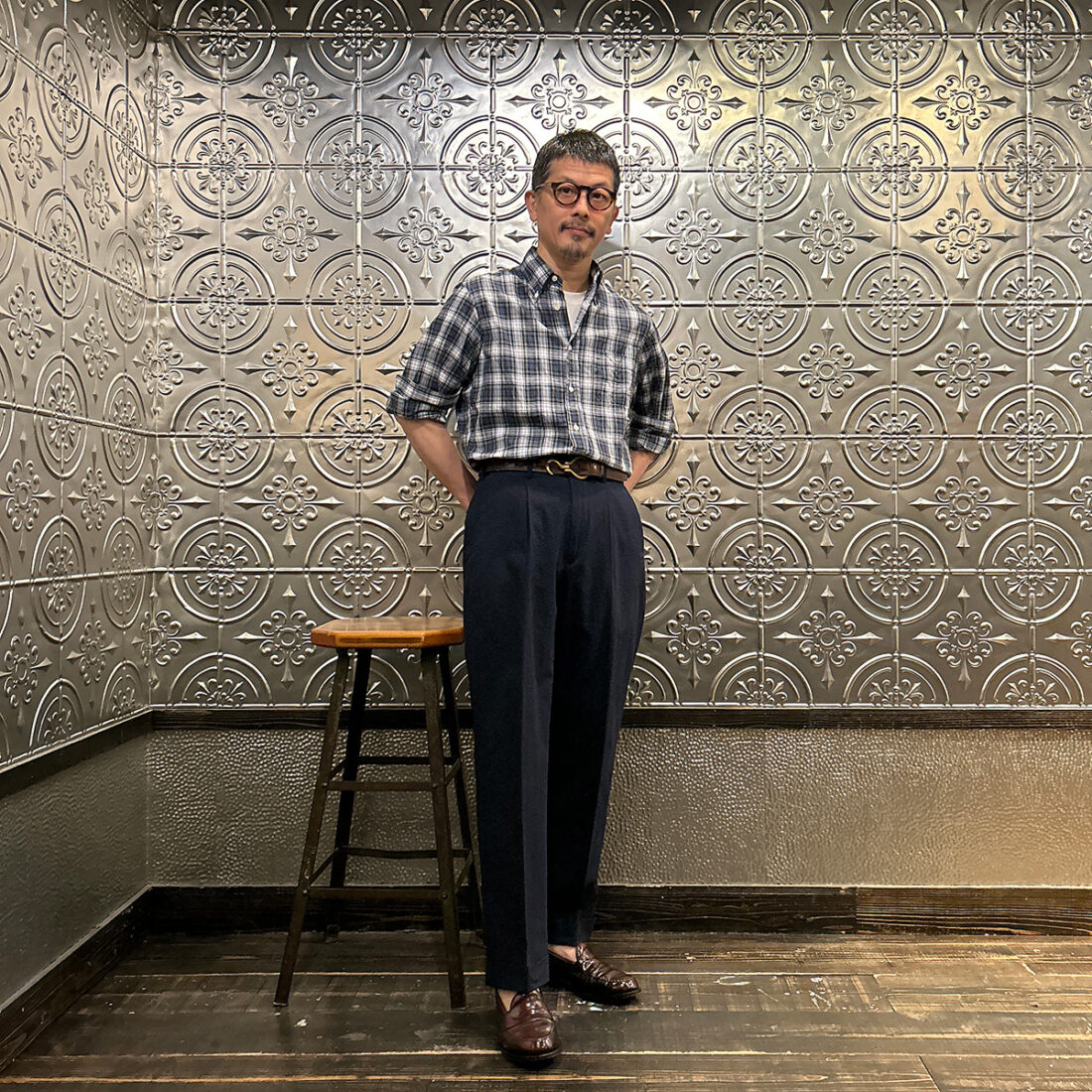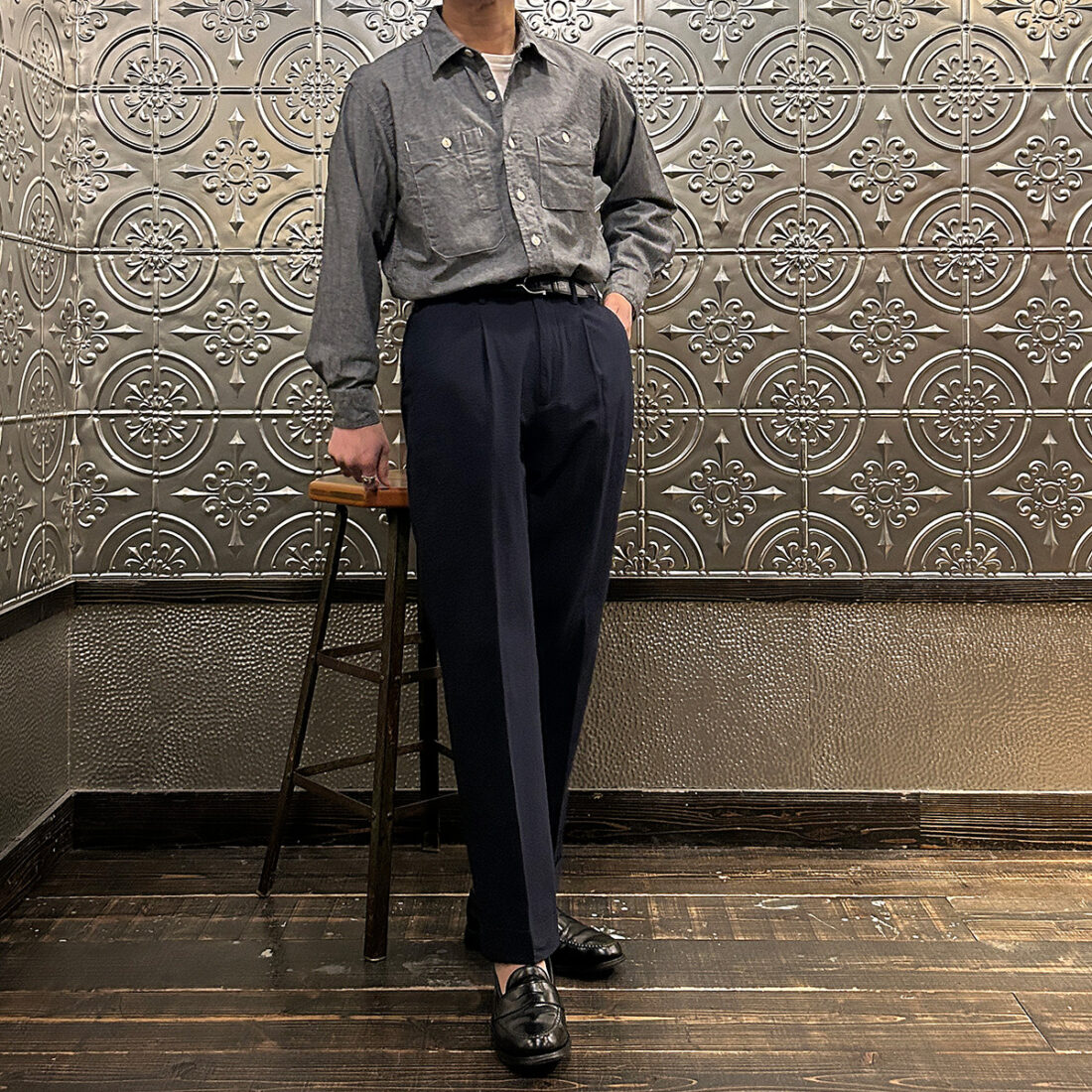 かと言えば、簡素なディテールとズドーンとしたシルエットで直線的な近年のアメリカンなスラックスでもなく。うまーくそれぞれの良いところをミックスしたシルエットや雰囲気を目指しました。