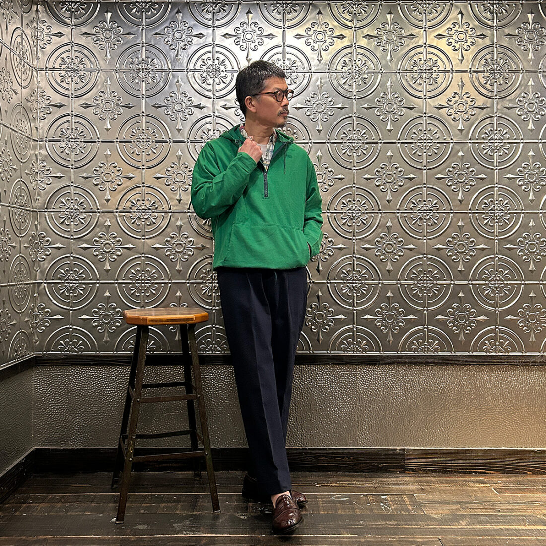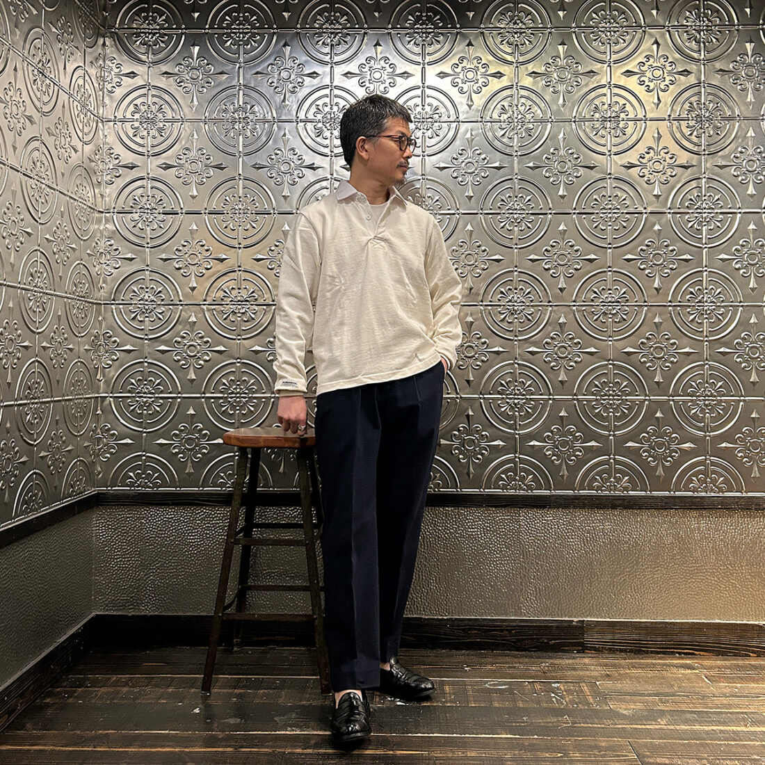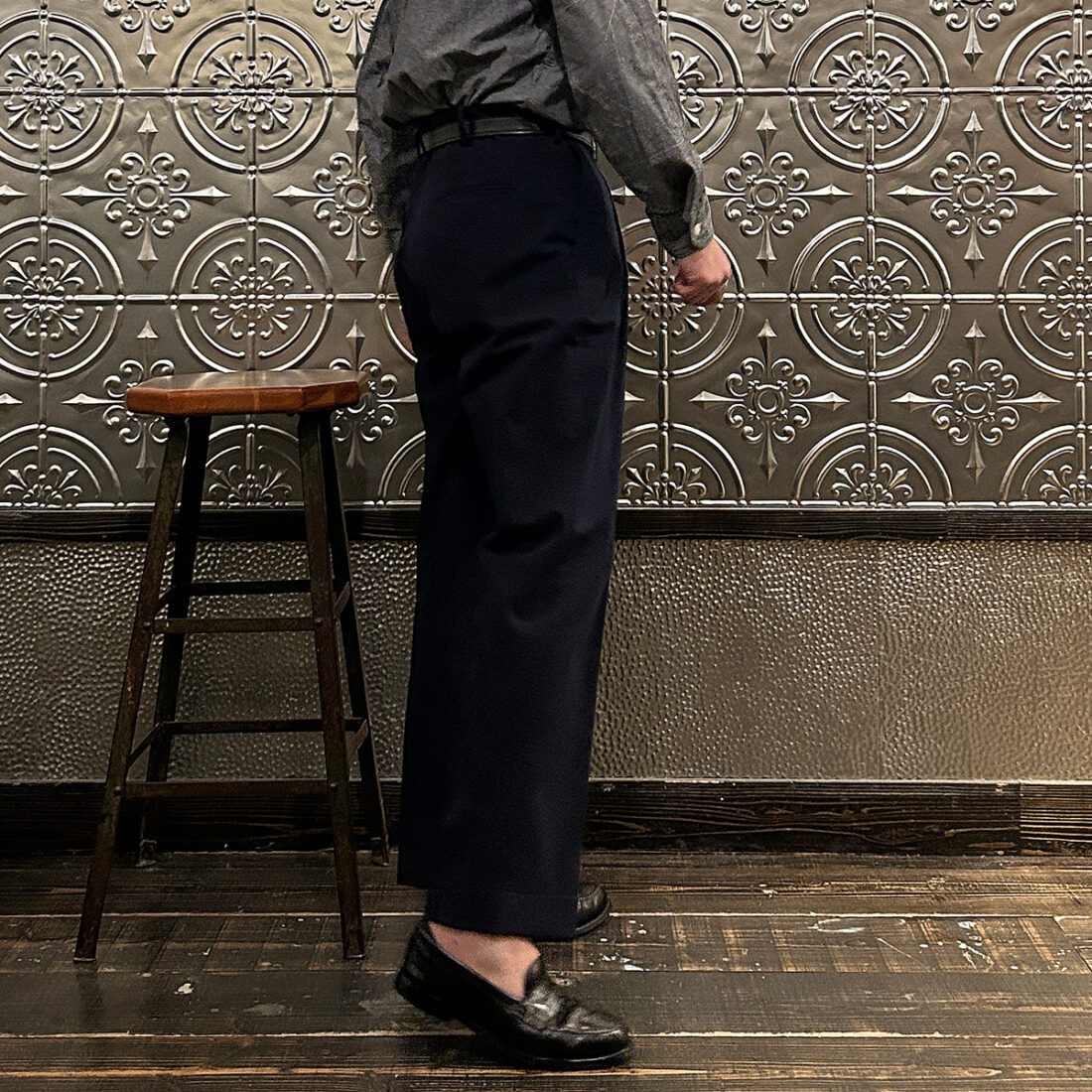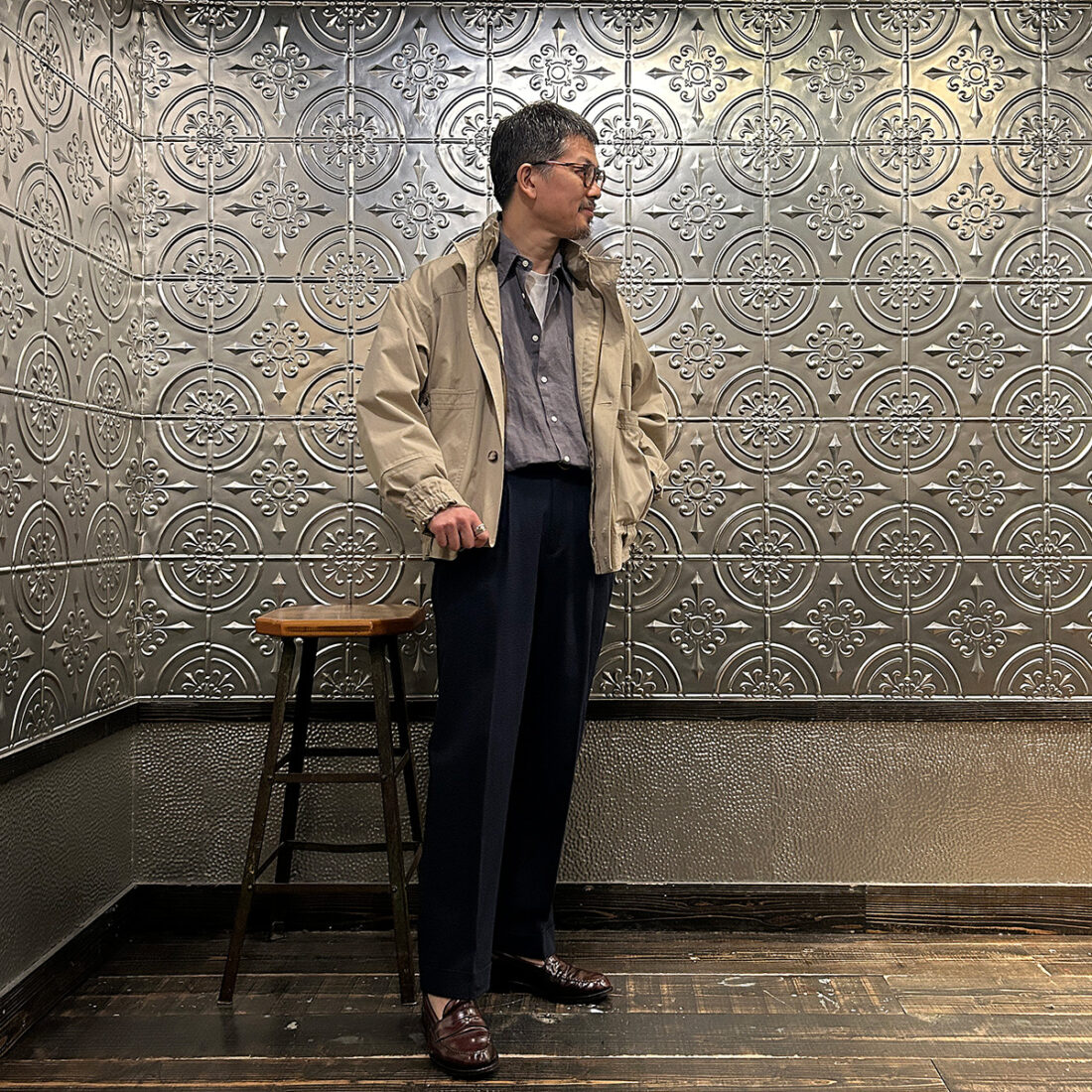 かと言えば、簡素なディテールとズドーンとしたシルエットで直線的な近年のアメリカンなスラックスでもなく。うまーくそれぞれの良いところをミックスしたシルエットや雰囲気を目指しました。