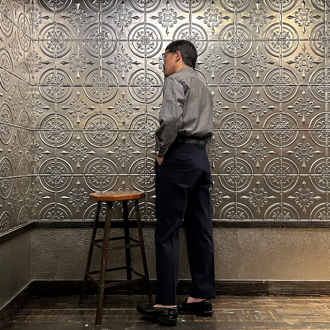 このパンツを作るにあたって目指したものはジャケパンで仕事でも使えて、休みの日はTシャツやスウェットにスニーカーやサンダルでもカッコよく穿けるトラウザーズ(スラックス)。イタリアブランドが作るようなスタイリッシュで艶っぽい感じではなく、イギリスのテーラー文化から派生したいかにもドレスでフォーマルなカタイ印象でもなく。
