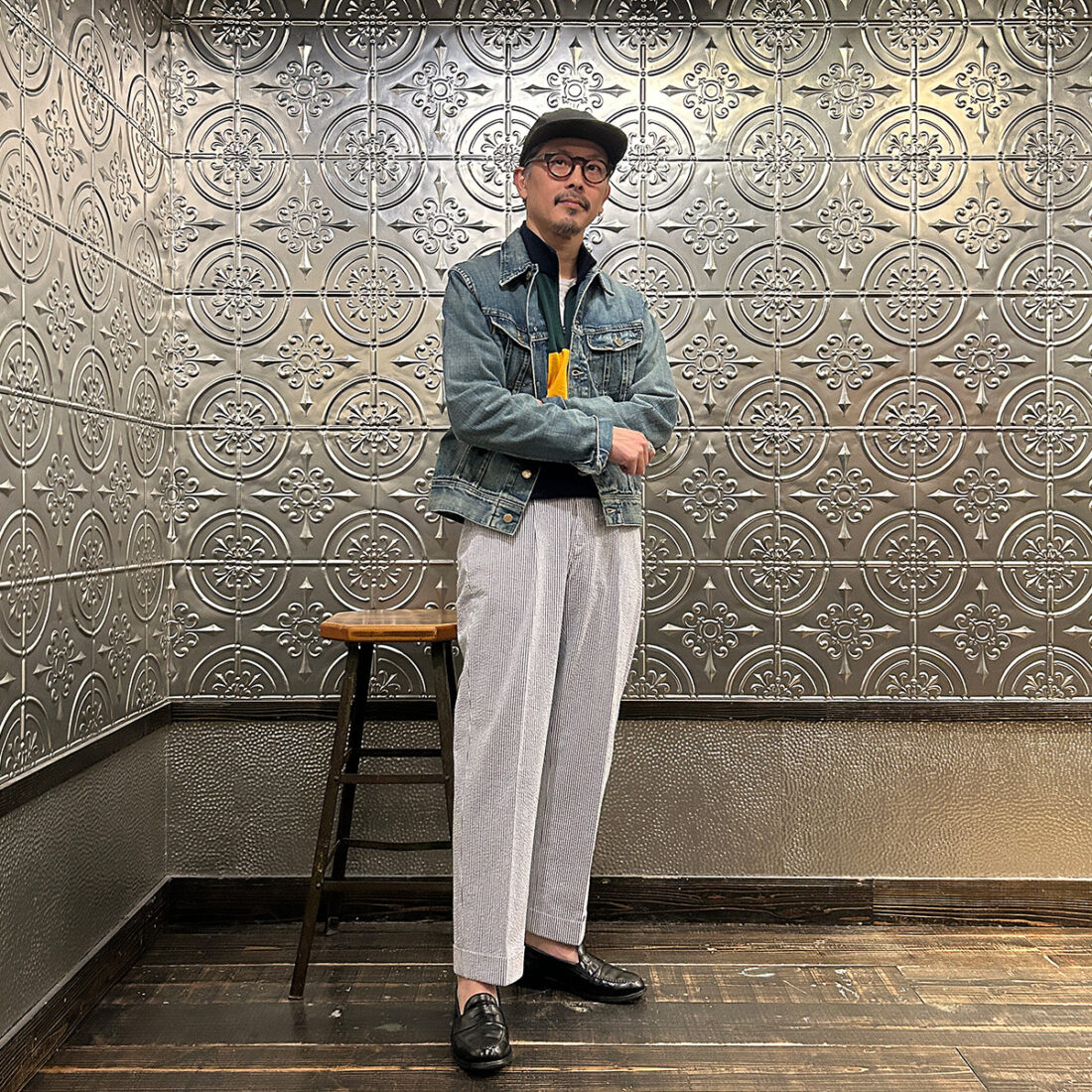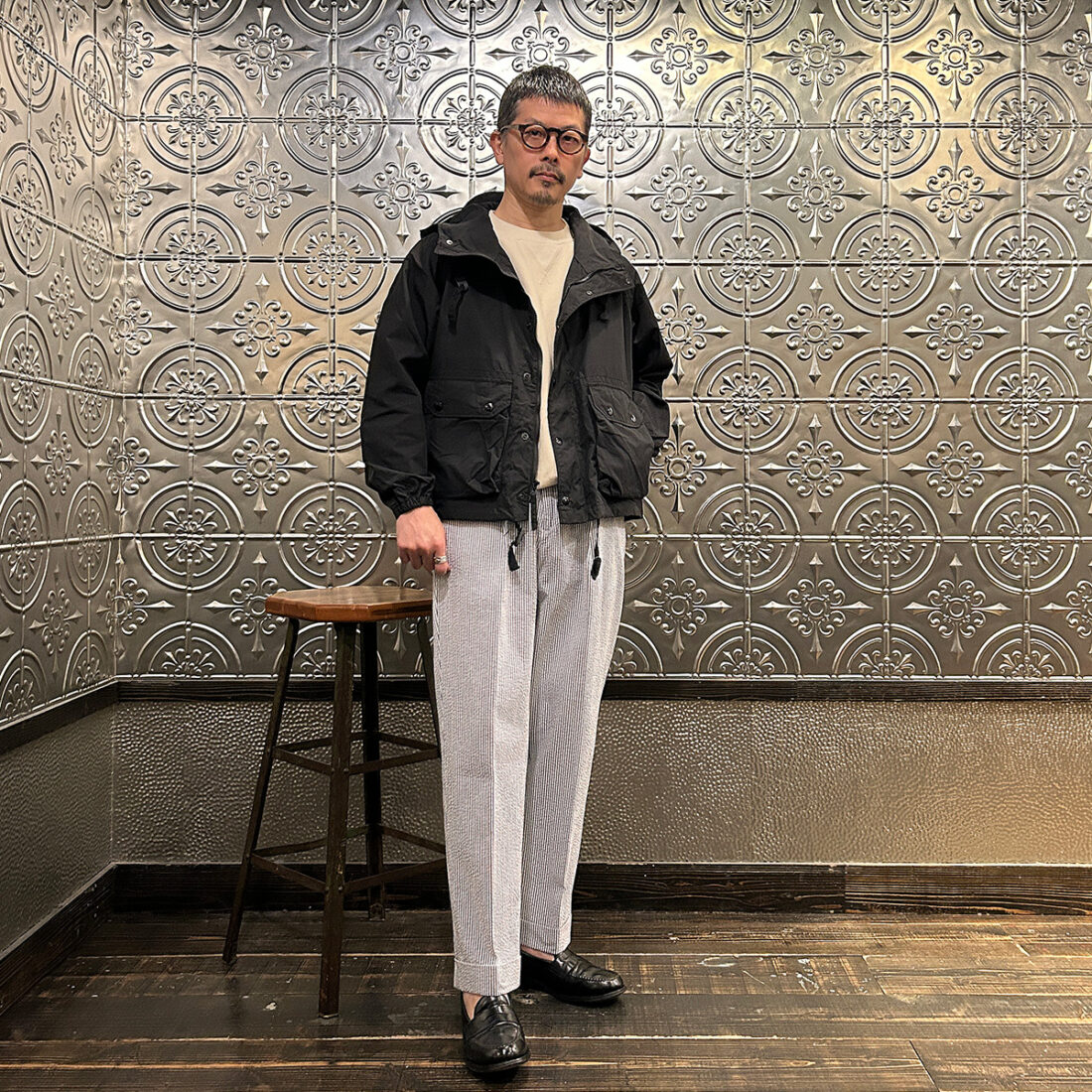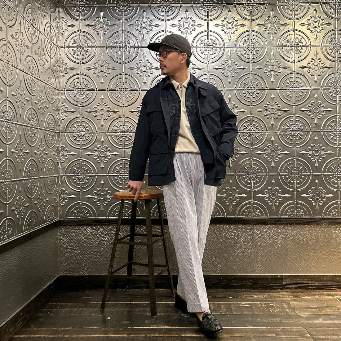 パンツが春夏向けの軽めの生地なので、あまりヘビー過ぎるアウターを合わせるとそのボリュームに耐え切れません。そこだけお気を付けください。