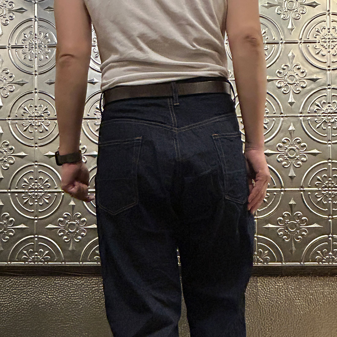 176cmの74kgで下半身はややがっちりしており、お尻周りと太腿はやや太めの体型。リラックスフィットジーンズは全体にゆったりとしたつくりなのでSサイズがちょど良いサイズになります。ウエストは程よいゆとりがありストレスなく着用できます。ワンウォッシュなので生地がちょっと固くなっているので馴染んで柔らかくなればより穿き易くなります。