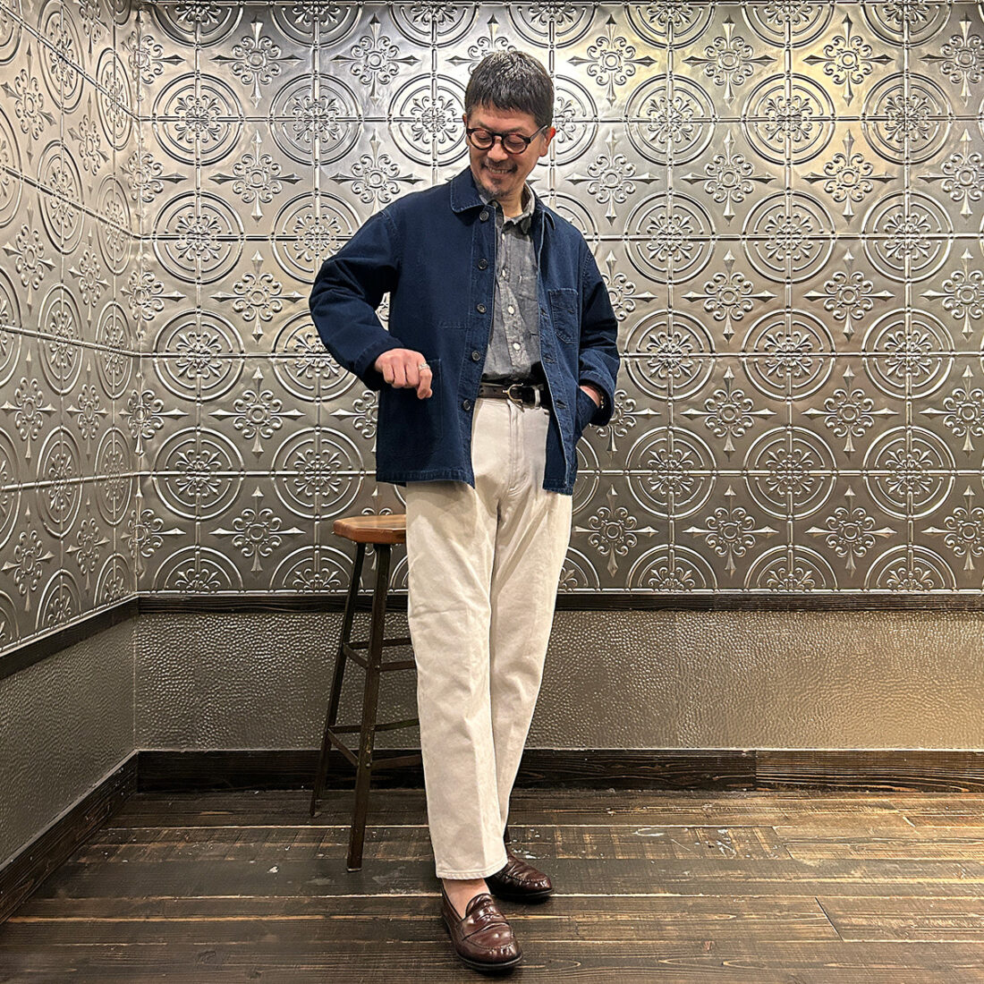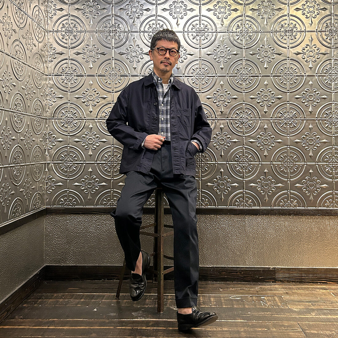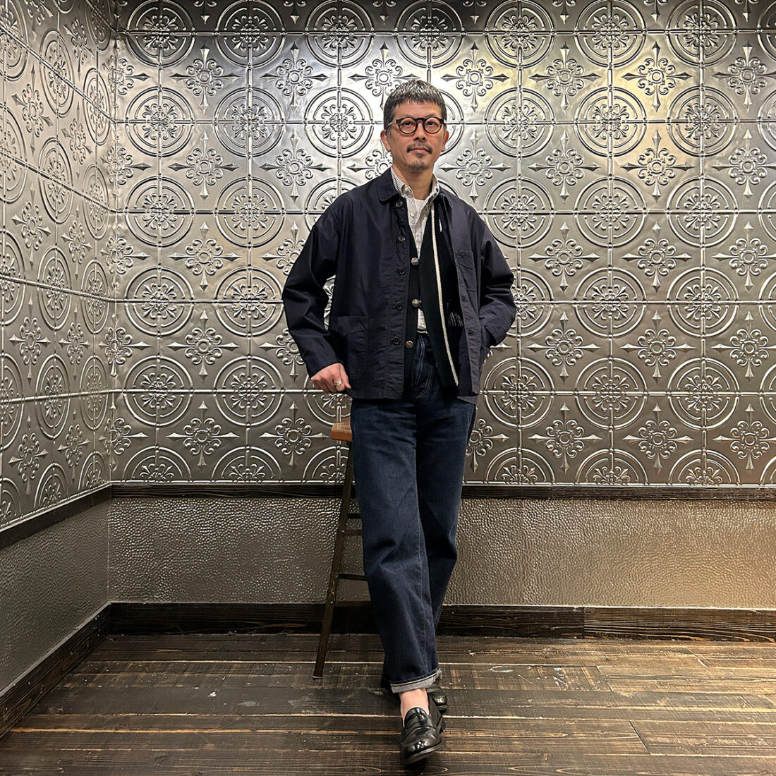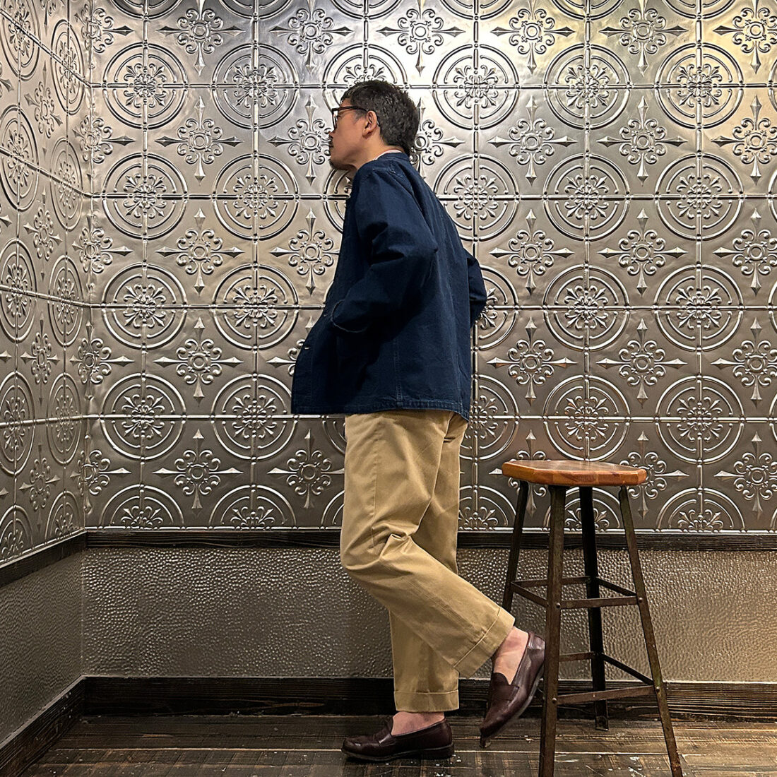 フレンチのワークジャケット、フレンチチャイナジャケットのディテールをミックスした一枚。