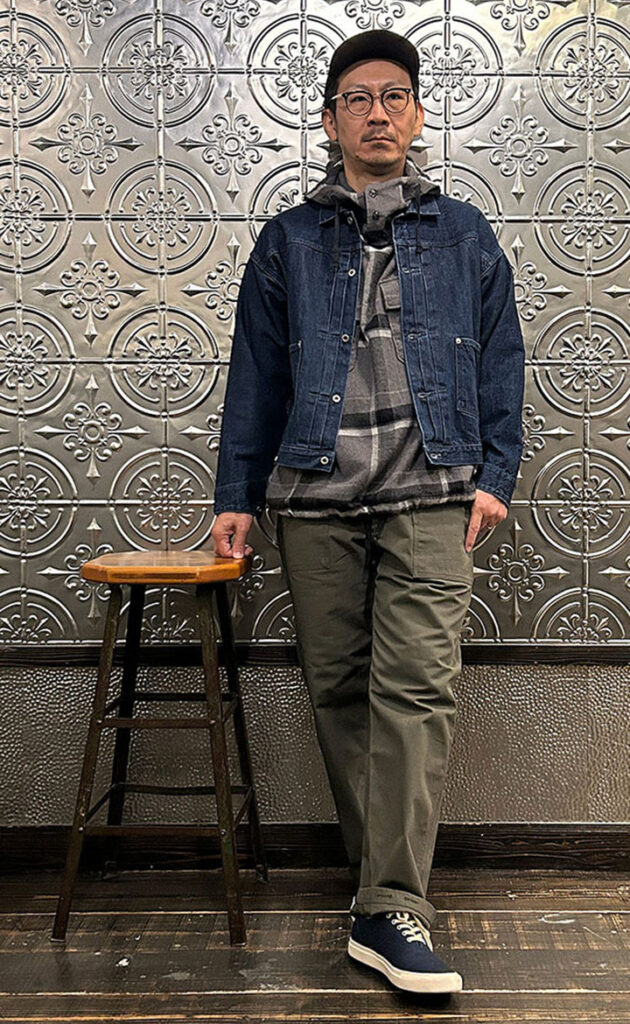 シュート丈のGジャンに着丈長めのカグールシャツの裾のバランスが良い感じ。