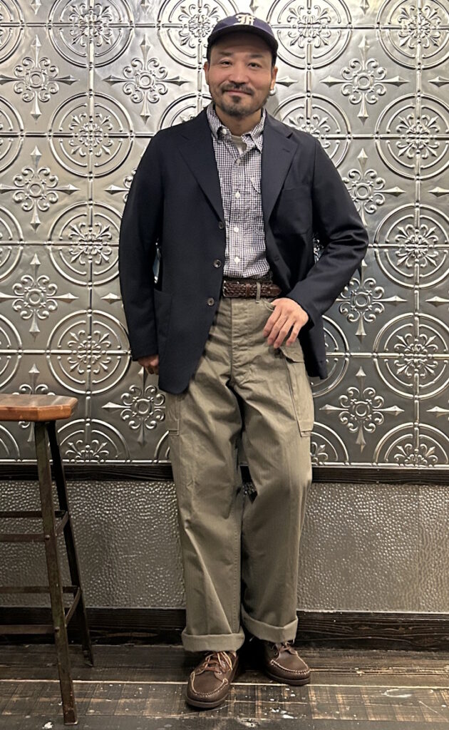 パンツは太くてズドーンとしたシルエットが特徴のややコシのきいたコットンヘリンボーン柄の軍パン。