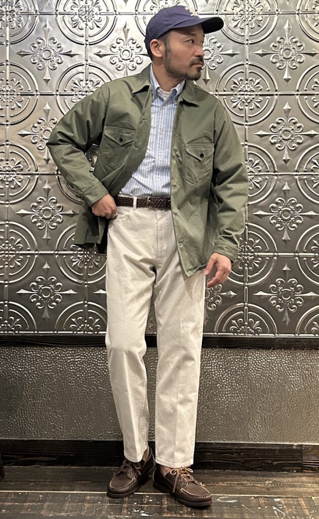経年変化好きな方にはオススメしたいハイカウントチノクロス素材を採用したオリーブ。