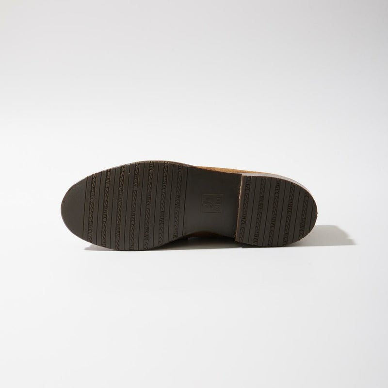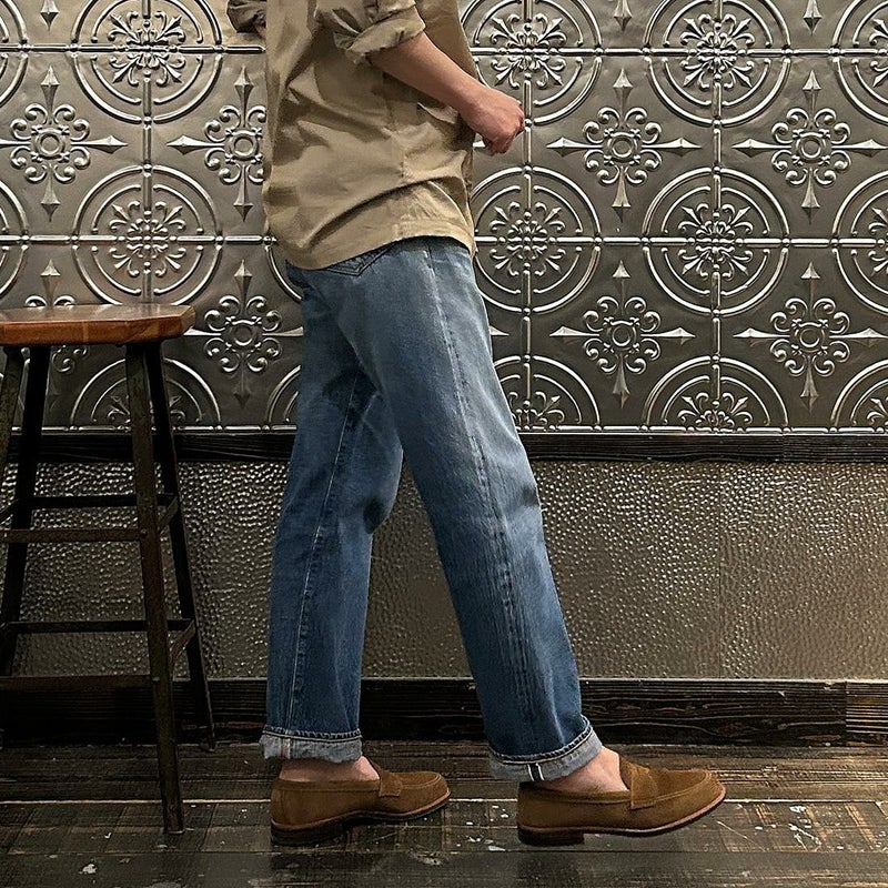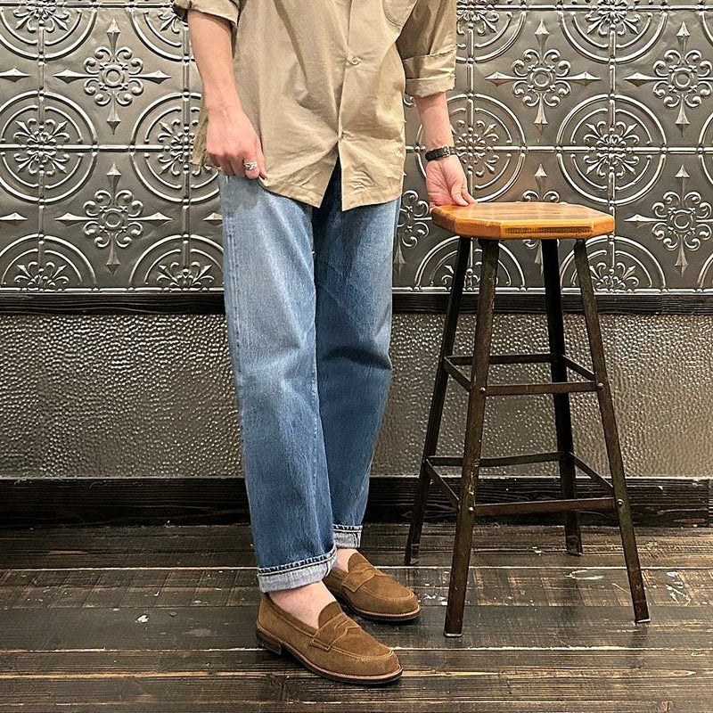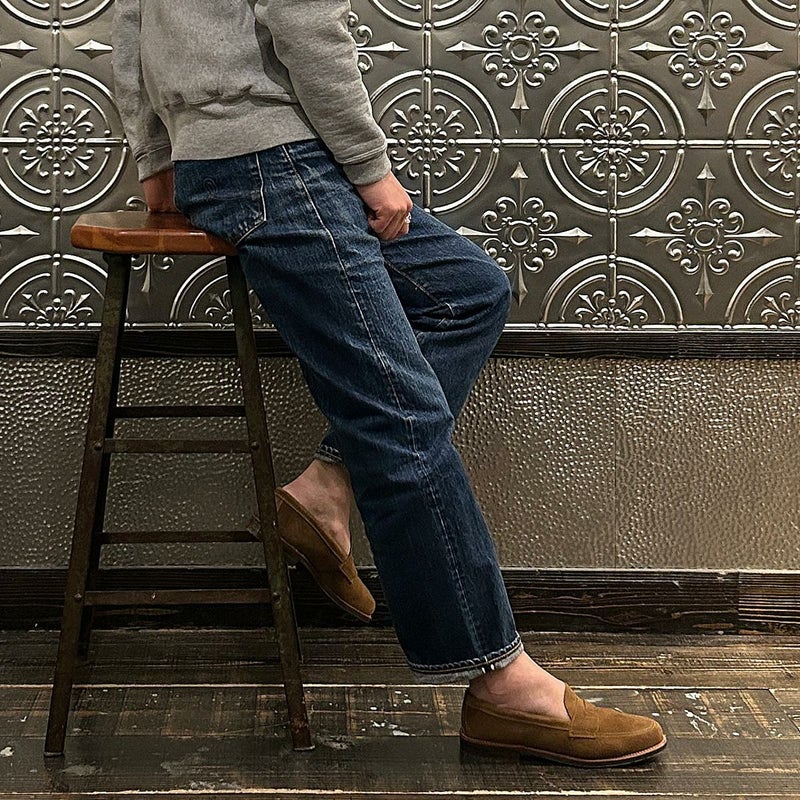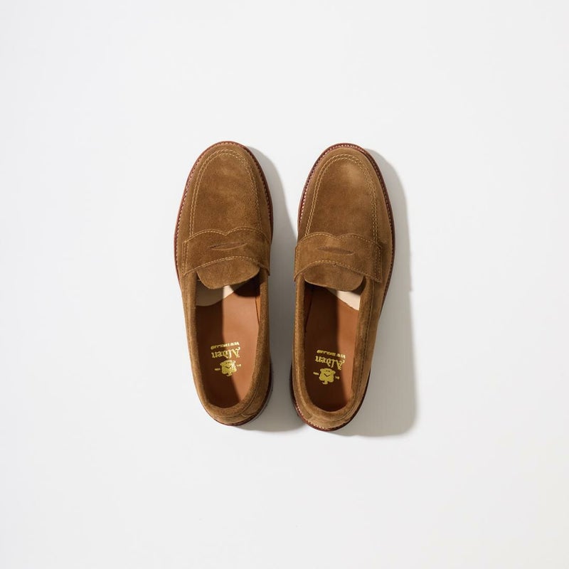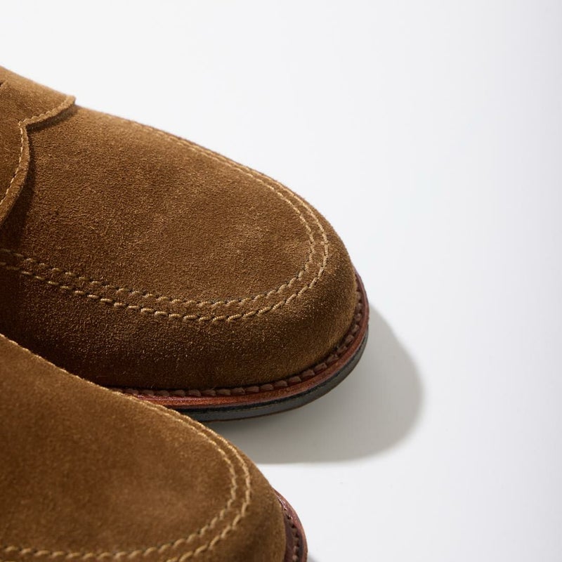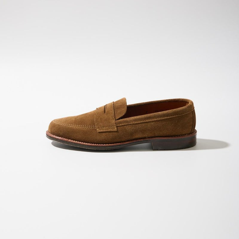 ALDEN(オールデン)のUNLINED PENNY LOAFER SUEDE 。アッパーにスナッフカラーのカーフスエードを使用したペニーローファー。アッパー部分はライニングなしの一枚革(アンラインド)仕様。ソールは極薄ラバーの「Leisure Ⅲ」を採用。オールデンらしい履き心地は損なわず、見た目もスタイリッシュなラバーソール。木型はローファーの木型として用いられる事が多いヴァン(バン)ラスト。スエードにアンラインドの組み合わせは柔らかで極上の履き心地。モカ縫いはハンドステッチではなくミシンでのマシンステッチ仕様。カジュアルにデイリーに履きやすいスエードローファー。【Spring Leather Shoes】